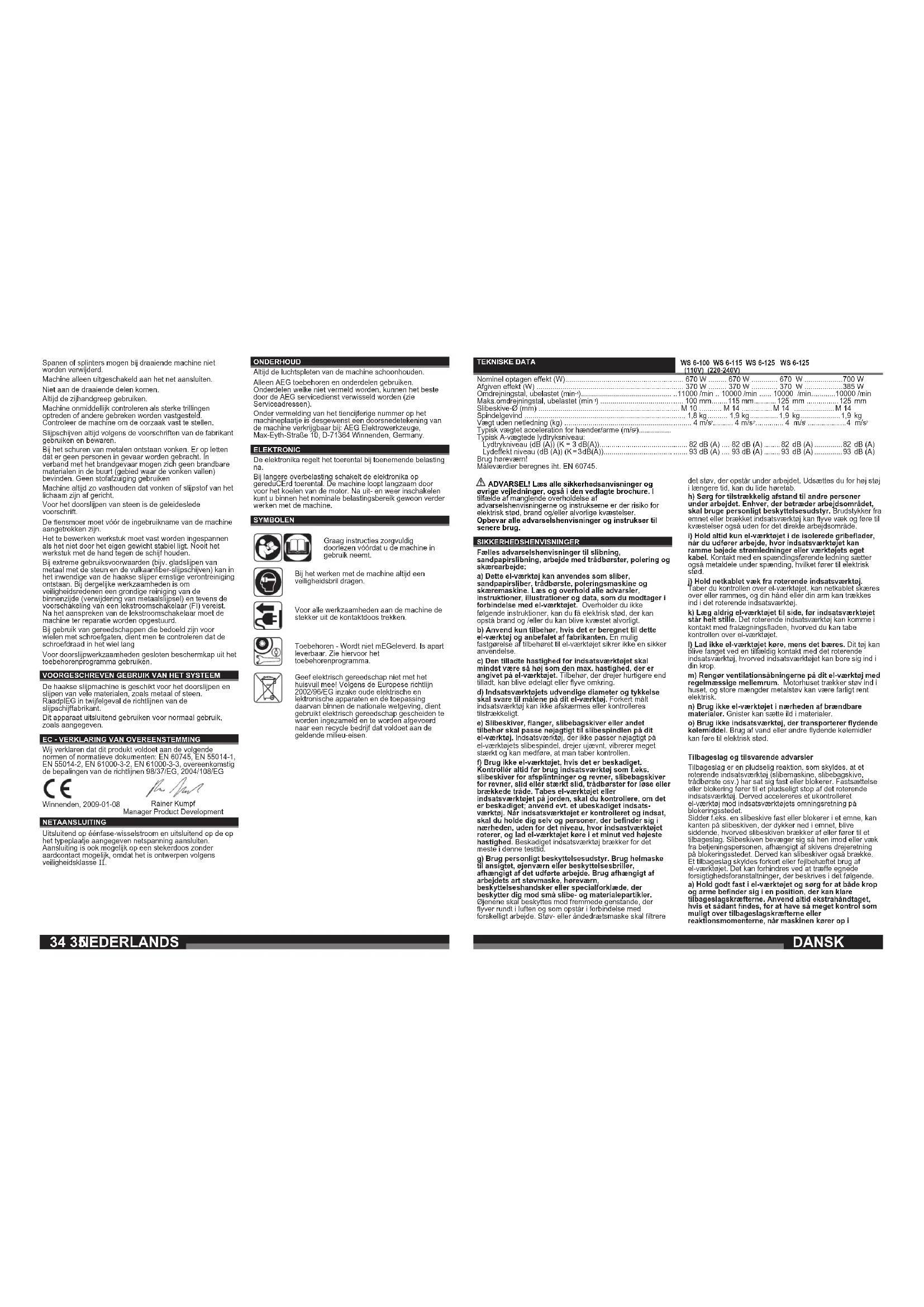 Vinkelsliberen kan anvendes ved skæring i og slibning af mange materialer, som f.eks. metal eller sten. Ved tvivlstilfælde respekter produ-centens henvisninger af slibeværktøj. Produktet må ikke anvendes på anden måde og til andre formål end foreskrevet. Produktet må ikke anvendes på anden måde og til andre formål end foreskrevet. CE-KONFORMITETSERKLÆRING Vi erklærer under almindeligt ansvar, at dette produkt er i overensstemmelse med følgende normer eller norma-tive dokumenter. EN 60745, EN 55014-1, EN 55014-2, EN 61000-3-2, EN 61000-3-3, i henhold til bestemmelserne i direktiverne 98/37/EF, 2004/108/EF Rainer Kumpf Manager Product Development Winnenden, 2009-01-08 NETTILSLUTNING Tilslutning må kun foretages til enfaset vekselstrøm og kun til en netspænding, som er i overensstemmelse med angivelsen på mærkepladen. Tilslutning kan også ske til stikdåser uden beskyttelseskontakt, da kapslingsklasse II foreligger. VEDLIGEHOLDELSE Hold altid maskinens ventilationsåbninger rene. Brug kun AEG tilbehør og reservedele. Lad de komponenter, hvis udskiftning ikke er blevet beskrevet, udskifte hos AEG service (brochure garanti/bemærk kundeserviceadresser). Ved opgivelse af type nr. der er angivet på maskinens effektskilt, kan De rekvirere en reservedelstegning, ved henvendelse til: AEG Elektrowerkzeuge, Max-Eyth-Straße 10, D-71364 Winnenden, Germanyj. SYMBOLER Læs brugsanvisningen nøje før ibrugtagning. Når der arbejdes med maskinen, skal man have beskyttelsesbriller på. Før ethvert arbejde ved maskinen skal stikket tages ud af stikdåsen. Tilbehør - Ikke inkluderet i leveringsomfanget, kab købes som tilbehør. Elværktøj må ikke bortskaffes som almindeligt affald! I henhold til det europæiske direktiv 2002/96/EF om bortskaffelse af elektriske og elektroniske produkter og gældende national lovgivning skal brugt lværktøj indsamles separat og bortskaffes på en måde, der skåner miljøet mest muligt. DANSK38 39 WS 6-100 WS 6-115 WS 6-125 WS 6-125 (110V) (220-240V) ..... 670 W ......... 670 W ............. 670 W ...................700 W ..... 370 W ......... 370 W ............. 370 W ...................385 W ..11000 /min .. 10000 /min ...... 10000 /min ............10000 /min ..... 100 mm ........115 mm ........... 125 mm ................125 mm ... M 10 ........... M 14 ............... M 14 ....................M 14 ...... 1,8 kg .......... 1,9 kg .............. 1,9 kg ....................1,9 kg ......... 4 m/s