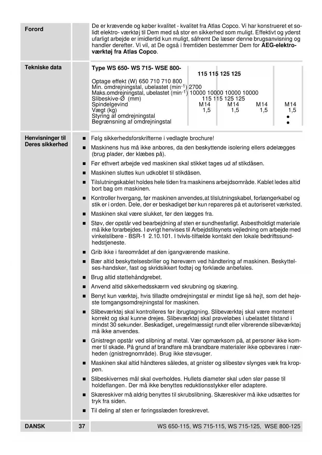 - DANSK 38 WS 650-115, WS 715-115, WS 715-125, WSE 800-125 ■ Flangemøtrikken skal spændes inden maskinen tages i brug. ■ Ved ekstrem belastning, f.eks. ved glatslibning af metaller med gummibagskive og fibersliberondeller, kan der opstå en stærk tilsmudsning af vinkelsliberens indre de- le. I disse tilfælde anbefales punktudsugning, hyppig rengøring af maskinen, samt tilkobling spændingstalrelæ foran maskinen. Støjmåle- værdier Værktøjets A-vægtede lydtrykniveau er typisk: Lydtrikniveau = 85 dB (A). Lydeffekt niveau = 98 dB (A). Høreværn skal anvendes! Vibrations- måleværdier Det vægtede accelerationsniveau 5 m/s
