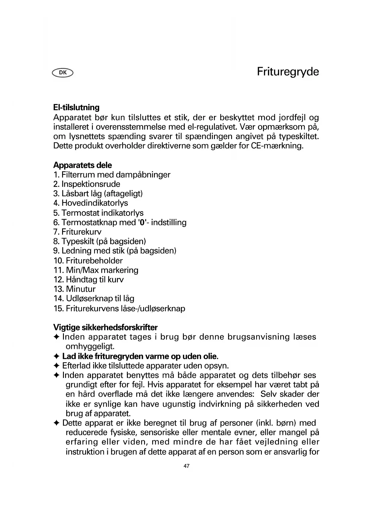 Vigtige sikkerhedsforskrifter ✦ Inden apparatet tages i brug bør denne brugsanvisning læses omhyggeligt. ✦ Lad ikke frituregryden varme op uden olie. ✦ Efterlad ikke tilsluttede apparater uden opsyn. ✦ Inden apparatet benyttes må både apparatet og dets tilbehør ses grundigt efter for fejl. Hvis apparatet for eksempel har været tabt på en hård overflade må det ikke længere anvendes: Selv skader der ikke er synlige kan have ugunstig indvirkning på sikkerheden ved brug af apparatet. ✦ Dette apparat er ikke beregnet til brug af personer (inkl. børn) med reducerede fysiske, sensoriske eller mentale evner, eller mangel på erfaring eller viden, med mindre de har fået vejledning eller instruktion i brugen af dette apparat af en person som er ansvarlig for