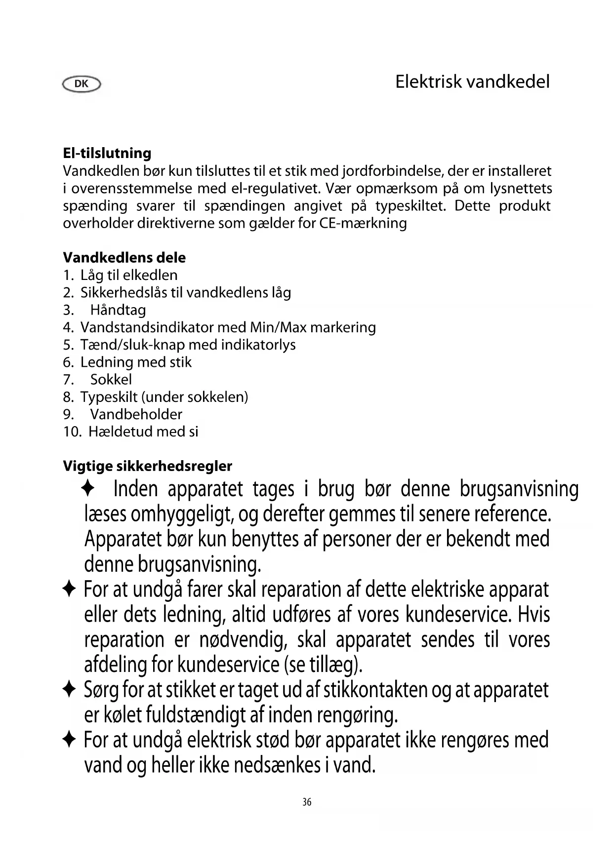 Vigtige sikkerhedsregler ✦ Inden apparatet tages i brug bør denne brugsanvisning læses omhyggeligt, og derefter gemmes til senere reference. Apparatet bør kun benyttes af personer der er bekendt med denne brugsanvisning. ✦ For at undgå farer skal reparation af dette elektriske apparat eller dets ledning, altid udføres af vores kundeservice. Hvis reparation er nødvendig, skal apparatet sendes til vores afdeling for kundeservice (se tillæg). ✦ Sørg for at stikket er taget ud af stikkontakten og at apparatet er kølet fuldstændigt af inden rengøring. ✦ For at undgå elektrisk stød bør apparatet ikke rengøres med vand og heller ikke nedsænkes i vand. DK37 ✦ Dette apparat kan benyttes af børn (som er mindst 8 år) og af personer med reducerede fysiske, sensoriske eller mentale evner, eller mangel på erfaring eller viden, såfremt de har fået vejledning og instruktion i brugen af dette apparat og fuldt ud forstår alle farer og forholdsregler vedrørende sikkerheden som brug af apparatet medfører. ✦ Børn må aldrig få lov til at lege med apparatet. ✦ Børn må aldrig få lov til at udføre nogen former for rengøring eller vedligehold af dette apparat medmindre de er under opsyn. ✦ Apparatet og dets ledning må altid holdes væk fra børn som er yngre en 8 år. ✦ Dette apparat er beregnet til privat brug eller i tilsvarende omgivelser, såsom - kontorer eller andre mindre virksomheder, - landbrugsvirksomheder, - af kunder på hoteller, moteller m.m. og tilsvarende foretagender, - B&B pensionater. ✦ Efterlad ikke vandkedlen uden opsyn når den er tændt. Brug kun rent vand og sørg for altid at overholde minimum/ maksimum markeringerne for vandstand, når der fyldes vand på kedlen. Overfyldning af vandbeholderen kan forårsage fare fra kogende vand der koger over. ✦ Vær også opmærksom på risikoen for skoldning fra den varme damp, der bliver afgivet fra kedlen. Rør derfor aldrig ved andre af vandkedlens dele end håndtaget når kedlen benyttes.38 ✦ Advarsel! Låget må altid være lukket, både under opvarmningen og når der hældes varmt vand fra kedlen. ✦ Kedlen må kun anvendes med den medfølgende sokkel. ✦ Fjern aldrig vandkedlen fra sokkelen (eller påsæt den igen) mens apparatet er tændt. ✦ Advarsel: Hold børn væk fra emballeringen, da denne udgør en mulig risiko for tilskadekomst, ved f.eks. kvælning. ✦ Inden apparatet benyttes må både apparatet og dets tilbehør ses grundigt efter for fejl. Hvis apparatet for eksempel har været tabt på en hård over ade eller der er blevet trukket i ledningen med stor kraft, må det ikke længere benyttes: Selv skader der ikke er synlige kan have ugunstig indvirkning på sikkerheden ved brug af apparatet. ✦ Brug kun kedlen på en varmefast plan over ade. ✦ Benyt aldrig apparatet under et overskab eller en tilsvarende genstand; der er risiko for at dampudslip kan samle sig under sådanne. ✦ Kabinettets ydre ader bliver varme under brug og forbliver varme et godt stykke tid bagefter. ✦ Lad ikke kabinettet eller ledningen komme i kontakt med åben ild eller med varme over ader såsom kogeplader. ✦ Lad aldrig ledningen hænge frit ud over bordkanten, og sørg for at ledningen ikke kommer i berøring med kabinettets varme dele. ✦ Tag altid stikket ud af stikkontakten - efter brug, - i tilfælde af fejlfunktion, - inden rengøring af apparatet. ✦ Vi påtager os intet ansvar for skader, der skyldes misbrug eller manglende overholdelse af denne brugsanvisning. Overhedningssikring Den indbyggede termosikring beskytter varmeelementet mod overophedning hvis apparatet fejlagtigt skulle blive tændt uden vand i, eller hvis varmeelementet er kalket til. Såfremt sikringen har afbrudt kedlen, må den have tid til at køle tilstrækkeligt af, eller afkalkes inden der tændes for den igen. Før brug For at sikre at kedlen er fuldstændig ren, bør det første hold vand koges og kasseres.39 Kogning af vand ✦ Fjern aldrig vandkedlen fra sokkelen (eller påsæt den igen) mens apparatet er tændt. ✦ Tag vandbeholderen af sokkelen. ✦ Udløs og åbn låget og fyld vandkedlen til det ønskede niveau, under hensyntagen til minimum og maksimum markeringerne. ✦ Vær omhyggelig med ikke at tænde for vandkedlen førend låget er lukket og kedlen er placeret på sokkelen. ✦ Indsæt stikket i en passende stikkontakt og tryk ned på tænd/sluk- knappen. Indikatorlyset vil tænde. ✦ Kogeprocessen starter. Apparatet vil automatisk slukke når kogepunktet er nået på grund af den indbyggede dampføler. Indikatorlyset slukker. ✦ Hvis man ønsker at afbryde kogeprocessen må tænd/sluk-knappen sættes hen på positionen ”O ”. ✦ Når det kogende vand skal hældes fra, tages vandbeholderen af sokkelen. ✦ Sørg for at låget forbliver lukket mens vandet hældes fra kedlen, derved undgår man at kedlen afgiver kogende damp. ✦ Tag stikket ud af stikkontakten efter brug. ✦ Lad aldrig overskydende vand stå tilovers i vandbeholderen. Afkalkning ✦ Afhængigt af vandkvaliteten i området, kan der sætte sig kalka ejringer på varmeelementet. Det anbefales at erne sådanne a ejringer med jævne mellemrum. Garantien dækker ikke hvis apparatet ikke fungerer som følge af utilstrækkelig afkalkning. ✦ En blanding af 0,5 liter vand og 40 ml eddikesyre er velegnet til afkalkningen. - Hæld afkalkningsopløsningen i. - Tænd for vandkedlen og lad opløsningen nå kogepunktet. - Lad det virke i kedlen endnu et kort stykke tid. - For at rengøre kedlen efter afkalkning, bør den skylles grundigt med rent vand. ✦ Sørg for tilstrækkelig ventilation under afkalkningen og undgå at indånde eddikedampene. ✦ Hæld ikke afkalkningsopløsningen ud i emaljerede vaske.