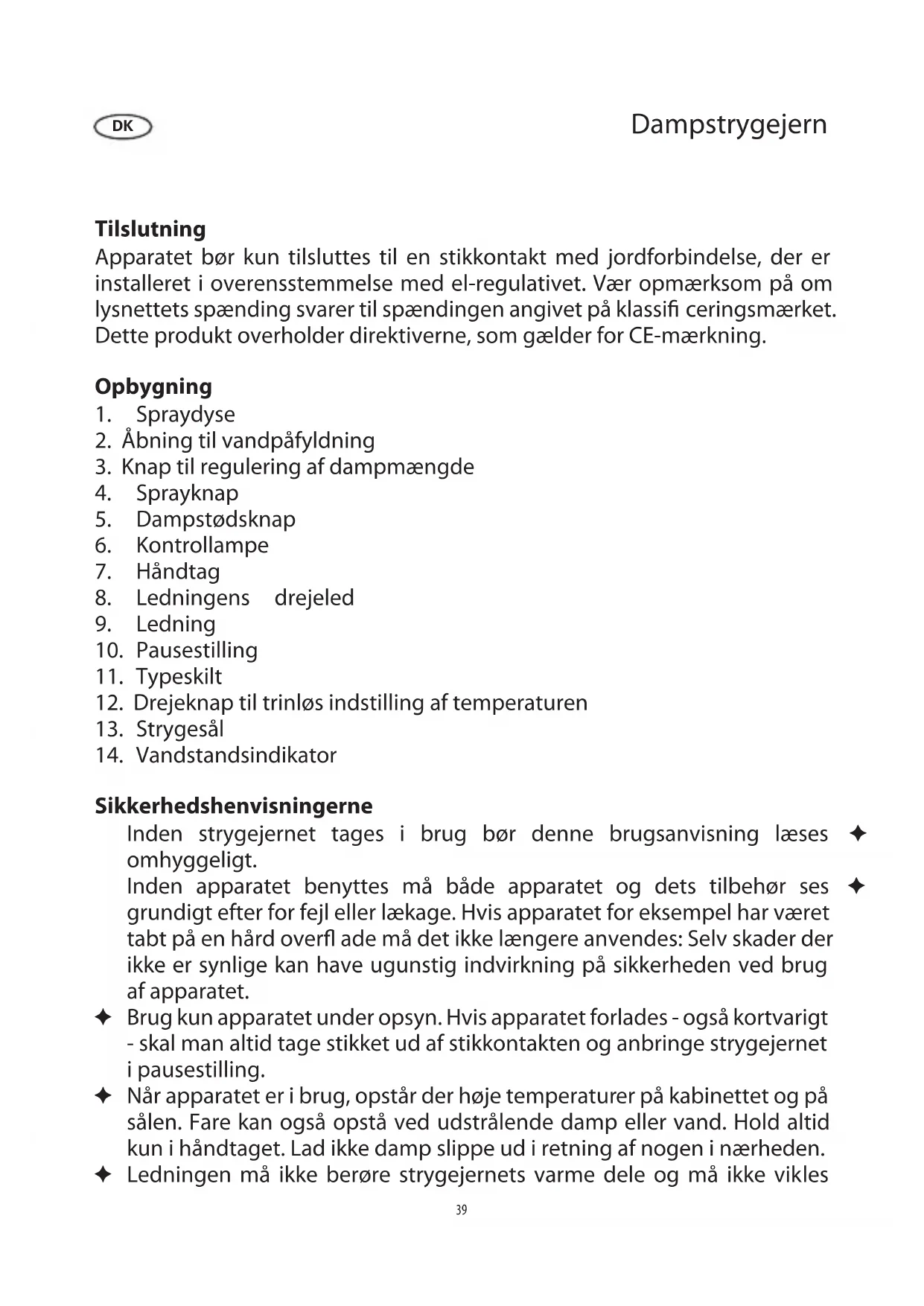 Sikkerhedshenvisningerne Inden strygejernet tages i brug bør denne brugsanvisning læses ✦ omhyggeligt. Inden apparatet benyttes må både apparatet og dets tilbehør ses ✦ grundigt efter for fejl eller lækage. Hvis apparatet for eksempel har været tabt på en hård over ade må det ikke længere anvendes: Selv skader der ikke er synlige kan have ugunstig indvirkning på sikkerheden ved brug af apparatet. Brug kun apparatet under opsyn. Hvis apparatet forlades - også kortvarigt ✦ - skal man altid tage stikket ud af stikkontakten og anbringe strygejernet i pausestilling. Når apparatet er i brug, opstår der høje temperaturer på kabinettet og på ✦ sålen. Fare kan også opstå ved udstrålende damp eller vand. Hold altid kun i håndtaget. Lad ikke damp slippe ud i retning af nogen i nærheden. Ledningen må ikke berøre strygejernets varme dele og må ikke vikles ✦