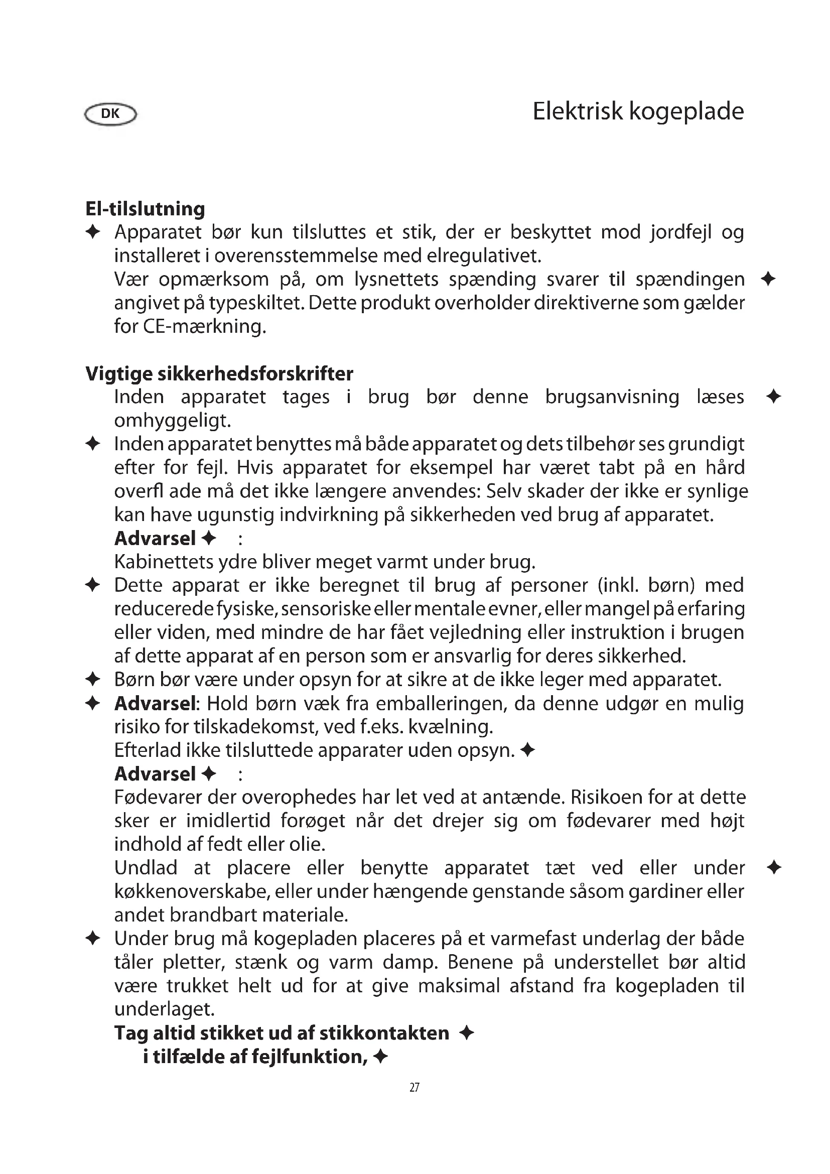 27efter brug, ✦ inden rengøring af apparatet. ✦ Træk aldrig i selve ledningen, når ledningen tages ud af stikkontakten; ✦ tag altid fat i selve stikket. Lad ikke ledningen hænge løst ud over bordkanten. ✦ Hold altid ledningen fra dette eller andre apparater langt væk fra ✦ kogepladens varme dele. Apparatet er ikke beregnet til brug ved hjælp af en ekstern timer eller et ✦ separat ernstyringssystem. Vi påtager os ikke ansvaret for skader, der skyldes misbrug eller manglende ✦ overholdelse af denne brugsanvisning. Dette apparat er kun beregnet til privat brug, og ikke til erhvervsmæssig ✦ anvendelse. Benyt kun originale tilbehørsdele; brug af andet tilbehør end det som er ✦ leveret fra producenten kan forårsage alvorlig risiko for brugeren. For at overholde sikkerhedsreglerne og for at undgå farer, skal ✦ reparationer af el-artikler, herunder udskiftning af el-ledningen, altid udføres af kvali ceret personale. Hvis apparatet skal repareres, skal det sendes til en af vore afdelinger for kundeservice. Adresserne ndes i tillægget til denne brugsanvisning. Før brug Inden apparatet første gang tages i brug skal man lade det varme op ✦ i ca. 3 minutter på højeste indstilling (uden at placere en gryde eller stegepande på kogepladen) mens man sørger for tilstrækkelig udluftning. Det vil bevirke at det beskyttende lag som skal beskytte kogepladen mod korrosion bliver ’brændt ind’ i kogepladen. Under denne proces kan der opstå lidt lugt og der kan afgives lidt røg. Dette er normalt og det vil kun være kortvarigt. Bagefter rengøres kogepladen som anvist i afsnittet om ✦ Generel rengøring og vedligehold herunder. Betjening Sørg altid for at placere en gryde/stegepande på kogepladen inden der ✦ tændes for den. Sørg for at kogegrejet er rent og tørt på ydersiden. Benyt aldrig gryder/ ✦ stegepander der er sodsværtede. For ikke at beskadige kogepladen må der kun benyttes gryder/ ✦ stegepander med helt plan bund. Mest velegnet er kogegrej der er fremstillet specielt til brug på elektriske komfurer (se billede I). Sørg altid for at gryden/stegepanden der benyttes som minimum har ✦ 28samme diameter som kogepladen; dette formindsker varmetabet og modvirker at kogepladen beskadiges på grund af uensartet varmefordeling. Termostat indstilling 6 : Forvarmning og lynstegning ✦ 4-5 : Almindelig kogning, stegning ✦ 3-4 : Småkoge, simre ✦ 1-2 : Holde varm ✦ Drej termostatknappen hen på positionen ‘z’ efter brug. For at sikre at kogepladen er fuldstændigt slukket, tages stikket altid ud af stikkontakten efter brug. Indikatorlys Indikatorlyset er tændt så længe kogepladen varmer op. Det slukker når den forindstillede temperatur er nået. Generel rengøring og vedligehold Sørg for at stikket er taget ud af stikkontakten og at apparatet er kølet ✦ fuldstændigt af inden rengøring. For at undgå elektrisk stød bør apparatet ikke rengøres med vand og ✦ heller ikke nedsænkes i vand. Benyt ikke skuremidler eller skrappe rengøringsmidler. ✦ Efter brug kan man benytte en opvredet klud til at erne stænk fra ✦ kogepladen. Kogepladen bør med jævne mellemrum behandles med et specielt ✦ rensemiddel til vedligehold af kogeplader. Bortska else Gamle eller defekte apparater må aldrig smides ud sammen med husholdningsa aldet, de skal a everes på den lokale genbrugsstation. Garantierklæring På dette husholdningsprodukt overtager vi garantien i to år fra salgsdatoen. Garantien gælder for materiale- og fabrikationsfejl. Skader, der er opstået som følge af forkert behandling, normalt slid samt på skørbare dele som f.eks. glas, dækkes ikke af garantien. Denne garanti har ingen indvirkning på dine lovmæssige rettigheder, heller ikke de nationale forbrugerrettigheder om anska else af varer. Hvis produktet ikke fungerer og må returneres, skal det pakkes forsvarligt ind, og navn, adresse samt årsagen til returneringen skal 29vedlægges. Hvis dette sker mens garantien stadig dækker, må garantibeviset og kvitteringen også lægges ved. Garantien bortfalder ligeledes ved indgreb på produktet af folk, der ikke er autoriseret af os. 30Elektrisk kokplatta av bordsmodell Anslutning till vägguttaget Apparaten bör endast anslutas till ett felfritt jordat uttag installerat enligt ✦ gällande bestämmelser. Se till att nätspänningen i vägguttaget motsvarar den som är märkt på ✦ apparatens skylt. Denna produkt uppfyller de krav som är gällande för CE-märkning. Viktiga säkerhetsinstruktioner Innan du använder apparaten bör du läsa bruksanvisningen noga. ✦ Kontrollera noga om det märks några defekter innan apparaten används, ✦ både på huvudenheten och monterade tillsatser. Om apparaten t ex har tappats på en hård yta får den inte längre användas. Även osynliga skador kan försämra apparatens driftsäkerhet. Varning ✦ : De ytor i höljet som man kommer åt kan bli mycket heta under användningen. Denna apparat bör inte användas av personer (inklusive barn) som har ✦ minskad fysisk rörelseförmåga, reducerat sinnes- eller mentaltillstånd, eller som saknar erfarenhet och kunskap att använda dylika apparater. Dessa personer bör antingen endast använda apparaten under tillsyn av en person som är ansvarig för deras säkerhet eller också få tillräckliga instruktioner beträ ande apparatens användning. Se till att barn inte leker med apparaten. ✦ Varning ✦ : Håll barn på avstånd från apparatens förpackningsmaterial eftersom fara eventuellt kan uppstå. Det nns t.ex. risk för kvävning. Apparaten bör alltid vara under uppsikt när den är i användning. ✦ Varning ✦ : Mat kan antändas om den upphettas alltför mycket. Sannolikheten för att detta skall hända är dock större med mat som innehåller mycket fett eller olja. Placera inte apparaten eller använd apparaten nära eller under väggskåp ✦ eller hängande föremål såsom gardiner eller annat lättantändli