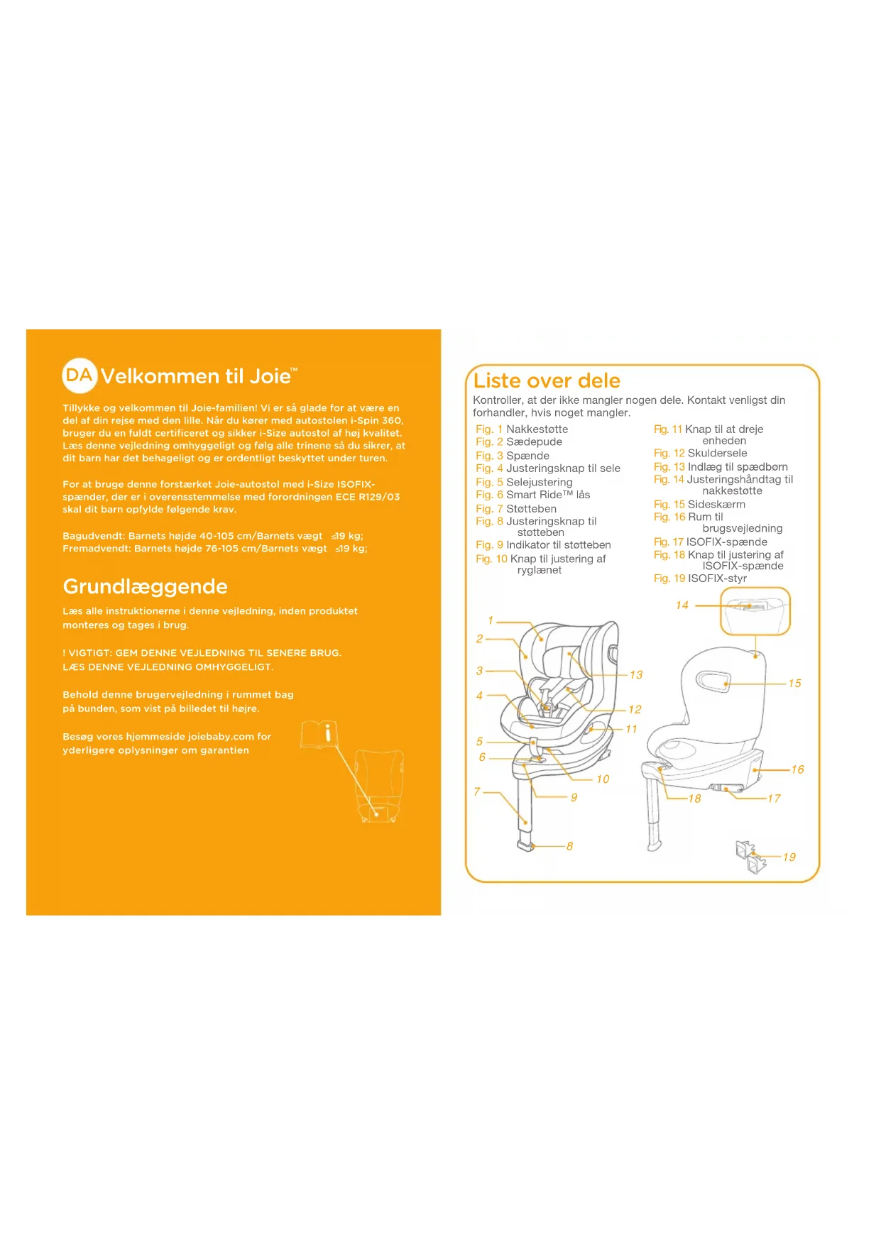 Tillykke og velkommen til Joie-familien! Vi er så glade for at være en del af din rejse med den lille. Når du kører med autostolen i-Spin 360, bruger du en fuldt certificeret og sikker i-Size autostol af høj kvalitet. Læs denne vejledning omhyggeligt og følg alle trinene så du sikrer, at dit barn har det behageligt og er ordentligt beskyttet under turen.For at bruge denne forstærket Joie-autostol med i-Size ISOFIX-spænder, der er i overensstemmelse med forordningen ECE R129/03 skal dit barn opfylde følgende krav.Bagudvendt: Barnets højde 40-105 cm/Barnets vægt 19 kg; Fremadvendt: Barnets højde 76-105 cm/Barnets vægt 19 kg; Grundlæggende Læs alle instruktionerne i denne vejledning, inden produktet monteres og tages i brug.! VIGTIGT: GEM DENNE VEJLEDNING TIL SENERE BRUG.LÆS DENNE VEJLEDNING OMHYGGELIGT.Behold denne brugervejledning i rummet bag på bunden, som vist på billedet til højre.Besøg vores hjemmeside joiebaby.com for yderligere oplysninger om garantien Liste over dele Fig. 1 NakkestøtteFig. 2 SædepudeFig. 3 SpændeFig. 4 Justeringsknap til sele Fig. 5 SelejusteringFig. 6 Smart Ride™ låsFig. 7 StøttebenFig. 8 Justeringsknap til støttebenFig. 9 Indikator til støttebenFig. 10 Knap til justering af ryglænetFig. 11 Knap til at dreje enhedenFig. 12 SkulderseleFig. 13 Indlæg til spædbørn Fig. 14 Justeringshåndtag til nakkestøtteFig. 15 SideskærmFig. 16 Rum til brugsvejledningFig. 17 ISOFIX-spændeFig. 18 Knap til justering af ISOFIX-spændeFig. 19 ISOFIX-styrKontroller, at der ikke mangler nogen dele. Kontakt venligst din forhandler, hvis noget mangler.