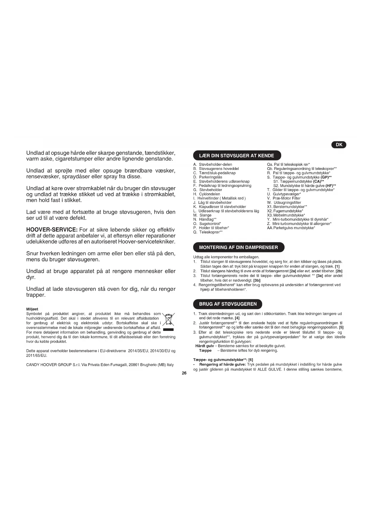 Undlad at opsuge hårde eller skarpe genstande, tændstikker, varm aske, cigaretstumper eller andre lignende genstande. Undlad at sprøjte med eller opsuge brændbare væsker, rensevæsker, spraydåser eller spray fra disse. Undlad at køre over strømkablet når du bruger din støvsuger og undlad at trække stikket ud ved at trække i strømkablet, men hold fast i stikket. Lad være med at fortsætte at bruge støvsugeren, hvis den ser ud til at være defekt. HOOVER-SERVICE: For at sikre løbende sikker og effektiv drift af dette apparat anbefaler vi, at eftersyn eller reparationer udelukkende udføres af en autoriseret Hoover-servicetekniker. Snur hverken ledningen om arme eller ben eller stå på den, mens du bruger støvsugeren. Undlad at bruge apparatet på at rengøre mennesker eller dyr. Undlad at lade støvsugeren stå oven for dig, når du rengør trapper. Miljøet Symbolet på produktet angiver, at produktet ikke må behandles som husholdningsaffald. Det skal i stedet aeveres til en relevant affaldsstation for genbrug af elektrisk og elektronisk udstyr. Bortskaffelse skal ske i overensstemmelse med de lokale miljøregler vedrørende bortskaffelse af affald. For mere detaljeret information om behandling, genvinding og genbrug af dette produkt, henvend dig da til den lokale kommune, til dit affaldsselskab eller den forretning hvor du købte produktet. Dette apparat overholder bestemmelserne i EU-direktiverne 2014/35/EU, 2014/30/EU og 2011/65/EU. CANDY HOOVER GROUP S.r.l. Via Privata Eden Fumagalli, 20861 Brugherio (MB) Italy
