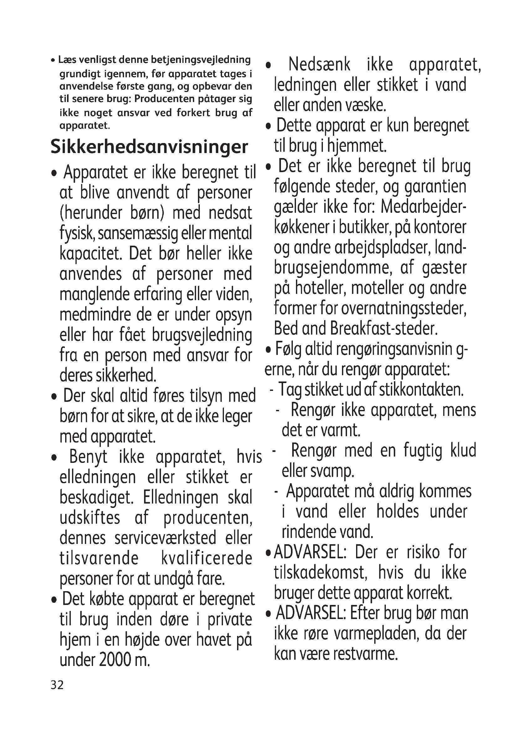 - Apparatet er ikke beregnet til at blive anvendt af personer (herunder børn) med nedsat fysisk, sansemæssig eller mental kapacitet. Det bør heller ikke anvendes af personer med manglende erfaring eller viden, medmindre de er under opsyn eller har fået brugsvejledning fra en person med ansvar for deres sikkerhed.