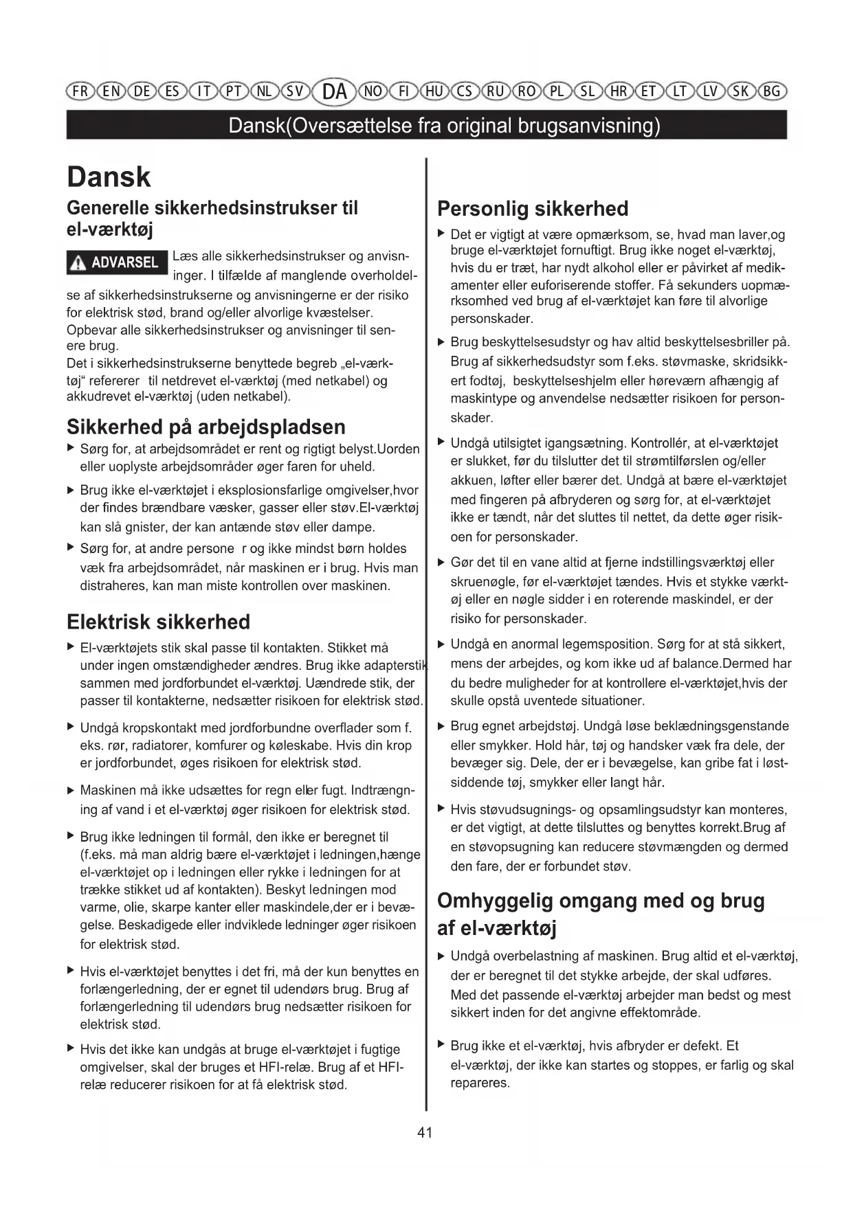 Sørg for, at arbejdsområdet er rent og rigtigt belyst.Uorden eller uoplyste arbejdsområder øger faren for uheld.Opbevar alle sikkerhedsinstrukser og anvisninger til sen-ere brug.Det i sikkerhedsinstrukserne benyttede begreb „el-værk-tøj“ refererer til netdrevet el-værktøj (med netkabel) og akkudrevet el-værktøj (uden netkabel).Hvis det ikke kan undgås at bruge el-værktøjet i fugtigeomgivelser, skal der bruges et HFI-relæ. Brug af et HFI-relæ reducerer risikoen for at få elektrisk stød.Det er vigtigt at være opmærksom, se, hvad man laver,og bruge el-værktøjet fornuftigt. Brug ikke noget el-værktøj, hvis du er træt, har nydt alkohol eller er påvirket af medik-amenter eller euforiserende stoffer. Få sekunders uopmæ-rksomhed ved brug af el-værktøjet kan føre til alvorlige personskader. Brug beskyttelsesudstyr og hav altid beskyttelsesbriller på. Brug af sikkerhedsudstyr som f.eks. støvmaske, skridsikk-ert fodtøj, beskyttelseshjelm eller høreværn afhængig af maskintype og anvendelse nedsætter risikoen for person-skader.
