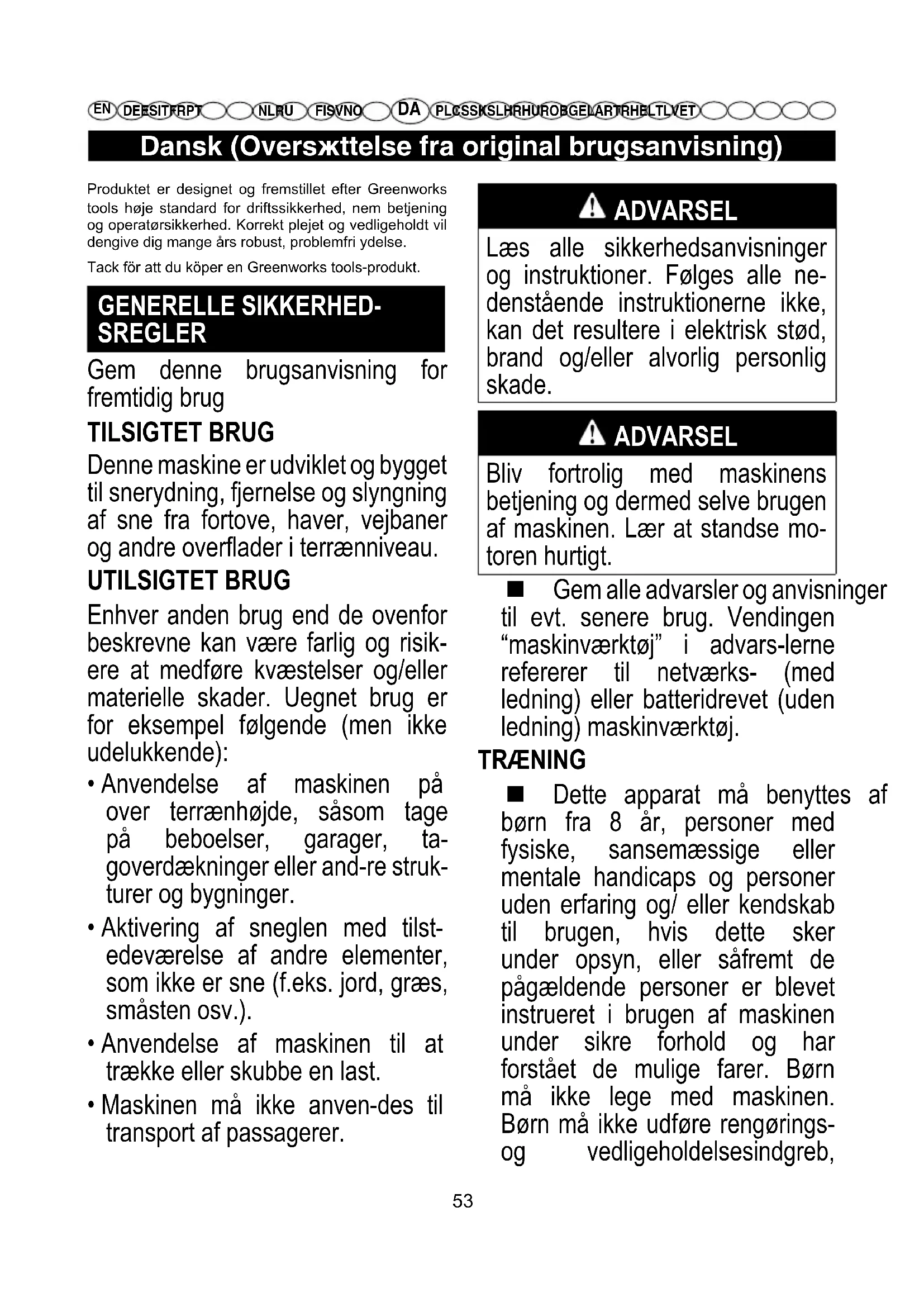 PL CS SK SL HR HU RO BG EL AR TR HE LT LV ET ADVARSEL Læs alle sikkerhedsanvisninger og instruktioner. Følges alle ne- denstående instruktionerne ikke, kan det resultere i elektrisk stød, brand og/eller alvorlig personlig skade. ADVARSEL Bliv fortrolig med maskinens betjening og dermed selve brugen af maskinen. Lær at standse mo- toren hurtigt. Gem alle advarsler og anvisninger til evt. senere brug. Vendingen “maskinværktøj” i advars-lerne refererer til netværks- (med ledning) eller batteridrevet (uden ledning) maskinværktøj. TRÆNING Dette apparat må benyttes af børn fra 8 år, personer med fysiske, sansemæssige eller mentale handicaps og personer uden erfaring og/ eller kendskab til brugen, hvis dette sker under opsyn, eller såfremt de pågældende personer er blevet instrueret i brugen af maskinen under sikre forhold og har forstået de mulige farer. Børn må ikke lege med maskinen. Børn må ikke udføre rengørings- og vedligeholdelsesindgreb, Produktet er designet og fremstillet efter Greenworks tools høje standard for driftssikkerhed, nem betjening og operatørsikkerhed. Korrekt plejet og vedligeholdt vil dengive dig mange års robust, problemfri ydelse. Tack för att du köper en Greenworks tools-produkt. GENERELLE SIKKERHED- SREGLER Gem denne brugsanvisning for fremtidig brug TILSIGTET BRUG Denne maskine er udviklet og bygget til snerydning, fjernelse og slyngning af sne fra fortove, haver, vejbaner og andre overflader i terrænniveau. UTILSIGTET BRUG Enhver anden brug end de ovenfor beskrevne kan være farlig og risik- ere at medføre kvæstelser og/eller materielle skader. Uegnet brug er for eksempel følgende (men ikke udelukkende):