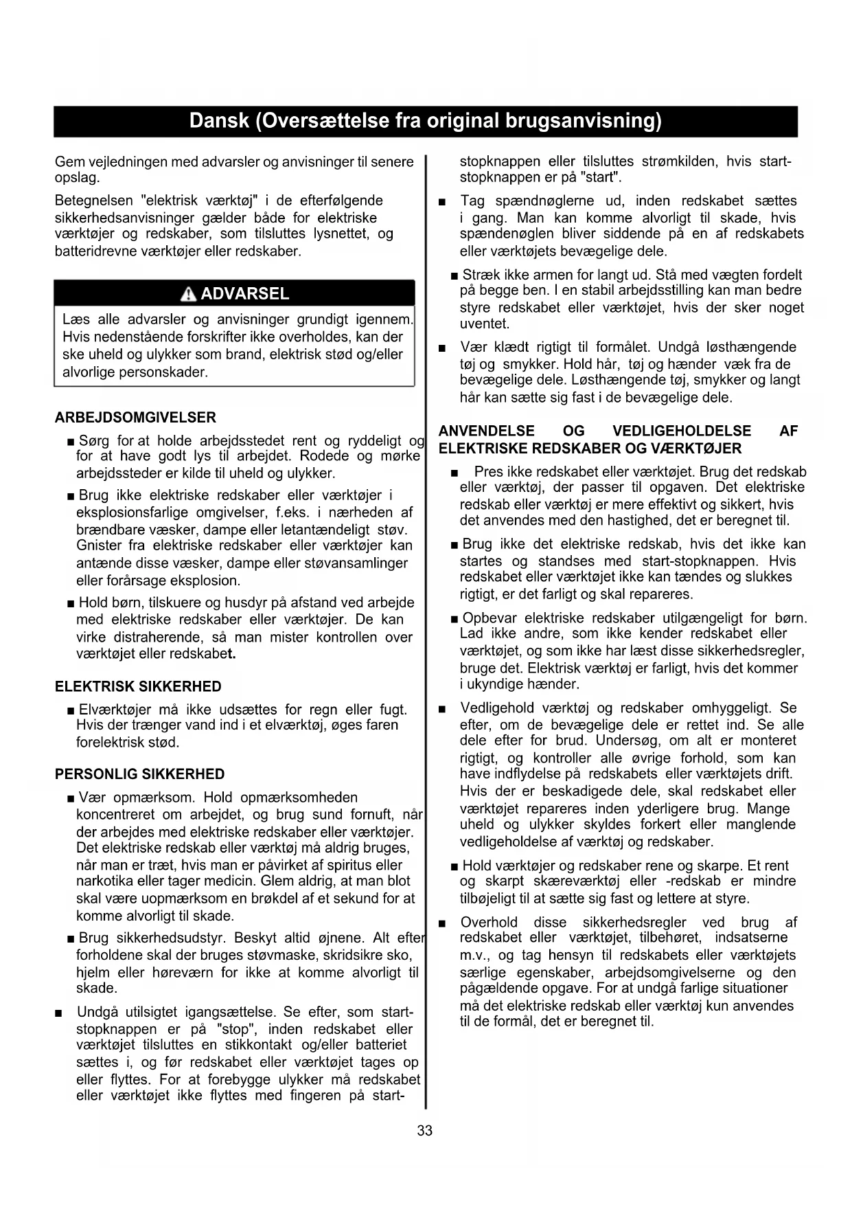 Säkerhet Igångsättning Användning Information Lås Lås upp33 Dansk (Oversættelse fra original brugsanvisning) Gem vejledningen med advarsler og anvisninger til senere opslag. Betegnelsen "elektrisk værktøj" i de efterfølgende sikkerhedsanvisninger gælder både for elektriske værktøjer og redskaber, som tilsluttes lysnettet, og batteridrevne værktøjer eller redskaber. ADVARSEL Læs alle advarsler og anvisninger grundigt igennem. Hvis nedenstående forskrifter ikke overholdes, kan der ske uheld og ulykker som brand, elektrisk stød og/eller alvorlige personskader. ARBEJDSOMGIVELSER ■ Sørg for at holde arbejdsstedet rent og ryddeligt og for at have godt lys til arbejdet. Rodede og mørke arbejdssteder er kilde til uheld og ulykker. ■ Brug ikke elektriske redskaber eller værktøjer i eksplosionsfarlige omgivelser, f.eks. i nærheden af brændbare væsker, dampe eller letantændeligt støv. Gnister fra elektriske redskaber eller værktøjer kan antænde disse væsker, dampe eller støvansamlinger eller forårsage eksplosion. ■ Hold børn, tilskuere og husdyr på afstand ved arbejde med elektriske redskaber eller værktøjer. De kan virke distraherende, så man mister kontrollen over værktøjet eller redskabet. ELEKTRISK SIKKERHED ■ Elværktøjer må ikke udsættes for regn eller fugt. Hvis der trænger vand ind i et elværktøj, øges faren forelektrisk stød. PERSONLIG SIKKERHED ■ Vær opmærksom. Hold opmærksomheden koncentreret om arbejdet, og brug sund fornuft, når der arbejdes med elektriske redskaber eller værktøjer. Det elektriske redskab eller værktøj må aldrig bruges, når man er træt, hvis man er påvirket af spiritus eller narkotika eller tager medicin. Glem aldrig, at man blot skal være uopmærksom en brøkdel af et sekund for at komme alvorligt til skade. ■ Brug sikkerhedsudstyr. Beskyt altid øjnene. Alt efter forholdene skal der bruges støvmaske, skridsikre sko, hjelm eller høreværn for ikke at komme alvorligt til skade. ■ Undgå utilsigtet igangsættelse. Se efter, som start- stopknappen er på "stop", inden redskabet eller værktøjet tilsluttes en stikkontakt og/eller batteriet sættes i, og før redskabet eller værktøjet tages op eller flyttes. For at forebygge ulykker må redskabet eller værktøjet ikke flyttes med fingeren på start- stopknappen eller tilsluttes strømkilden, hvis start- stopknappen er på "start". ■ Tag spændnøglerne ud, inden redskabet sættes i gang. Man kan komme alvorligt til skade, hvis spændenøglen bliver siddende på en af redskabets eller værktøjets bevægelige dele. ■ Stræk ikke armen for langt ud. Stå med vægten fordelt på begge ben. I en stabil arbejdsstilling kan man bedre styre redskabet eller værktøjet, hvis der sker noget uventet. ■ Vær klædt rigtigt til formålet. Undgå løsthængende tøj og smykker. Hold hår, tøj og hænder væk fra de bevægelige dele. Løsthængende tøj, smykker og langt hår kan sætte sig fast i de bevægelige dele.