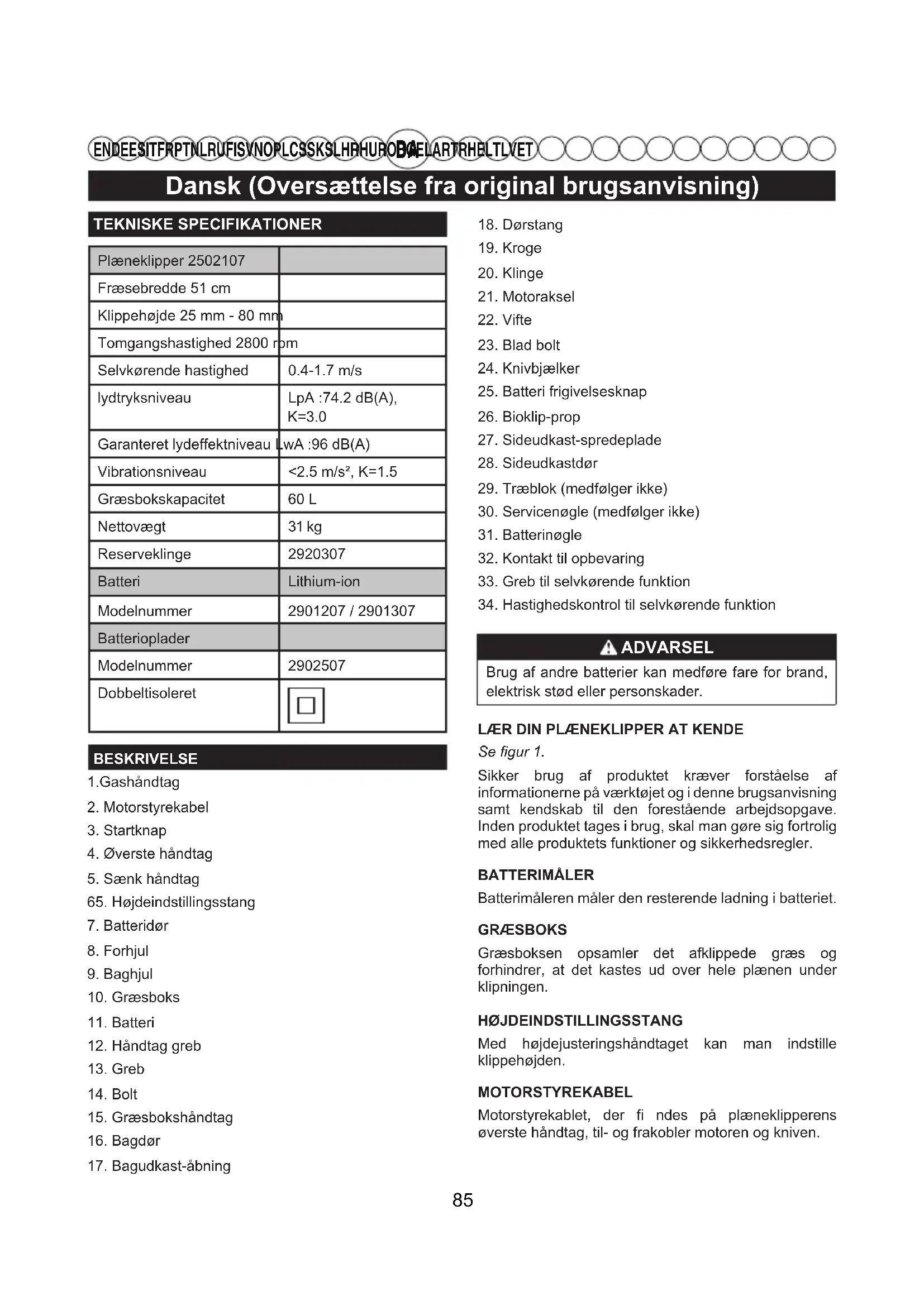 EN DE ES IT FR PT NL RU FI SV NO PL CS SK SL HR HU RO BG EL AR TR HE LT LV ET TEKNISKE SPECIFIKATIONERPlæneklipper 2502107Fræsebredde 51 cmKlippehøjde 25 mm - 80 mmTomgangshastighed 2800 rpmSelvkørende hastighed 0.4-1.7 m/slydtryksniveau LpA :74.2 dB(A), K=3.0Garanteret lydeffektniveau LwA :96 dB(A)Vibrationsniveau <2.5 m/s², K=1.5Græsbokskapacitet 60 LNettovægt 31 kgReserveklinge 2920307Batteri Lithium-ionModelnummer 2901207 / 2901307BatteriopladerModelnummer 2902507DobbeltisoleretBESKRIVELSE1.Gashåndtag2. Motorstyrekabel3. Startknap4. Øverste håndtag5. Sænk håndtag65. Højdeindstillingsstang7. Batteridør8. Forhjul9. Baghjul10. Græsboks11. Batteri12. Håndtag greb13. Greb14. Bolt15. Græsbokshåndtag16. Bagdør17. Bagudkast-åbning18. Dørstang19. Kroge20. Klinge21. Motoraksel22. Vifte23. Blad bolt24. Knivbjælker25. Batteri frigivelsesknap26. Bioklip-prop27. Sideudkast-spredeplade28. Sideudkastdør29. Træblok (medfølger ikke)30. Servicenøgle (medfølger ikke)31. Batterinøgle32. Kontakt til opbevaring33. Greb til selvkørende funktion 34. Hastighedskontrol til selvkørende funktion ADVARSEL Brug af andre batterier kan medføre fare for brand, elektrisk stød eller personskader.LÆR DIN PLÆNEKLIPPER AT KENDESe gur 1.Sikker brug af produktet kræver forståelse af informationerne på værktøjet og i denne brugsanvisning samt kendskab til den forestående arbejdsopgave. Inden produktet tages i brug, skal man gøre sig fortrolig med alle produktets funktioner og sikkerhedsregler.BATTERIMÅLERBatterimåleren måler den resterende ladning i batteriet.GRÆSBOKSGræsboksen opsamler det afklippede græs og forhindrer, at det kastes ud over hele plænen under klipningen.HØJDEINDSTILLINGSSTANGMed højdejusteringshåndtaget kan man indstille klippehøjden.MOTORSTYREKABEL Motorstyrekablet, der ndes på plæneklipperens øverste håndtag, til- og frakobler motoren og kniven. 85Dansk (Oversættelse fra original brugsanvisning)