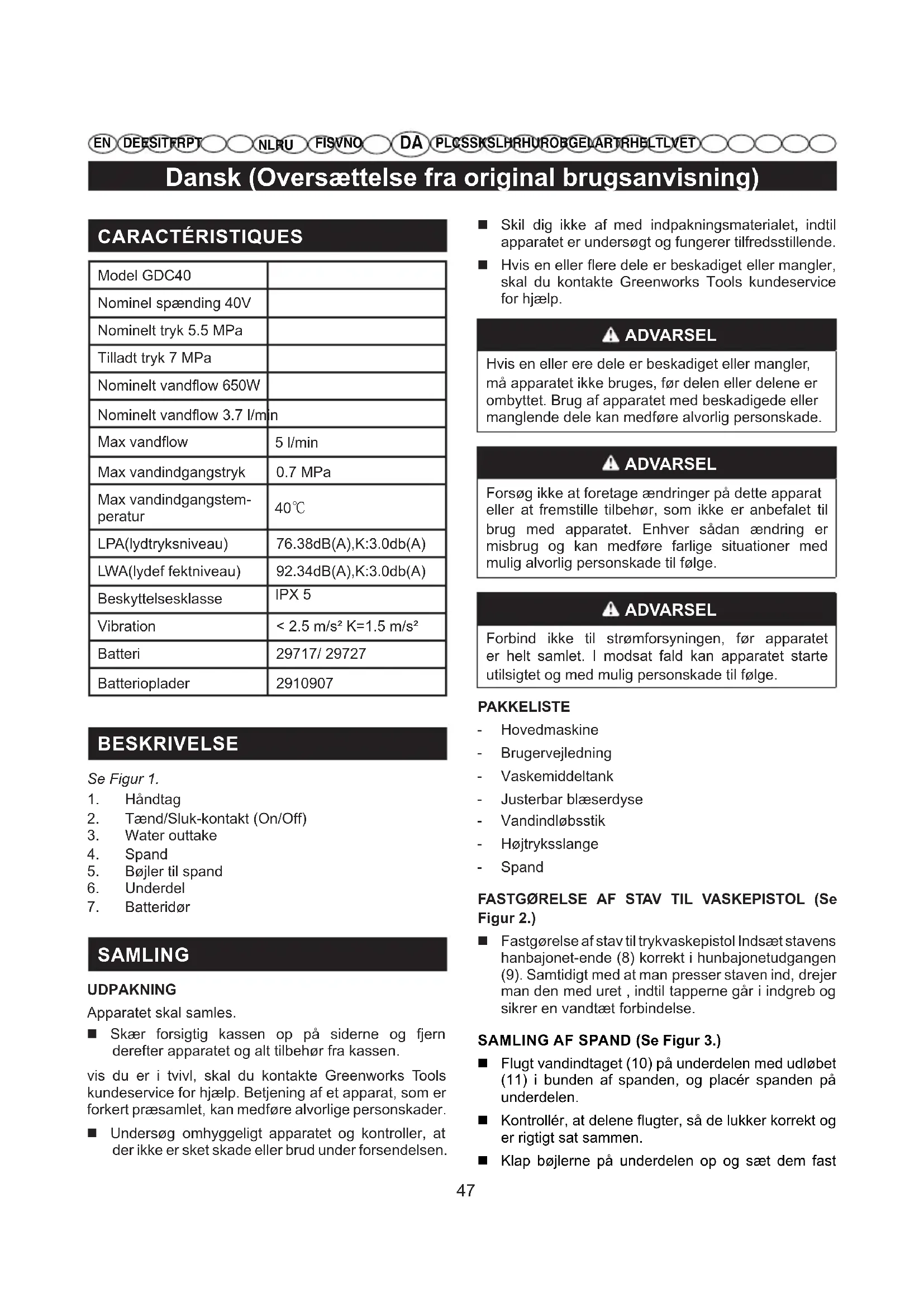 SAMLING UDPAKNING Apparatet skal samles. Skær forsigtig kassen op på siderne og fjern derefter apparatet og alt tilbehør fra kassen. vis du er i tvivl, skal du kontakte Greenworks Tools kundeservice for hjælp. Betjening af et apparat, som er forkert præsamlet, kan medføre alvorlige personskader. Undersøg omhyggeligt apparatet og kontroller, at der ikke er sket skade eller brud under forsendelsen. Skil dig ikke af med indpakningsmaterialet, indtil apparatet er undersøgt og fungerer tilfredsstillende. Hvis en eller flere dele er beskadiget eller mangler, skal du kontakte Greenworks Tools kundeservice for hjælp. ADVARSEL Hvis en eller ere dele er beskadiget eller mangler, må apparatet ikke bruges, før delen eller delene er ombyttet. Brug af apparatet med beskadigede eller manglende dele kan medføre alvorlig personskade. ADVARSEL Forsøg ikke at foretage ændringer på dette apparat eller at fremstille tilbehør, som ikke er anbefalet til brug med apparatet. Enhver sådan ændring er misbrug og kan medføre farlige situationer med mulig alvorlig personskade til følge. ADVARSEL Forbind ikke til strømforsyningen, før apparatet er helt samlet. I modsat fald kan apparatet starte utilsigtet og med mulig personskade til følge. PAKKELISTE - Hovedmaskine - Brugervejledning - Vaskemiddeltank - Justerbar blæserdyse - Vandindløbsstik - Højtryksslange - Spand FASTGØRELSE AF STAV TIL VASKEPISTOL (Se Figur 2.) Fastgørelse af stav til trykvaskepistol Indsæt stavens hanbajonet-ende (8) korrekt i hunbajonetudgangen (9). Samtidigt med at man presser staven ind, drejer man den med uret , indtil tapperne går i indgreb og sikrer en vandtæt forbindelse. SAMLING AF SPAND (Se Figur 3.) Flugt vandindtaget (10) på underdelen med udløbet (11) i bunden af spanden, og placér spanden på underdelen. Kontrollér, at delene flugter, så de lukker korrekt og er rigtigt sat sammen. Klap bøjlerne på underdelen op og sæt dem fast48 Dansk (Oversættelse fra original brugsanvisning)