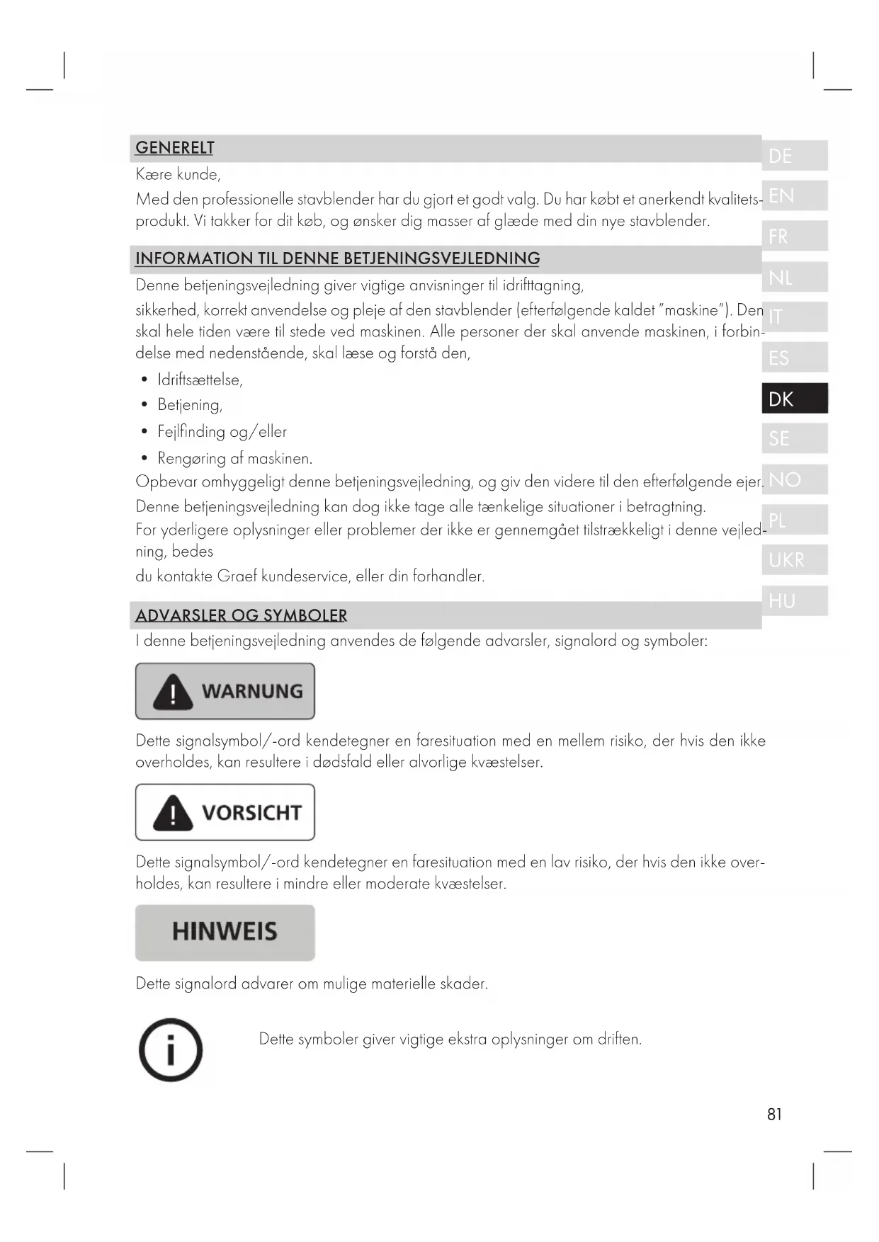I denne betjeningsvejledning anvendes de følgende advarsler, signalord og symboler: Dette signalsymbol/-ord kendetegner en faresituation med en mellem risiko, der hvis den ikke overholdes, kan resultere i dødsfald eller alvorlige kvæstelser. Dette signalsymbol/-ord kendetegner en faresituation med en lav risiko, der hvis den ikke over- holdes, kan resultere i mindre eller moderate kvæstelser. Dette signalord advarer om mulige materielle skader. Dette symboler giver vigtige ekstra oplysninger om driften.82 GENERELLE SIKKERHEDSANVISNINGER Denne maskine overholder alle de relevante sikkerhedsbestemmelser. For at garantere en sikker håndtering, skal de følgende sikkerhedsanvisninger overholdes: ● Forkert anvendelse kan medføre skader på personer og materiale. ● Før maskinen tages i brug, skal du foretage en visuel kontrol af udvendi- ge skader på kabinettet, tilslutningskabler og -stik. En beskadiget mas- kine må ikke tages i brug. ● Hvis tilslutningsledningen er beskadiget, må den kun erstattes af produ- centen, dennes kundeservice eller en tilsvarende kvalificeret person, for at forhindre farer. ● Reparationer må kun udføres af fagfolk eller af Graef-kundeservice. Ikke korrekte reparationer kan forårsage betydelige farer for brugeren. Desuden bortfalder garantikravet. ● Defekte komponenter må udelukkende udskiftes med originale reser- vedele. Kun for disse dele er det garanteret, at de opfylder sikkerheds- kravene. ● Denne maskine må ikke anvendes af børn. ● Maskinen og dens tilslutningsledning skal holdes væk fra børn. ● Maskinen kan anvendes af personer med nedsat fysisk, sensorisk eller mental kapacitet, eller manglende erfaring og/eller viden, forudsat at de blevet overvåget eller instrueret i en sikker anvendelse af maskinen, og har forstået de mulige farer. ● Børn må ikke lege med maskinen. ● Maskinen er ikke designet til at blive betjent med en ekstern timer, eller en separat fjernbetjening. ● Ledningen trækkes altid ud via stikkontakten i stikdåsen, og aldrig i selve ledningen. ● Vær opmærksom på, at elledningen ikke bliver hængende fast, da det kan medføre at maskinen falder ned. ● Der må ikke leges med emballagematerialer. Der er risiko for kvælning. ● Før montering, demontering eller rengøring skal maskinens strømforsy- ning altid frakobles strømnettet, det gælder også når det ikke er under opsyn.83