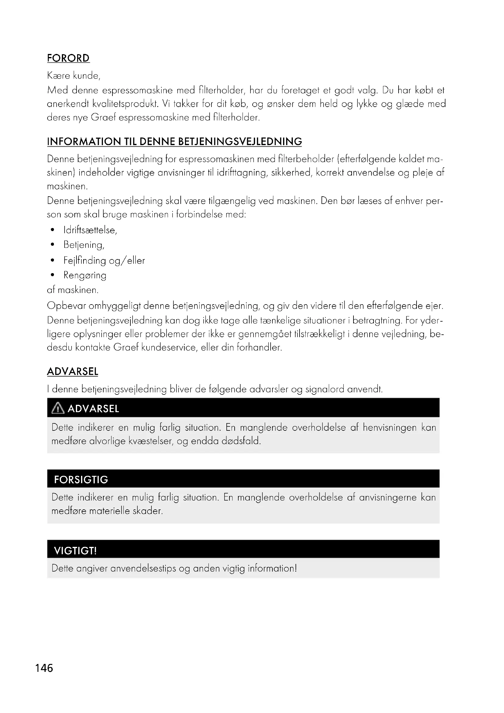 - Rengøring af maskinen. Opbevar omhyggeligt denne betjeningsvejledning, og giv den videre til den efterfølgende ejer. Denne betjeningsvejledning kan dog ikke tage alle tænkelige situationer i betragtning. For yder- ligere oplysninger eller problemer der ikke er gennemgået tilstrækkeligt i denne vejledning, be- desdu kontakte Graef kundeservice, eller din forhandler. ADVARSEL I denne betjeningsvejledning bliver de følgende advarsler og signalord anvendt. ADVARSEL Dette indikerer en mulig farlig situation. En manglende overholdelse af henvisningen kan medføre alvorlige kvæstelser, og endda dødsfald. FORSIGTIG Dette indikerer en mulig farlig situation. En manglende overholdelse af anvisningerne kan medføre materielle skader. VIGTIGT! Dette angiver anvendelsestips og anden vigtig information!147
