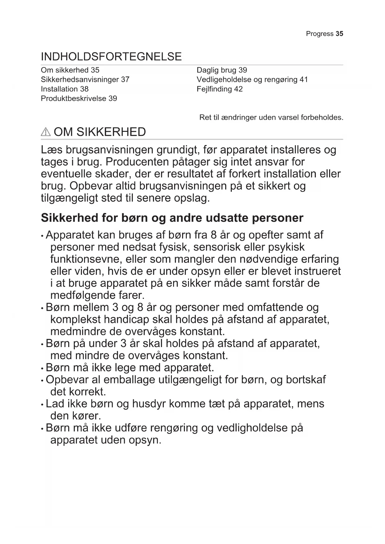 - Børn må ikke udføre rengøring og vedligholdelse på apparatet uden opsyn. Progress 35Generel sikkerhed