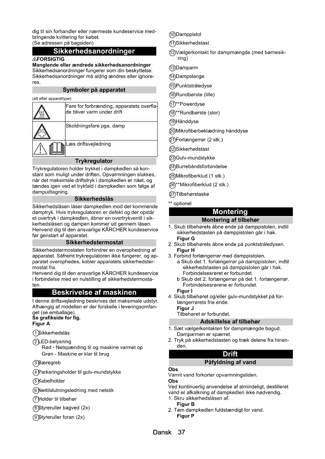 Figur P Fare for forbrænding, apparatets overfla- de bliver varm under drift Skoldningsfare pga. damp Læs driftsvejledning38 Dansk