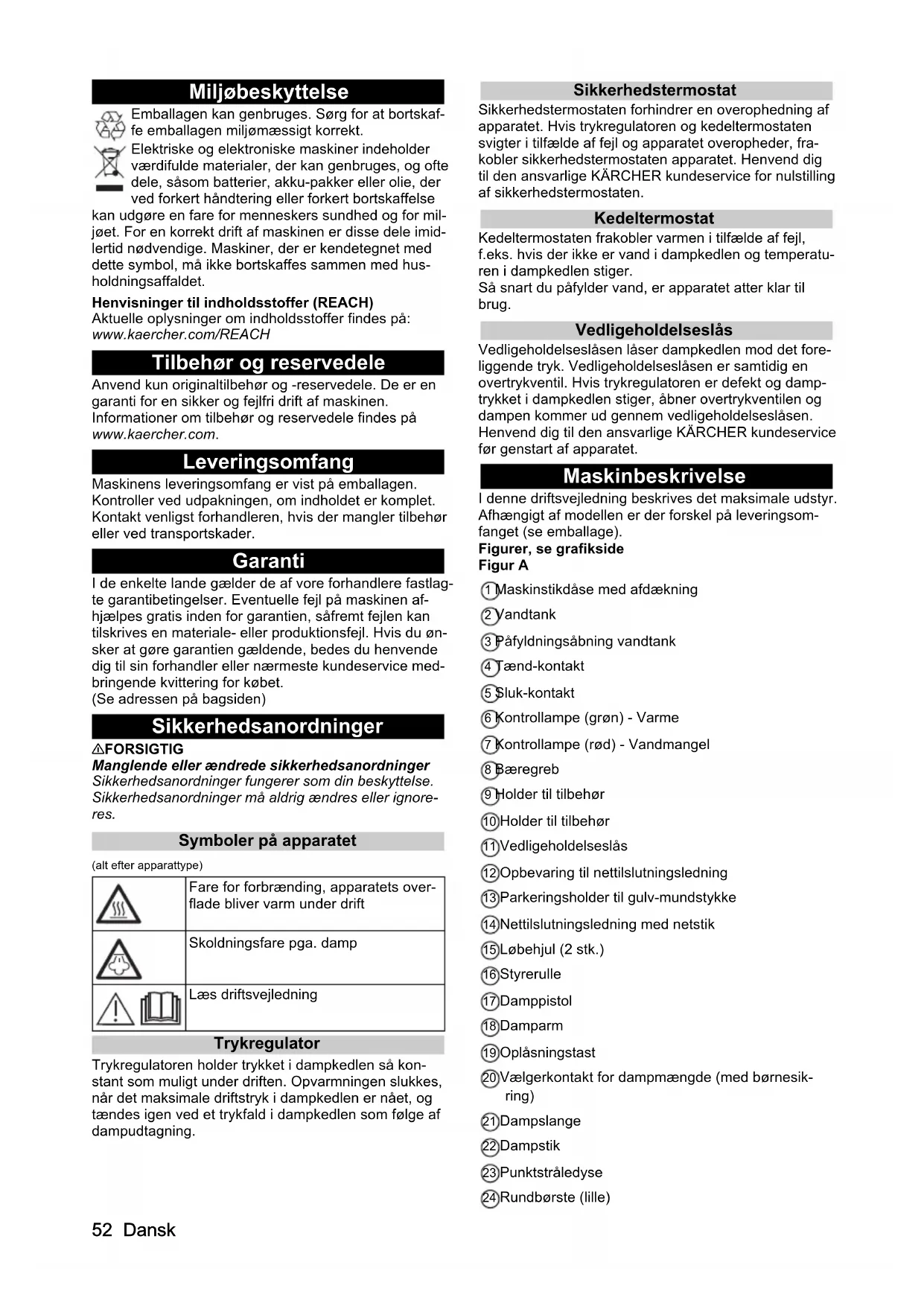 klud og tørre overfladerne af hermed. Glasrengøring BEMÆRK Glasbrud og beskadigede overflader Damp kan beskadige forseglede områder på vindues- rammen og ved lave udetemperaturer føre til spændin- ger på overfladen af vinduesruder og derved til glasbrud. Ret ikke dampen mod forseglede områder på vindues- rammen. Opvarm vinduesruder ved lave udetemperaturer ved at dampe let på hele glasoverfladen. Rengør vinduesfladen med hånddyse og beklæd- ning. Anvend en vinduesskraber til at fjerne vandet eller tør ruderne af. Brug af tilbehør Damppistol Damppistolen kan anvendes i de følgende brugsområ- der uden tilbehør: Til fjernelse af mindre folder på hængende tekstiler: Pådampning af tekstilet fra 10-20 cm afstand. Til afstøvning med fugtig klud: Damp kortvarigt på en klud og tør møblerne af hermed.Dansk 55 Punktstråledyse Punktstråledysen er egnet til rengøring af svært tilgæn- gelige steder, fuger, armaturer, afløb, vaskekummer, to- iletter, persienner eller radiatorer. Jo tættere punktstråledysen kommer på det snavsede sted, desto højere er rengøringsvirkningen, da temperatur og dampmængde er højest ved dyseudgangen. Kraftige kalkaflejringer kan behandlers med et egnet rengø- ringsmiddel før damprengøringen. Lad rengøringsmid- let virke ca. 5 minutter og påfør derefter damp.