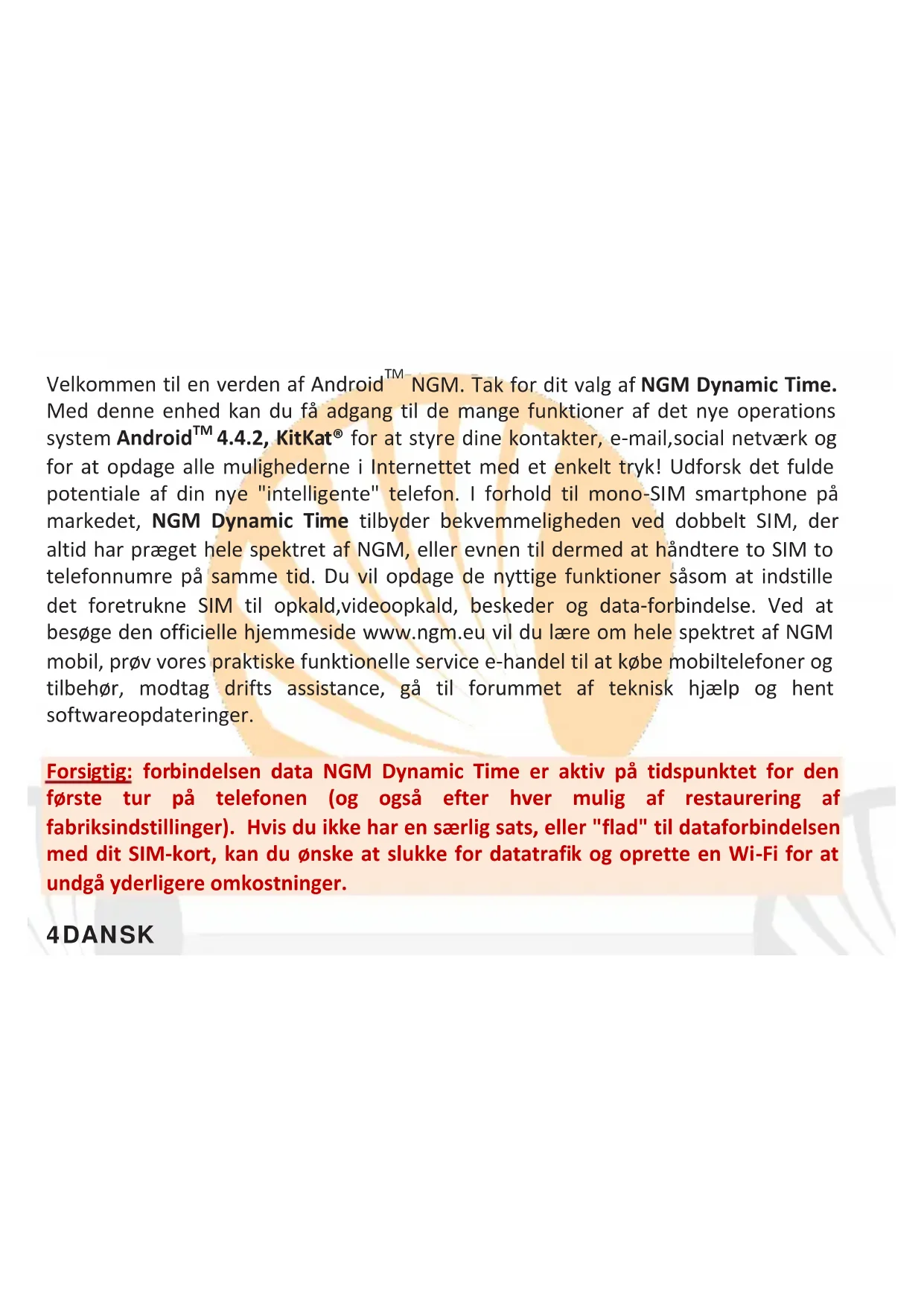 NGM. Tak for dit valg af NGM Dynamic Time. Med denne enhed kan du få adgang til de mange funktioner af det nye operations system Android