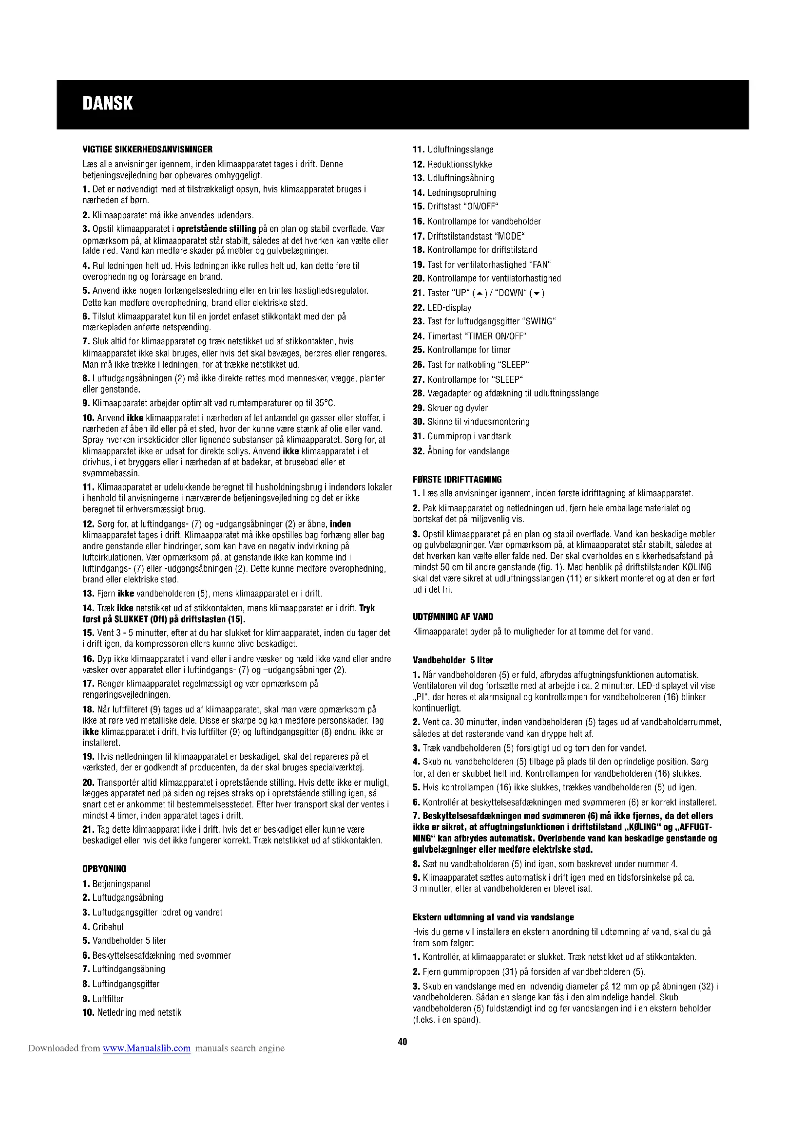 20. Transportér altid klimaapparatet i opretstående stilling. Hvis dette ikke er muligt,