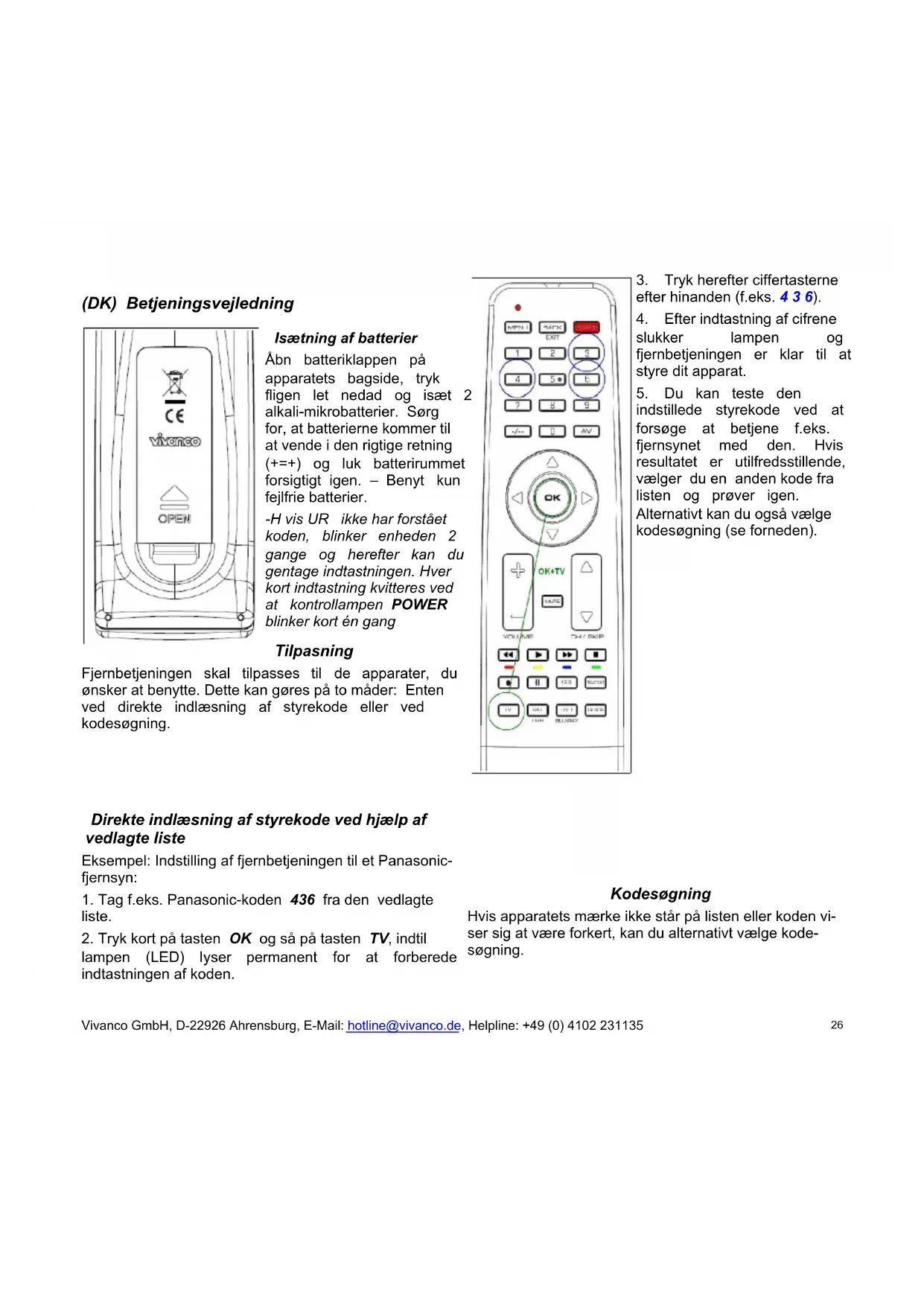 indstillede styrekode ved at forsøge at betjene f.eks. fjernsynet med den. Hvis resultatet er utilfredsstillende, vælger du en anden kode fra listen og prøver igen. Alternativt kan du også vælge kodesøgning (se forneden). Kodesøgning Hvis apparatets mærke ikke står på listen eller koden vi- ser sig at være forkert, kan du alternativt vælge kode- søgning. Vivanco GmbH, D-22926 Ahrensburg, E-Mail: hotline@vivanco.de, Helpline: +49 (0) 4102 231135 26Manuel kodesøgning