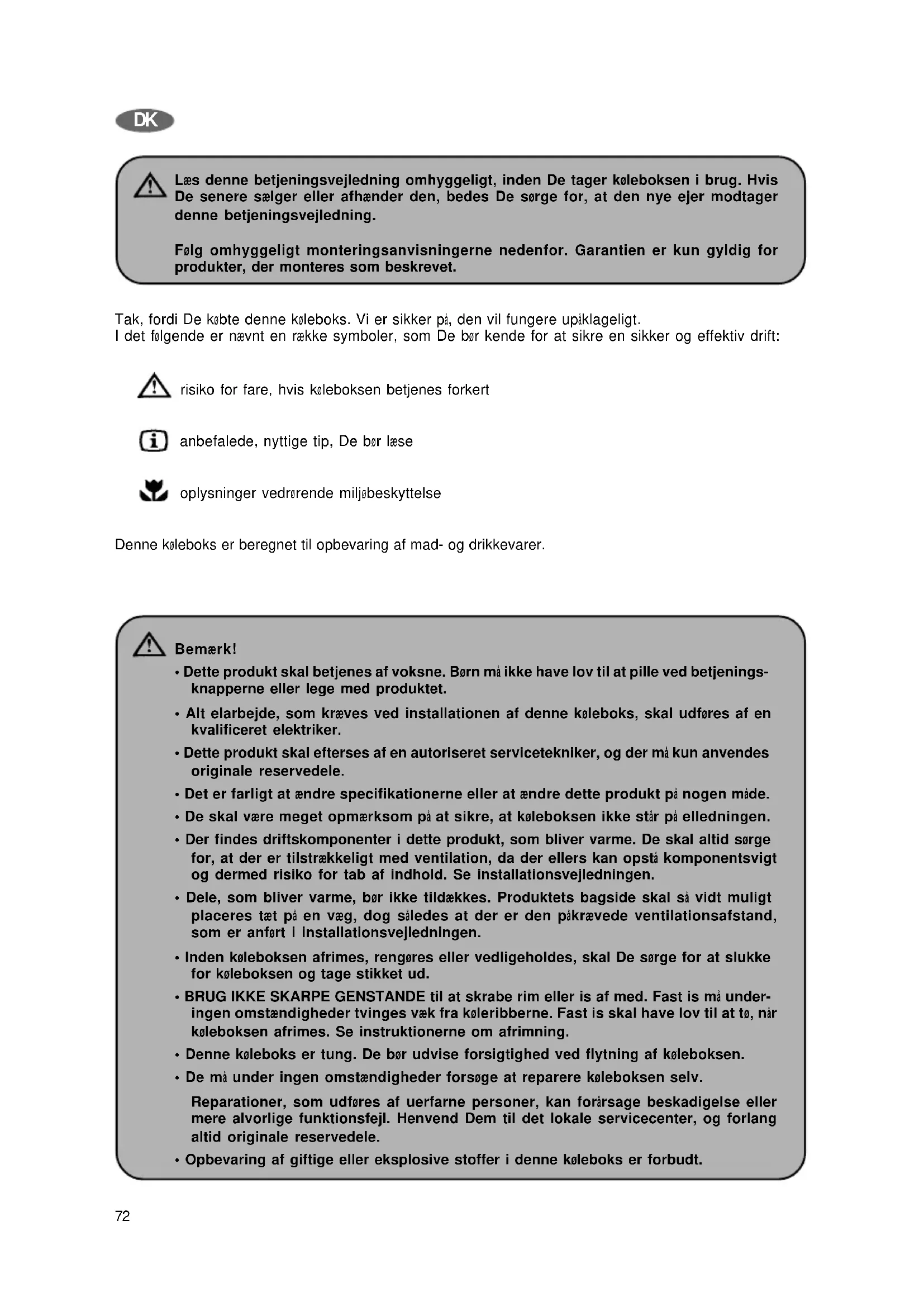 Læs denne betjeningsvejledning omhyggeligt, inden De tager køleboksen i brug. Hvis De senere sælger eller afhænder den, bedes De sørge for, at den nye ejer modtager denne betjeningsvejledning. Følg omhyggeligt monteringsanvisningerne nedenfor. Garantien er kun gyldig for produkter, der monteres som beskrevet. Tak, fordi De købte denne køleboks. Vi er sikker på, den vil fungere upåklageligt. I det følgende er nævnt en række symboler, som De bør kende for at sikre en sikker og effektiv drift: risiko for fare, hvis køleboksen betjenes forkert anbefalede, nyttige tip, De bør læse oplysninger vedrørende miljøbeskyttelse Denne køleboks er beregnet til opbevaring af mad- og drikkevarer. Bemærk!