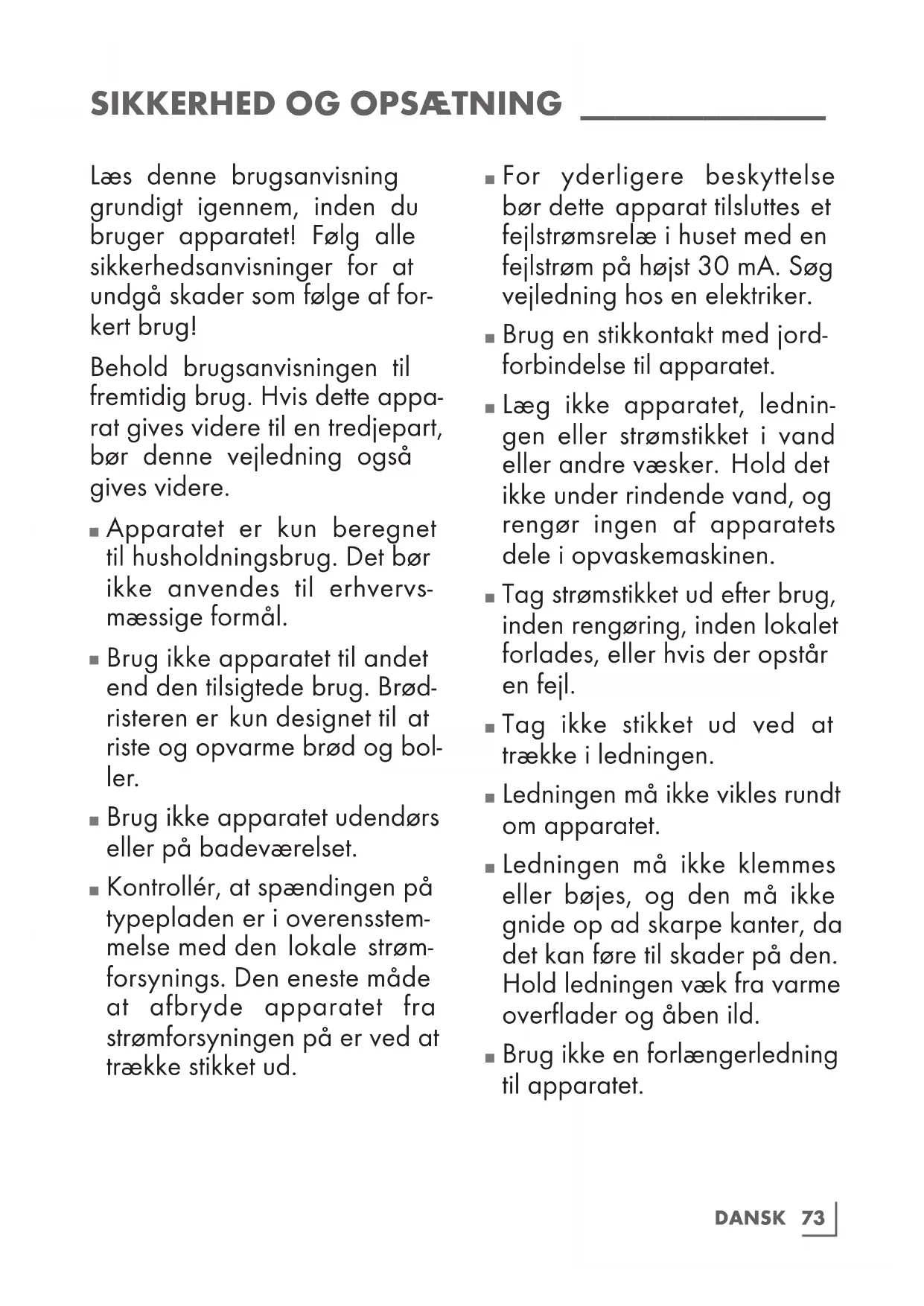 Brug ikke apparatet til andet end den tilsigtede brug. Brød- risteren er kun designet til at riste og opvarme brød og bol- ler.