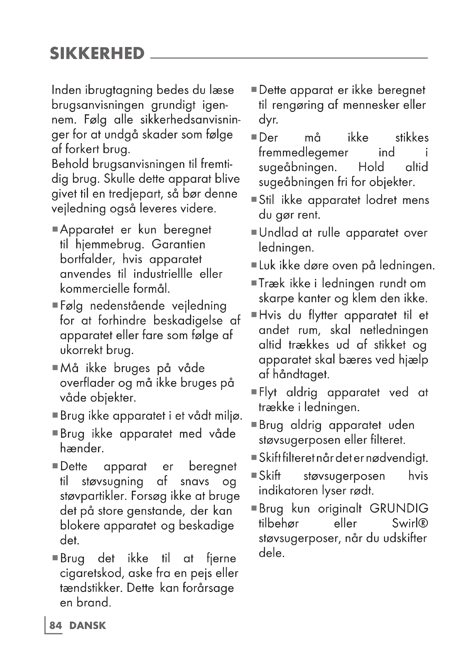 Dette apparat er beregnet til støvsugning af snavs og støvpartikler. Forsøg ikke at bruge det på store genstande, der kan blokere apparatet og beskadige det.