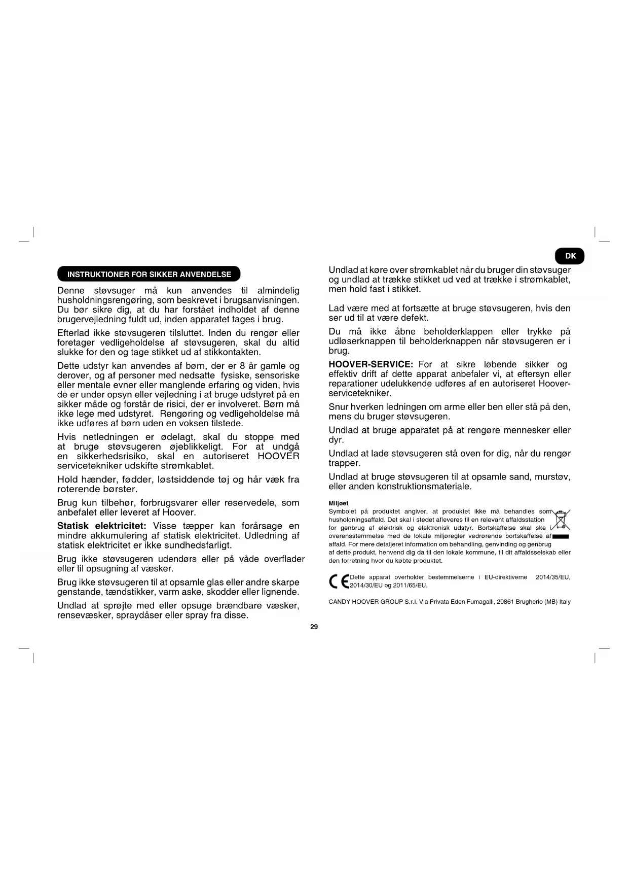Denne støvsuger må kun anvendes til almindelig husholdningsrengøring, som beskrevet i brugsanvisningen. Du bør sikre dig, at du har forstået indholdet af denne brugervejledning fuldt ud, inden apparatet tages i brug. Efterlad ikke støvsugeren tilsluttet. Inden du rengør eller foretager vedligeholdelse af støvsugeren, skal du altid slukke for den og tage stikket ud af stikkontakten. Dette udstyr kan anvendes af børn, der er 8 år gamle og derover, og af personer med nedsatte fysiske, sensoriske eller mentale evner eller manglende erfaring og viden, hvis de er under opsyn eller vejledning i at bruge udstyret på en sikker måde og forstår de risici, der er involveret. Børn må ikke lege med udstyret. Rengøring og vedligeholdelse må ikke udføres af børn uden en voksen tilstede. Hvis netledningen er ødelagt, skal du stoppe med at bruge støvsugeren øjeblikkeligt. For at undgå en sikkerhedsrisiko, skal en autoriseret HOOVER servicetekniker udskifte strømkablet. Hold hænder, fødder, løstsiddende tøj og hår væk fra roterende børster. Brug kun tilbehør, forbrugsvarer eller reservedele, som anbefalet eller leveret af Hoover. Statisk elektricitet: Visse tæpper kan forårsage en mindre akkumulering af statisk elektricitet. Udledning af statisk elektricitet er ikke sundhedsfarligt. Brug ikke støvsugeren udendørs eller på våde overader eller til opsugning af væsker. Brug ikke støvsugeren til at opsamle glas eller andre skarpe genstande, tændstikker, varm aske, skodder eller lignende. Undlad at sprøjte med eller opsuge brændbare væsker, rensevæsker, spraydåser eller spray fra disse. Undlad at køre over strømkablet når du bruger din støvsuger og undlad at trække stikket ud ved at trække i strømkablet, men hold fast i stikket. Lad være med at fortsætte at bruge støvsugeren, hvis den ser ud til at være defekt. Du må ikke åbne beholderklappen eller trykke på udløserknappen til beholderknappen når støvsugeren er i brug. HOOVER-SERVICE: For at sikre løbende sikker og effektiv drift af dette apparat anbefaler vi, at eftersyn eller reparationer udelukkende udføres af en autoriseret Hoover- servicetekniker. Snur hverken ledningen om arme eller ben eller stå på den, mens du bruger støvsugeren. Undlad at bruge apparatet på at rengøre mennesker eller dyr. Undlad at lade støvsugeren stå oven for dig, når du rengør trapper. Undlad at bruge støvsugeren til at opsamle sand, murstøv, eller anden konstruktionsmateriale. Miljøet Symbolet på produktet angiver, at produktet ikke må behandles som husholdningsaffald. Det skal i stedet aeveres til en relevant affaldsstation for genbrug af elektrisk og elektronisk udstyr. Bortskaffelse skal ske i overensstemmelse med de lokale miljøregler vedrørende bortskaffelse af affald. For mere detaljeret information om behandling, genvinding og genbrug af dette produkt, henvend dig da til den lokale kommune, til dit affaldsselskab eller den forretning hvor du købte produktet. Dette apparat overholder bestemmelserne i EU-direktiverne 2014/35/EU, 2014/30/EU og 2011/65/EU. CANDY HOOVER GROUP S.r.l. Via Privata Eden Fumagalli, 20861 Brugherio (MB) Italy DK30 *Kun til visse modeller **Kan variere i forhold til model A. Støvbeholder-lem B. Støvbeholder C. Hovedrengøringsmaskine D. Variabel indstilningsknap for sugekraft** D1. LED-display med touch-knapper** E. Tænd/sluk-pedalknap F. Pre-motor lterdæksel G. Håndtag til støvbeholder H. Udløsningsknap for beholderklap