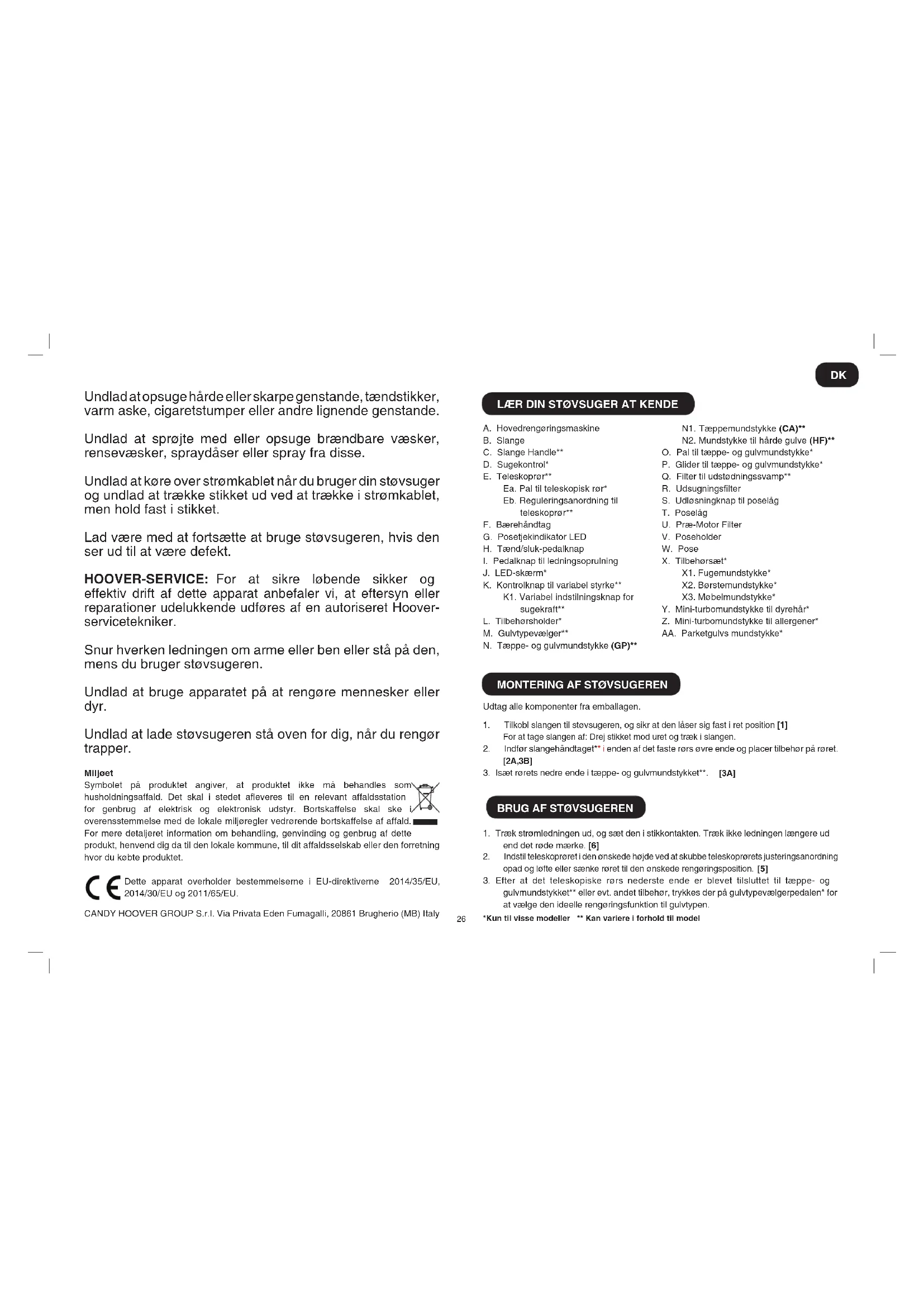 eller i opbevaringsposition, når det ikke er i brug. [11] TILBEHØR For at opnå den bedste ydeevne og effektive udnyttelse anbefales det at de korrekte mundstykker anvendes til de vigtigste rengøringsformål. Disse mundstykker er vist i illustrationerne ved bogstaverne GP, HF og CA. Mundstykketypen GP an anvendes for at rengøre både tæpper og hårde gulve. Mundstykketypen HF er kun velegnet til brug på hårde gulve. Et mundstykke af typen CA er kun velegnet på tæpper. De andre mundstykker er tilbehør for specielle rengøringsopgaver og er kun anbefalede til lejlighedsvis anvendelse. *Kun til visse modeller **Kan variere i forhold til model Alt tilbehør kan monteres på slangens håndtag eller for enden af teleskoprøret. Tilbehørsæt* – Fugemundstykket, møbelmundstykket og støvbørsten kan opbevares på røret takket være den praktiske værktøjsholder*. Fugemundstykke* – Til hjørner og områder, der er vanskelige at komme til. [X1] Børstemundstykke* – Til bogreoler, rammer, tastaturer og andre sarte områder. Tryk på knappen på værktøjets hoveddel for at få børsterne frem. [X2] Møbelmundstykke* – Til bløde møbler og stoffer. [X3] Mini-turbomundstykke til dyrehår* - Brug mini-turbomundstykket på trapper eller til rengøring af tekstiloverader i dybden og andre områder, der er svære at rengøre. Især velegnet til fjernelse af dyrehår. [Y] Mini-turbomundstykke til allergener* – Brug mini-turbomundstykket på trapper eller til grundig rengøring af tekstiloverader og andre områder, der er svære at rengøre. Velegnet til fjernelse af allergener. [Z] Parketgulvs mundstykke* – Til parketgulve og andre sarte gulve. [AA] VIGTIGT: Brug ikke turbo- og mini-turbomundstykket på tæpper med lange frynser, skind og på tæppeiser, der er dybere end 15 mm. Hold ikke mundstykket stille, mens børsten roterer.