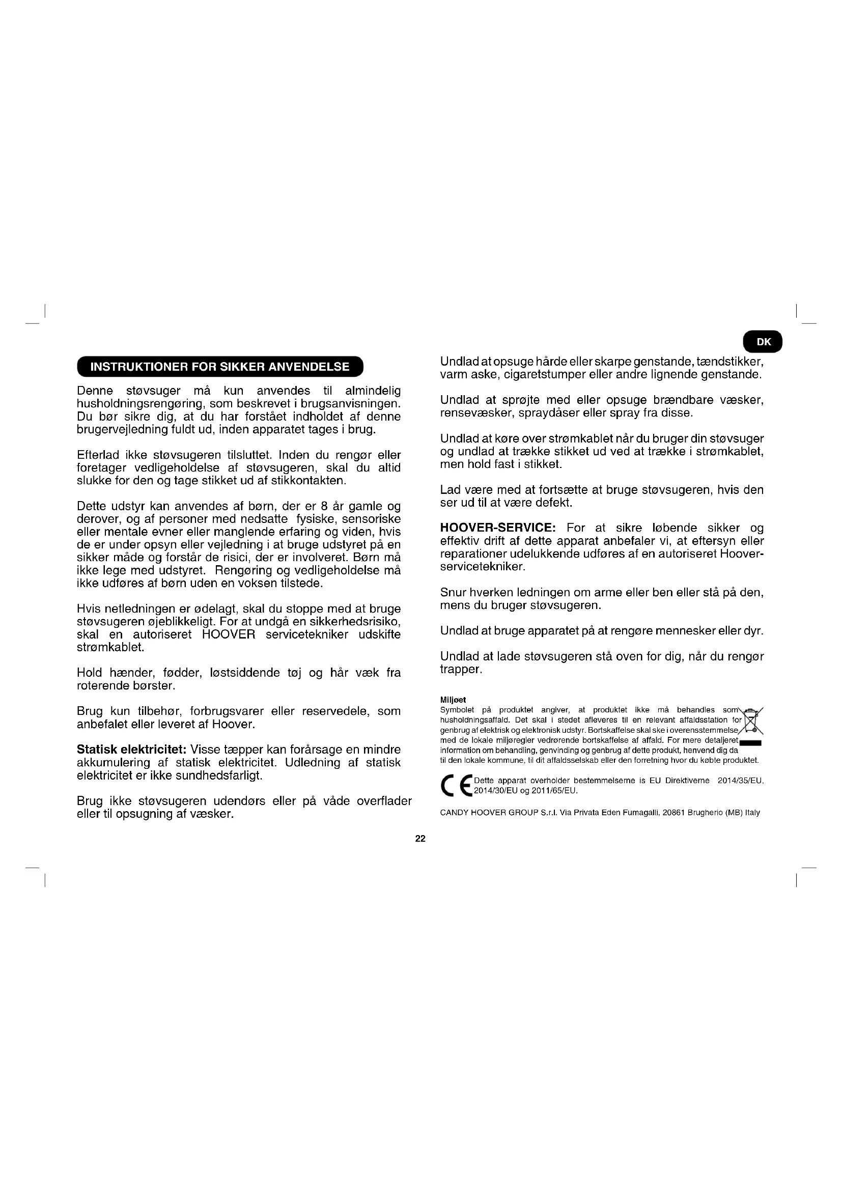 Denne støvsuger må kun anvendes til almindelig husholdningsrengøring, som beskrevet i brugsanvisningen. Du bør sikre dig, at du har forstået indholdet af denne brugervejledning fuldt ud, inden apparatet tages i brug. Efterlad ikke støvsugeren tilsluttet. Inden du rengør eller foretager vedligeholdelse af støvsugeren, skal du altid slukke for den og tage stikket ud af stikkontakten. Dette udstyr kan anvendes af børn, der er 8 år gamle og derover, og af personer med nedsatte fysiske, sensoriske eller mentale evner eller manglende erfaring og viden, hvis de er under opsyn eller vejledning i at bruge udstyret på en sikker måde og forstår de risici, der er involveret. Børn må ikke lege med udstyret. Rengøring og vedligeholdelse må ikke udføres af børn uden en voksen tilstede. Hvis netledningen er ødelagt, skal du stoppe med at bruge støvsugeren øjeblikkeligt. For at undgå en sikkerhedsrisiko, skal en autoriseret HOOVER servicetekniker udskifte strømkablet. Hold hænder, fødder, løstsiddende tøj og hår væk fra roterende børster. Brug kun tilbehør, forbrugsvarer eller reservedele, som anbefalet eller leveret af Hoover. Statisk elektricitet: Visse tæpper kan forårsage en mindre akkumulering af statisk elektricitet. Udledning af statisk elektricitet er ikke sundhedsfarligt. Brug ikke støvsugeren udendørs eller på våde overader eller til opsugning af væsker. Undlad at opsuge hårde eller skarpe genstande, tændstikker, varm aske, cigaretstumper eller andre lignende genstande. Undlad at sprøjte med eller opsuge brændbare væsker, rensevæsker, spraydåser eller spray fra disse. Undlad at køre over strømkablet når du bruger din støvsuger og undlad at trække stikket ud ved at trække i strømkablet, men hold fast i stikket. Lad være med at fortsætte at bruge støvsugeren, hvis den ser ud til at være defekt. HOOVER-SERVICE: For at sikre løbende sikker og effektiv drift af dette apparat anbefaler vi, at eftersyn eller reparationer udelukkende udføres af en autoriseret Hoover- servicetekniker. Snur hverken ledningen om arme eller ben eller stå på den, mens du bruger støvsugeren. Undlad at bruge apparatet på at rengøre mennesker eller dyr. Undlad at lade støvsugeren stå oven for dig, når du rengør trapper. Miljøet Symbolet på produktet angiver, at produktet ikke må behandles som husholdningsaffald. Det skal i stedet aeveres til en relevant affaldsstation for genbrug af elektrisk og elektronisk udstyr. Bortskaffelse skal ske i overensstemmelse med de lokale miljøregler vedrørende bortskaffelse af affald. For mere detaljeret information om behandling, genvinding og genbrug af dette produkt, henvend dig da til den lokale kommune, til dit affaldsselskab eller den forretning hvor du købte produktet. Dette apparat overholder bestemmelserne is EU Direktiverne 2014/35/EU, 2014/30/EU og 2011/65/EU. CANDY HOOVER GROUP S.r.l. Via Privata Eden Fumagalli, 20861 Brugherio (MB) Italy