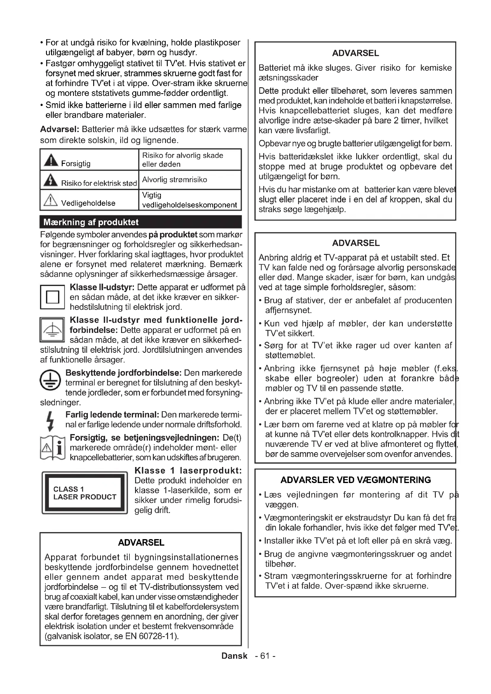 - Brug dette TV i en højde på mindre end 2000 meter over havets overflade, på tørre steder og i regioner med moderat eller tropisk klima.