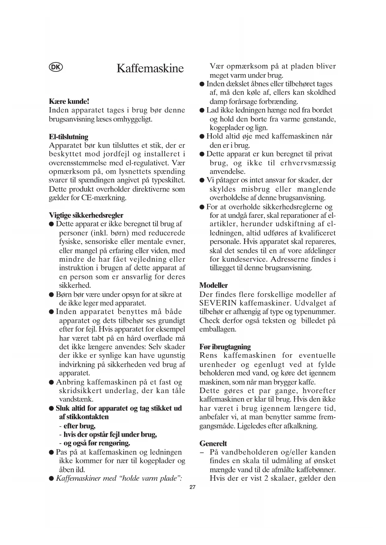 La pulizia del coperchio salva-aroma va effettuata dopo aver pulito la caraffa, nel seguente modo: sistemate il coperchio sulla caraffa e fateci scorrere dell’acqua o una soluzione detergente. Smaltimento Non smaltite apparecchi vecchi o difettosi gettandoli tra i normali rifiuti domestici, ma solo tramite i punti di raccolta pubblici. Dichiarazione di garanzia La garanzia sui nostri prodotti ha validità di 2 anni dalla data di vendita (certificata da scontrino fiscale) e comprende gli eventuali difetti del materiale o di particolari di costruzione. I danni derivanti da un uso improprio, rotture da caduta o similari non vengono riconosciuti. La garanzia decade nel momento in cui gli apparecchi vengono aperti o manomessi da Centri non da noi autorizzati. 26Kære kunde! Inden apparatet tages i brug bør denne brugsanvisning læses omhyggeligt. El-tilslutning Apparatet bør kun tilsluttes et stik, der er beskyttet mod jordfejl og installeret i overensstemmelse med el-regulativet. Vær opmærksom på, om lysnettets spænding svarer til spændingen angivet på typeskiltet. Dette produkt overholder direktiverne som gælder for CE-mærkning. Vigtige sikkerhedsregler ● Dette apparat er ikke beregnet til brug af personer (inkl. børn) med reducerede fysiske, sensoriske eller mentale evner, eller mangel på erfaring eller viden, med mindre de har fået vejledning eller instruktion i brugen af dette apparat af en person som er ansvarlig for deres sikkerhed. ● Børn bør være under opsyn for at sikre at de ikke leger med apparatet. ● Inden apparatet benyttes må både apparatet og dets tilbehør ses grundigt efter for fejl. Hvis apparatet for eksempel har været tabt på en hård overflade må det ikke længere anvendes: Selv skader der ikke er synlige kan have ugunstig indvirkning på sikkerheden ved brug af apparatet. ● Anbring kaffemaskinen på et fast og skridsikkert underlag, der kan tåle vandstænk. ● Sluk altid for apparatet og tag stikket ud af stikkontakten - efter brug, - hvis der opstår fejl under brug, - og også før rengøring. ● Pas på at kaffemaskinen og ledningen ikke kommer for nær til kogeplader og åben ild. ● Kaffemaskiner med “holde varm plade”: Vær opmærksom på at pladen bliver meget varm under brug. ● Inden dækslet åbnes eller tilbehøret tages af, må den køle af, ellers kan skoldhed damp forårsage forbrænding. ● Lad ikke ledningen hænge ned fra bordet og hold den borte fra varme genstande, kogeplader og lign. ● Hold altid øje med kaffemaskinen når den er i brug. ● Dette apparat er kun beregnet til privat brug, og ikke til erhvervsmæssig anvendelse. ● Vi påtager os intet ansvar for skader, der skyldes misbrug eller manglende overholdelse af denne brugsanvisning. ● For at overholde sikkerhedsreglerne og for at undgå farer, skal reparationer af el- artikler, herunder udskiftning af el- ledningen, altid udføres af kvalificeret personale. Hvis apparatet skal repareres, skal det sendes til en af vore afdelinger for kundeservice. Adresserne findes i tillægget til denne brugsanvisning. Modeller Der findes flere forskellige modeller af SEVERIN kaffemaskiner. Udvalget af tilbehør er afhængig af type og typenummer. Check derfor også teksten og billedet på emballagen. Før ibrugtagning Rens kaffemaskinen for eventuelle urenheder og egenlugt ved at fylde beholderen med vand, og køre det igennem maskinen, som når man brygger kaffe. Dette gøres et par gange, hvorefter kaffemaskinen er klar til brug. Hvis den ikke har været i brug igennem længere tid, anbefaler vi, at man benytter samme frem- gangsmåde. Ligeledes efter afkalkning. Generelt
