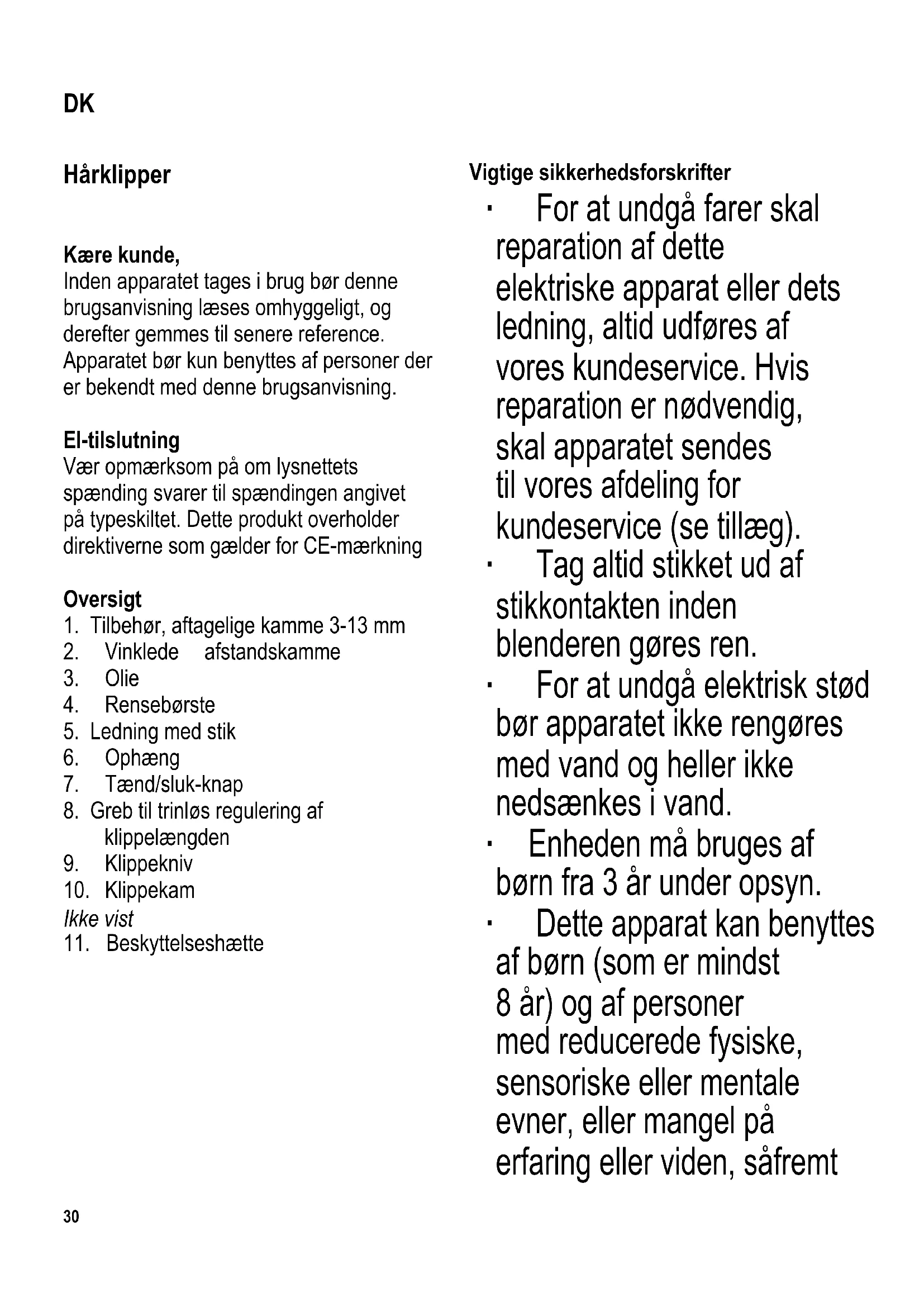 Vigtige sikkerhedsforskrifter ∙ For at undgå farer skal reparation af dette elektriske apparat eller dets ledning, altid udføres af vores kundeservice. Hvis reparation er nødvendig, skal apparatet sendes til vores afdeling for kundeservice (se tillæg). ∙ Tag altid stikket ud af stikkontakten inden blenderen gøres ren. ∙ For at undgå elektrisk stød bør apparatet ikke rengøres med vand og heller ikke nedsænkes i vand. ∙ Enheden må bruges af børn fra 3 år under opsyn. ∙ Dette apparat kan benyttes af børn (som er mindst 8 år) og af personer med reducerede fysiske, sensoriske eller mentale evner, eller mangel på erfaring eller viden, såfremt DK31 de har fået vejledning og instruktion i brugen af dette apparat og fuldt ud forstår alle farer og forholdsregler vedrørende sikkerheden som brug af apparatet medfører. ∙ Børn må aldrig få lov til at lege med apparatet. ∙ Rengøring og brugervedligeholdelse må ikke udføres af børn uden opsyn. ∙ A pparatet og dets ledning må altid holdes væk fra børn som er yngre en 3 år. ∙ Advarsel: Hold børn væk fra emballeringen, da denne udgør en mulig risiko for tilskadekomst, ved f.eks. kvælning. ∙ Advarsel: Apparatet må ikke anvendes i nærheden af et badekar eller en vaskekumme med vand i, eller andre former for beholdere der indeholder vand. ∙ Advarsel: Beskyt apparatet mod fugt og benyt det ikke med våde hænder. ∙ Hvis apparatet benyttes på et badeværelse udgør tilstedeværelsen af vand en risiko selvom apparatet er slukket. Derfor bør stikket altid tages ud af stikkontakten efter brug. Yderligere beskyttelse opnås hvis målertavlen har et HFI-relæ installeret, der slår fra ved fejlstrømme på 30 mA. Få yderligere rådgivning hos en autoriseret el-installatør. ∙ Inden apparatet benyttes må både apparatet og dets tilbehør ses grundigt efter for fejl. Hvis apparatet for eksempel har været tabt på en hård overfl ade må det ikke længere anvendes: Selv skader der ikke er synlige kan have ugunstig indvirkning på sikkerheden ved brug af apparatet. ∙ Sluk altid for apparatet og tag stikket ud af stikkontakten efter brug, og også - i tilfælde af fejlfunktion og - under rengøring. ∙ Træk aldrig i selve ledningen, når ledningen tages ud af stikkontakten; tag altid fat i selve stikket. ∙ Advarsel: Klippekniven er meget skarp; for at undgå skader skal man hele tiden sørge for at kniven ikke kommer i kontakt med huden under brug. ∙ Lad ikke apparatet køre uden opsyn. ∙ Vi hverken kan eller vil påtage os ansvaret hvis skaden skyldes misbrug eller manglende overholdelse af denne brugsanvisning. ∙ Benyt aldrig apparatet på kæledyr eller andre dyr.32 Betjening Finjustering af klippelængden Grebet på siden af hårklipperen giver mulighed for trinløs fi njustering af klippelængden fra ca. 1 to 1,6 mm, selv under betjening. Trimmehovedet De medfølgende aftagelige afstandskamme øger omfanget af klippelængder. Sæt den ønskede klippekam fast på trimmehovedet, skub den godt ned til det høres at den klikker på plads. Efter brug løsnes tilbehøret bagpå og løftes af. Afstandskamme 3-13 mm Afstandskammene gør det muligt at justere klippelængden til 3, 6, 9 og 13 mm. Vinklede klippekamme De vinklede klippekamme er designet til at klippe håret jævnt og undgå at frisuren bliver takket. På denne måde vil håret over ørerne blive klippet kortere, mens håret højere oppe på hovedet forbliver længere. Klipning ∙ Håret skal altid være nyvasket og redes godt igennem inden klipningen. ∙ Ved længere hår bruges den aftagelige kam eller en almindelig kam. ∙ Begynd altid med den største af klippekammene, da dette vil hjælpe dig med at få en fornemmelse for at klippe håret i den ønskede længde. ∙ Hvis man ønsker en tættere klipning, skiftes der efterfølgende til en mindre klippekam eller hårklipperen benyttes helt uden tilbehør. ∙ Sæt stikket i stikkontakten og tænd for apparatet. ∙ Klip nedefra og opefter med klippekammen hvilende mod hovedet, før apparatet opad gennem håret og bevæg det samtidig gradvist væk fra hovedet. ∙ De vinklede klippekamme er designet til at klippe håret rundt om ørerne og samtidig undgå at frisuren bliver takket. Til højre side af hovedet skal tilbehøret mærket ’Right Taper’ benyttes; til den anden side benyttes tilbehøret mærket ’Left Taper’. Start med at trimme fremover fra baghovedet og klip håret mod dets naturlige vokseretning op mod tindingen. ∙ Hvis håret skal klippes helt tæt, vendes hårklipperen så der klippes oppefra og nedefter uden den aftagelige kam. ∙ Sluk altid for apparatet efter brug og tag stikket ud af stikkontakten.33 Rengøring og vedligeholdelse ∙ Det er vigtigt at slukke apparatet og tage stikket ud af stikkontakten inden rengøring og smøring. ∙ Af sikkerhedsgrunde må apparatet ikke rengøres med væsker eller dyppes i dem. ∙ Brug ikke skuremidler eller skrappe rengøringsmidler. ∙ Apparatet kan om nødvendigt aftørres med en ren, tør klud. Klippekam og -kniv ∙ Hver gang hårklipperen har været i brug, fjernes de hår der sidder mellem klippekam og -kniv med børsten. ∙ Efter rengøring og også efter at apparatet har været brugt i omkring 20 minutter, tilføres der et par dråber syrefri olie mellem klippekammen og -kniven, og apparatet tændes et kort øjeblik for at sikre at olien bliver ordentligt og jævnt fordelt. Regelmæssig smøring sikrer at apparatet klipper ordentligt i lang tid og derved også holder længere. ∙ Sæt beskyttelseshætten over klippekammen når hårklipperen ikke er i brug. Bortskaffelse Apparater mærket med dette symbol må ikke smides ud sammen med husholdningsaffaldet, da de indeholder værdifulde materialer som kan genbruges. Korrekt bortskaffelse beskytter både miljøet og menneskers helbred. Din kommune eller forhandleren kan give dig yderligere information om dette. Garantierklæring På dette husholdningsp