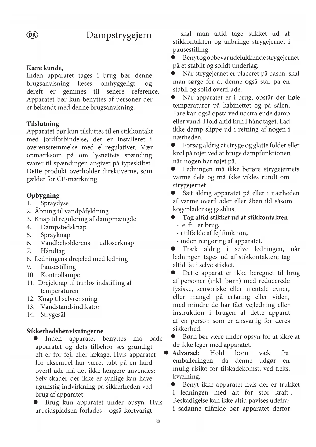 Dampstrygejern Kære kunde, Inden apparatet tages i brug bør denne brugsanvisning læses omhyggeligt, og dere er gemmes til senere reference. Apparatet bør kun benyttes af personer der er bekendt med denne brugsanvisning. Tilslutning Apparatet bør kun tilsluttes til en stikkontakt med jordforbindelse, der er installeret i overensstemmelse med el-regulativet. Vær opmærksom på om lysnettets spænding svarer til spændingen angivet på typeskiltet. Dette produkt overholder direktiverne, som gælder for CE-mærkning. Opbygning