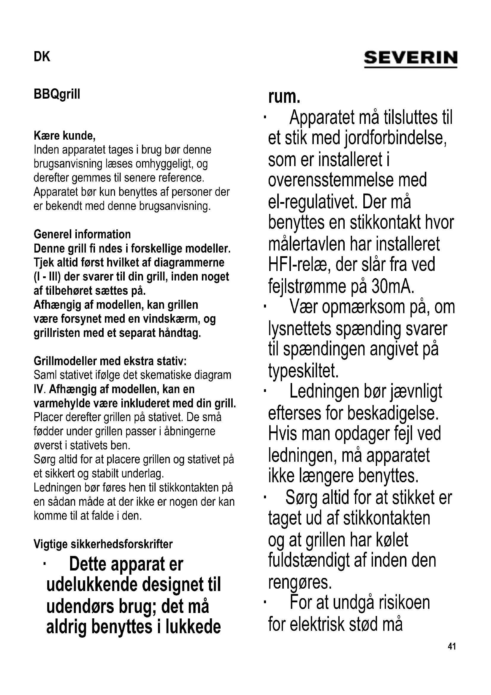 varmehylde være inkluderet med din grill. Placer derefter grillen på stativet. De små fødder under grillen passer i åbningerne øverst i stativets ben. Sørg altid for at placere grillen og stativet på et sikkert og stabilt underlag. Ledningen bør føres hen til stikkontakten på en sådan måde at der ikke er nogen der kan komme til at falde i den. Vigtige sikkerhedsforskrifter ∙ Dette apparat er udelukkende designet til udendørs brug; det må aldrig benyttes i lukkede rum. ∙ Apparatet må tilsluttes til et stik med jordforbindelse, som er installeret i overensstemmelse med el-regulativet. Der må benyttes en stikkontakt hvor målertavlen har installeret HFI-relæ, der slår fra ved fejlstrømme på 30mA. ∙ Vær opmærksom på, om lysnettets spænding svarer til spændingen angivet på typeskiltet. ∙ Ledningen bør jævnligt efterses for beskadigelse. Hvis man opdager fejl ved ledningen, må apparatet ikke længere benyttes. ∙ Sørg altid for at stikket er taget ud af stikkontakten og at grillen har kølet fuldstændigt af inden den rengøres. ∙ For at undgå risikoen for elektrisk stød må DK42 varmeelementet og ledningen aldrig nedsænkes i nogen form for væske og heller komme i kontakt med den. ∙ Rengør grillristen med varmt sæbevand. Detaljeret information om rengøring af apparatet fi ndes i afsnittet om Rengøring og vedligehold. ∙ Apparatet er ikke beregnet til brug ved hjælp af en ekstern timer eller et separat fjernstyringssystem. ∙ Benyt under ingen omstændigheder grillkul, eller andre faste eller fl ydende brændbare stoffer til at opvarme grillen. ∙ Dæk aldrig grillristen med stanniol, grilltallerkener eller andre ting, da den deraf følgende overophedning kan beskadige grillen. ∙ Billedet viser hvor meget vand der bør hældes ned i grillpandens vandreservoir. ∙ Dette apparat kan benyttes af børn (som er mindst 8 år) og af personer med reducerede fysiske, sensoriske eller mentale evner, eller mangel på erfaring eller viden, såfremt de har fået vejledning og instruktion i brugen af dette apparat og fuldt ud forstår alle farer og forholdsregler vedrørende sikkerheden som brug af apparatet medfører. ∙ Børn må aldrig få lov til at lege med apparatet. ∙ Børn må aldrig få lov til at udføre rengørings- eller vedligeholdelsesarbejde på dette apparat, medmindre de er under opsyn og mindst 8 år gamle. ∙ Apparatet og dets ledning må altid holdes væk fra43 børn som er yngre en 8 år. ∙ Advarsel: Hold børn væk fra emballeringen, da denne udgør en mulig risiko for tilskadekomst, ved f.eks. kvælning. ∙ Inden apparatet benyttes må både apparatet og dets tilbehør ses grundigt efter for fejl. Hvis apparatet for eksempel har været tabt på en hård overfl ade må det ikke længere anvendes: Selv skader der ikke er synlige kan have ugunstig indvirkning på sikkerheden ved brug af apparatet. ∙ Under brug må grillen placeres på et varmefast underlag, der tåler stænk og sprøjt. Hvis der tilberedes mad med et højt fedt- eller fugtindhold, kan stænk ikke undgås. ∙ Placer ikke grillen tæt på en væg eller i et hjørne, og sørg for at der aldrig er brændbare materialer i nærheden af den. ∙ Husk på at fødevarer med højt fedt- eller olieindhold er let antændelige; fyld derfor altid vandreservoiret med vand før brug. Tilslut ikke grillen til lysnettet førend reservoiret er blevet fyldt med vand. ∙ Vandet hjælper til med at nedkøle grillen, formindsker røgudviklingen og letter rengøringen efter brug. ∙ Sørg for at vandstanden i grillens reservoir hele tiden holdes mellem ’Min.’ og ’Max.’ markeringerne under brug. – Max. vandstandsindikator – Min. vandstandsindikator Sørg for altid at holde vandstanden over ’Min.’ markeringen. Der må tilsættes mere vand i god tid, og man skal sørge for at det ikke kommer i forbindelse med varmeelementet. Advarsel: Afbryd grillen fra strømforsyningen inden der tilføres mere vand. ∙ Inden grillen benyttes skal man altid se efter om varmeelementet er korrekt indsat i vandreservoiret og kabinettet. ∙ Barbecue grillen må aldrig efterlades uden opsyn når den er tændt. ∙ Husk altid på at grillens fl ader, varmeelementet og grillristen bliver meget varme under brug. Selv om varmeelementet er blevet slukket, må man ikke røre ved det førend det har kølet tilstrækkelig af – det udgør en stor risiko for forbrænding. ∙ For at undgå risikoen for elektrisk stød må varmeelementet og ledningen aldrig nedsænkes i nogen form for væske og heller komme i kontakt med den. ∙ Lad ikke ledningen komme i berøring med nogle af apparatets varme dele. ∙ Tag altid stikket ud af stikkontakten - inden grillpanden fyldes med vand, - efter brug, - i tilfælde af fejlfunktion, - inden apparatet rengøres. ∙ Brug af forlængerledning giver krafttab, eventuelt også en deraf følgende varmeopbygning i ledningen. Det er derfor vigtigt at vikle ledningen helt ud hvis man benytter forlængerledning. Sørg også for kun at benytte en forlængerledning der er godkendt for udendørs brug. ∙ Advarsel: Flyt aldrig grillen når den er i brug. Sørg altid for at grillen har kølet tilstrækkeligt af inden den bæres, fl yttes44 eller sættes væk. Hæld overskydende vand ud efter brug. ∙ Opbevar aldrig grillen udendørs eller på steder hvor den kan blive udsat for store temperaturforskelle eller høj fugtighed. ∙ Vi påtager os intet ansvar for skader, som skyldes misbrug eller manglende overholdelse af denne brugsanvisning. ∙ Denne grill er kun beregnet til privat brug, og ikke til erhvervsmæssig anvendelse. ∙ For at undgå farer, og overholde sikkerhedsbestemmelserne, skal reparation af dette elektriske apparat eller dets ledning, altid udføres af vores kundeservice. Hvis reparation er nødvendig, skal apparatet sendes til vores afdeling for kundeservice (se tillæg). ∙ Dette produkt overholder direktiverne som gælder for CE-mærkning. 