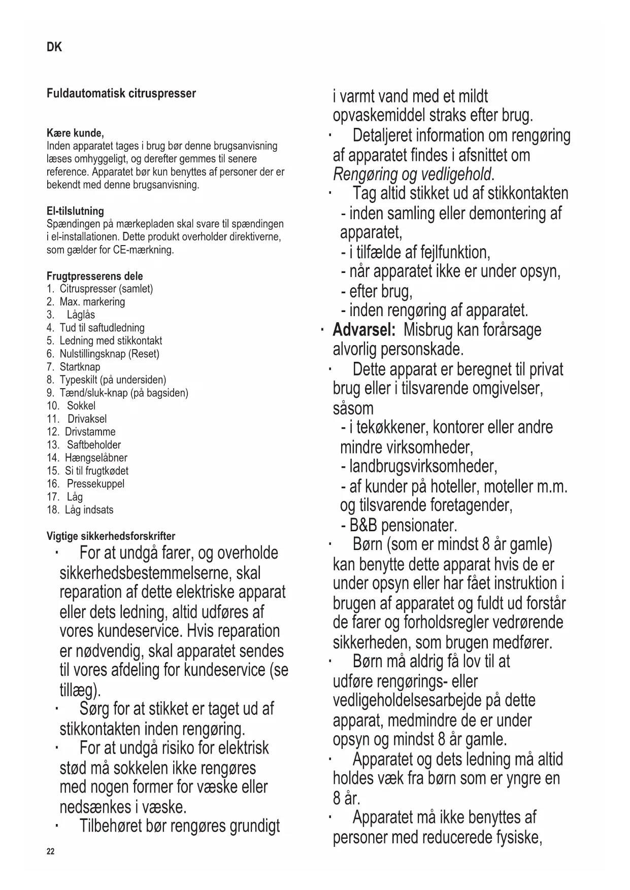 For at undgå farer, og overholde sikkerhedsbestemmelsene, skal reparation af dette elektriske apparat ell er dets ledning, altid udfores af vores kundeservice. Hvis reparation er nødvendig, skal apparatet sendest til vores afdeling for kundeservice (setillæg).