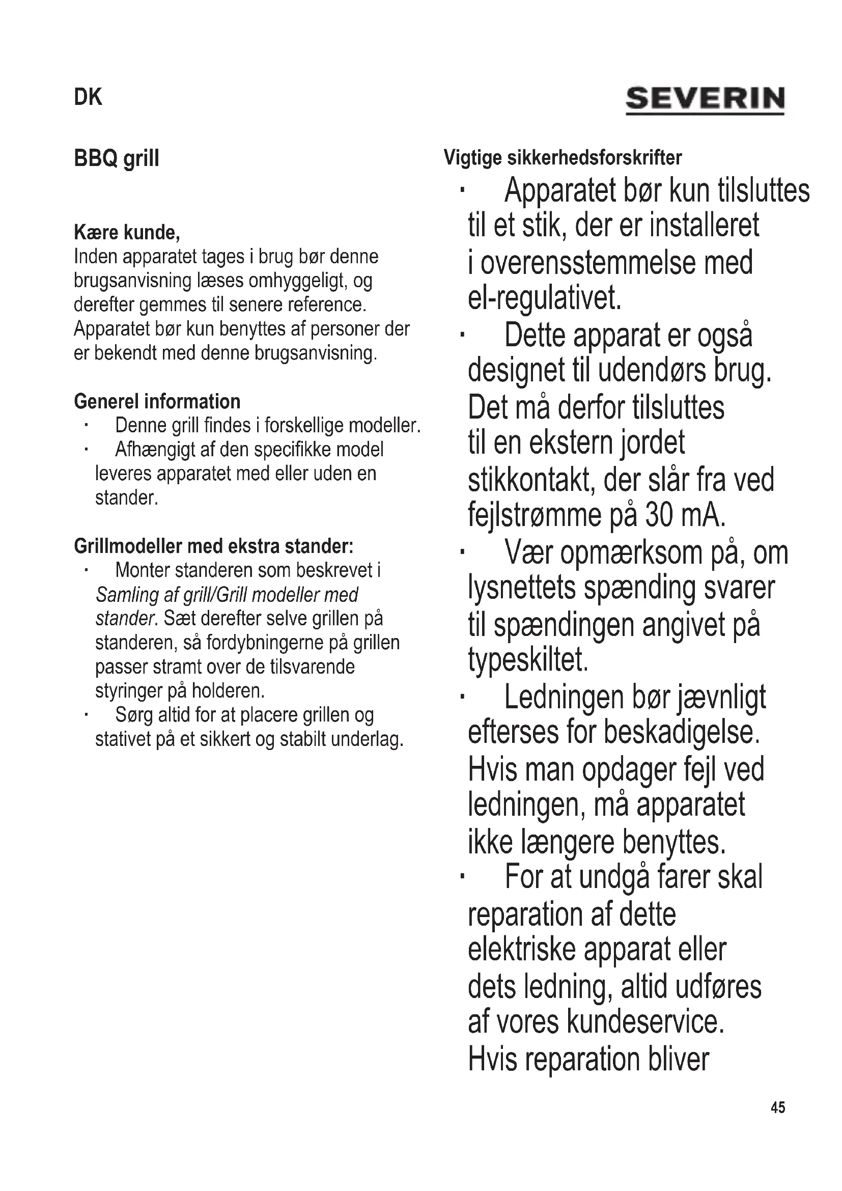 tilsvarende foretagender, - B&B pensionater. ∙ Dette apparat kan benyttes af børn (som er mindst 8 år) og af personer med reducerede fysiske, sensoriske eller mentale evner, eller mangel på erfaring eller viden, såfremt de har fået vejledning og instruktion i brugen af dette apparat og fuldt ud forstår alle farer og forholdsregler vedrørende sikkerheden som brug af apparatet medfører. ∙ Børn må aldrig få lov til at lege med apparatet. ∙ Børn må aldrig få lov til at udføre rengørings- eller vedligeholdelsesarbejde på dette apparat, medmindre de er under opsyn og mindst 8 år gamle. ∙ Apparatet og dets ledning må altid holdes væk fra børn som er yngre en 8 år. ∙ Advarsel: Hold børn væk fra emballeringen, da denne udgør en mulig risiko for tilskadekomst, ved f.eks. kvælning. ∙ Advarsel: Dæk aldrig under nogen omstændigheder grillpanden helt med stanniol, grilltallerkener eller andre ting, da den deraf følgende overophedning kan forårsage uoprettelig skade på grillen. ∙ Inden apparatet benyttes må både apparatet og dets tilbehør ses grundigt efter for fejl. Hvis apparatet for eksempel har været tabt på en hård overade må det ikke længere anvendes: Selv skader der ikke er synlige kan have ugunstig indvirkning på sikkerheden ved brug af apparatet. I sådanne tilfælde, kontakt vores kundeservice. ∙ Under brug må grillen placeres på et varmefast underlag, der tåler stænk og sprøjt. Hvis der tilberedes mad med et højt fedt- eller fugtindhold, kan stænk ikke undgås. ∙ Grillmodeller med stander: Sørg altid for at placere grillen og standeren på et sikkert og stabilt underlag. ∙ Monter ikke læskærmen hvis grillen benyttes indendørs. ∙ Ledningen bør føres hen til stikkontakten på en sådan måde, at der ikke er nogen, der kan komme til at falde i den. ∙ Placer ikke grillen tæt på en væg eller i et hjørne, og sørg for at der aldrig er brændbare materialer i nærheden af den. ∙ Inden grillen benyttes, skal man altid48 104 x 142 mm sørge for at drypbakken er sat rigtigt på plads i grillen. ∙ Barbecue grillen må aldrig efterlades uden opsyn, når den er tændt. ∙ Lad ikke ledningen komme i berøring med nogle af apparatets varme dele. ∙ Tag altid stikket ud af stikkontakten - efter brug, - i tilfælde af fejlfunktion, - inden apparatet rengøres. ∙ Træk aldrig i selve ledningen, når ledningen tages ud af stikkontakten; tag altid fat i selve stikket. ∙ Brug af forlængerledning giver krafttab, eventuelt også en deraf følgende varmeopbygning i ledningen. Det er derfor vigtigt at vikle ledningen helt ud hvis man benytter forlængerledning. En kabeltromle kan anvendes i et beskyttet udendørs område, men det skal være af en type godkendt til dette formål. ∙ Advarsel: Flyt aldrig grillen når den er i brug. Sørg altid for at grillen har kølet tilstrækkeligt af inden den bæres, yttes eller sættes væk. ∙ Opbevar aldrig grillen udendørs eller på steder hvor den kan blive udsat for store temperaturforskelle eller høj fugtighed. ∙ Vi påtager os intet ansvar for skader, som skyldes misbrug eller manglende overholdelse af denne brugsanvisning. ∙ Dette produkt overholder direktiverne som gælder for CE-mærkning. Oversigt og medfølgende dele