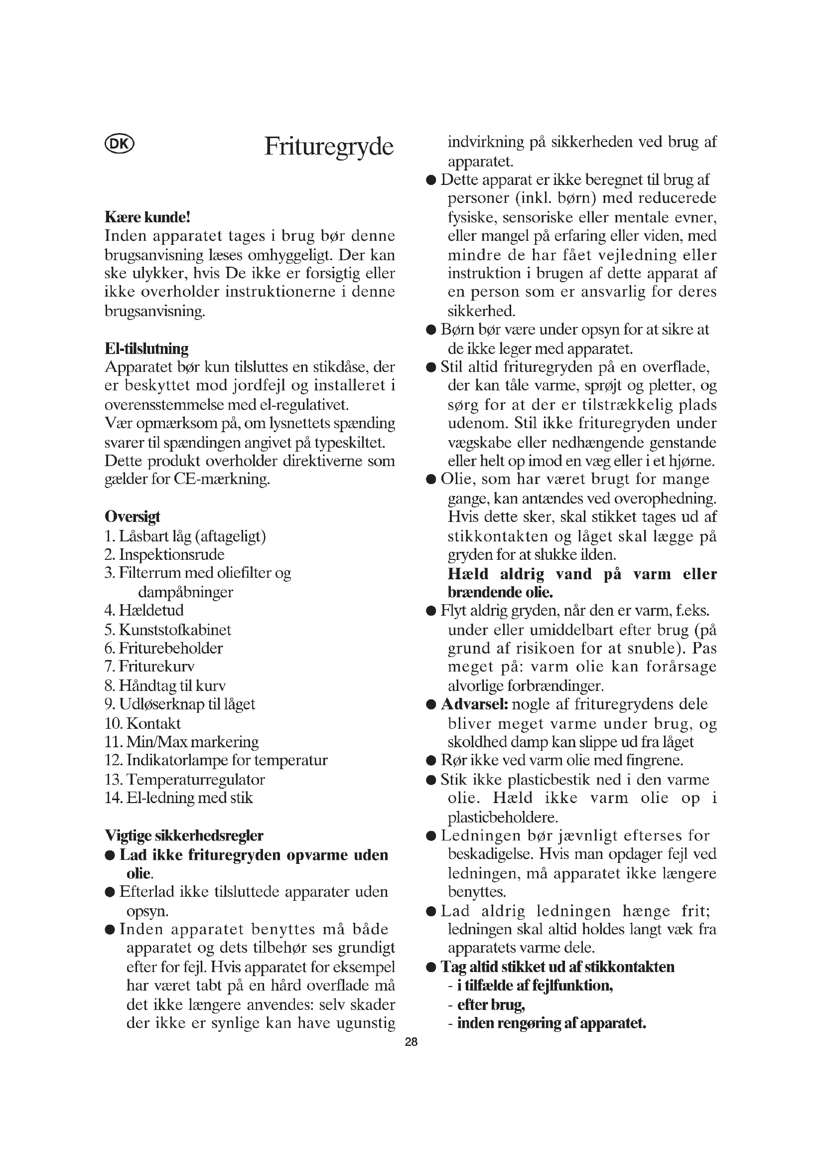 Vigtige sikkerhedsregler ● Lad ikke frituregryden opvarme uden olie. ● Efterlad ikke tilsluttede apparater uden opsyn. ● Inden apparatet benyttes må både apparatet og dets tilbehør ses grundigt efter for fejl. Hvis apparatet for eksempel har været tabt på en hård overflade må det ikke længere anvendes: selv skader der ikke er synlige kan have ugunstig indvirkning på sikkerheden ved brug af apparatet. ● Dette apparat er ikke beregnet til brug af personer (inkl. børn) med reducerede fysiske, sensoriske eller mentale evner, eller mangel på erfaring eller viden, med mindre de har fået vejledning eller instruktion i brugen af dette apparat af en person som er ansvarlig for deres sikkerhed. ● Børn bør være under opsyn for at sikre at de ikke leger med apparatet. ● Stil altid frituregryden på en overflade, der kan tåle varme, sprøjt og pletter, og sørg for at der er tilstrækkelig plads udenom. Stil ikke frituregryden under vægskabe eller nedhængende genstande eller helt op imod en væg eller i et hjørne. ● Olie, som har været brugt for mange gange, kan antændes ved overophedning. Hvis dette sker, skal stikket tages ud af stikkontakten og låget skal lægge på gryden for at slukke ilden. Hæld aldrig vand på varm eller brændende olie. ● Flyt aldrig gryden, når den er varm, f.eks. under eller umiddelbart efter brug (på grund af risikoen for at snuble). Pas meget på: varm olie kan forårsage alvorlige forbrændinger. ● Advarsel: nogle af frituregrydens dele bliver meget varme under brug, og skoldhed damp kan slippe ud fra låget ● Rør ikke ved varm olie med fingrene. ● Stik ikke plasticbestik ned i den varme olie. Hæld ikke varm olie op i plasticbeholdere. ● Ledningen bør jævnligt efterses for beskadigelse. Hvis man opdager fejl ved ledningen, må apparatet ikke længere benyttes. ● Lad aldrig ledningen hænge frit; ledningen skal altid holdes langt væk fra apparatets varme dele. ● Tag altid stikket ud af stikkontakten - i tilfælde af fejlfunktion, - efter brug, - inden rengøring af apparatet.