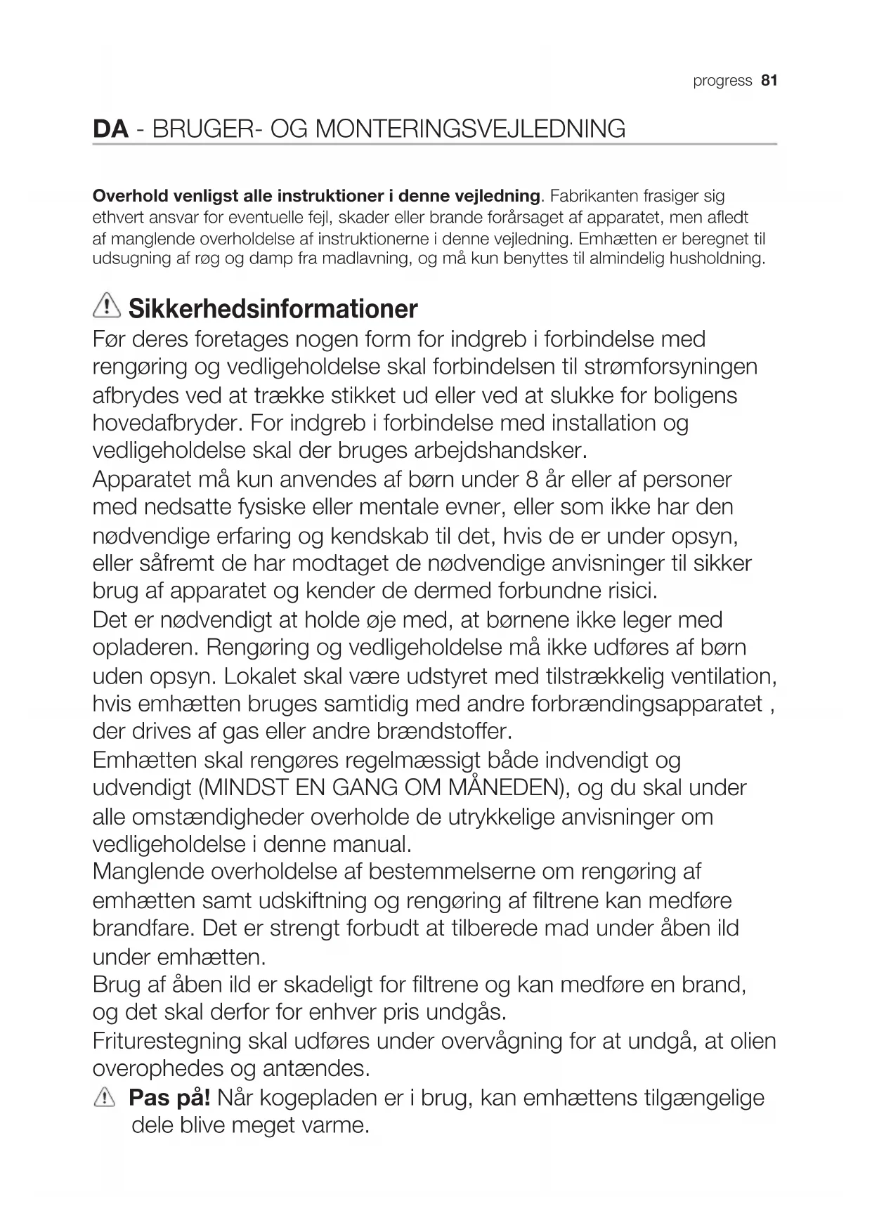 Overhold venligst alle instruktioner i denne vejledning. Fabrikanten frasiger sig ethvert ansvar for eventuelle fejl, skader eller brande forårsaget af apparatet, men aedt af manglende overholdelse af instruktionerne i denne vejledning. Emhætten er beregnet til udsugning af røg og damp fra madlavning, og må kun benyttes til almindelig husholdning. Sikkerhedsinformationer Før deres foretages nogen form for indgreb i forbindelse med rengøring og vedligeholdelse skal forbindelsen til strømforsyningen afbrydes ved at trække stikket ud eller ved at slukke for boligens hovedafbryder. For indgreb i forbindelse med installation og vedligeholdelse skal der bruges arbejdshandsker. Apparatet må kun anvendes af børn under 8 år eller af personer med nedsatte fysiske eller mentale evner, eller som ikke har den nødvendige erfaring og kendskab til det, hvis de er under opsyn, eller såfremt de har modtaget de nødvendige anvisninger til sikker brug af apparatet og kender de dermed forbundne risici. Det er nødvendigt at holde øje med, at børnene ikke leger med opladeren. Rengøring og vedligeholdelse må ikke udføres af børn uden opsyn. Lokalet skal være udstyret med tilstrækkelig ventilation, hvis emhætten bruges samtidig med andre forbrændingsapparatet , der drives af gas eller andre brændstoffer. Emhætten skal rengøres regelmæssigt både indvendigt og udvendigt (MINDST EN GANG OM MÅNEDEN), og du skal under alle omstændigheder overholde de utrykkelige anvisninger om vedligeholdelse i denne manual. Manglende overholdelse af bestemmelserne om rengøring af emhætten samt udskiftning og rengøring af filtrene kan medføre brandfare. Det er strengt forbudt at tilberede mad under åben ild under emhætten. Brug af åben ild er skadeligt for filtrene og kan medføre en brand, og det skal derfor for enhver pris undgås. Friturestegning skal udføres under overvågning for at undgå, at olien overophedes og antændes. Pas på! Når kogepladen er i brug, kan emhættens tilgængelige dele blive meget varme.82 progress Sikkerhedsinstruktioner Ved udskiftning af pæren må du kun anvendes den type lyspære, der er angivet i afsnittet om vedligeholdelse/udskiftning af pære i denne manual. Pas på! Apparatet må ikke tilsluttes strømforsyningen, før installationen er helt fuldført. Hvad angår de anviste tekniske og sikkerhedsmæssige forholdsregler til udledning af røg, skal du omhyggeligt overholde de lokale myndigheders forskrifter. Den udsugede luft må ikke tilføres en skakt, der bruges til udledning af røg fra forbrændingsapparater, der fungerer med gas eller andre brændstoffer. Du må ikke bruge eller efterlade emhætten uden korrekt monterede pærer for at undgå en risiko for elektrisk stød. Brug aldrig emhætten uden en korrekt monteret rist! Emhættens overflade må ALDRIG anvendes som afsætningsplade, med mindre dette er udtrykkeligt angivet. Brug kun de medfølgende fastspændingsskruer til produktet i forbindelse med installationen eller – såfremt de ikke medfølger – skal du indkøbe den korrekte type skruer. Brug skruer af korrekt længde, som anført i installationsvejledningen. I tvivlstilfælde bør du kontakte dit autoriserede servicecenter eller en kvalificeret tekniker. Pas på! Hvis der ikke monteres de skruer og fastspændingsanordninger som angivet i disse anvisninger, kan der opstå risiko for elektriske problemer. Miljøhensyn Genbrug materialer med symbolet . Anbring emballagematerialet i passende beholdere til genbrug. Hjælp med at beskytte miljøet og menneskelig sundhed samt at genbruge affald af elektriske og elektroniske apparater. Kasser ikke apparater, der er mærket med symbolet , sammen med husholdningsaffaldet. Lever produktet tilbage til din lokale genbrugsplads eller kontakt din kommune. Anvendelse Emhætten er udviklet til brug i den sugende udgave med ekstern udledning eller i den filtrerende udgave med intern recirkulation . Installering Netspændingen skal svare til spændingen vist på typeskiltet internt i emhætten. Hvis emhætten er udstyret med et stik, skal emhætten tilsluttes en let tilgængelig stikkontakt, der er i overensstemmelse med de gældende standarder. Stikkontakten skal også være let tilgængelig efter installeringen. Hvis emhætten ikke er udstyret med et stik (direkte tilslutning til elnettet), eller hvis stikket ikke findes i et område, der også er let tilgængeligt efter installeringen, skal der monteres en topolet afbryderkontakt i overensstemmelse med standarderne, der sørger for fuld afbrydelse fra elnettet i tilfælde af forhold i overspændingskategori III, og i overensstemmelse med reglerne for elektriske installationer. Obs! Undersøg altid, at netkablet er blevet monteret rigtigt, før emhættens kredsløb tilsluttes forsyningsnettet og der udføres kontrol af korrekt funktion.progress 83 Minimumsafstanden mellem kogegrejets støtteoverflade på komfuret og den nederste del af emhætten må ikke være under 45cm ved elektriske kogeplader, og ikke under 55cm ved gasblus eller komfurer med både gasblus og elektriske kogeplader. Hvis gaskomfurets vejledning angiver en større afstand, skal dette overholdes. Vedligeholdelse Obs! Inden der udføres nogen form for rengøring eller vedligeholdelse skal emhætten afbrydes fra elnettet ved at fjerne stikket fra stikkontakten, eller ved at afbryde hjemmets hovedafbryder. Emhætten skal rengøres jævnligt både på ydersiden og på indersiden (mindst med samme frekvens som for vedligeholdelse af fedtfiltrene). Ved rengøring skal man anvende en klud fugtet med neutrale, milde rengøringsmidler i flydende form. Undgå brug af produkter indeholdende slibemidler BENYT ALDRIG SPRIT! Pas på! Manglende overholdelse af vejledningen til rengøring af apparatet og udskiftning af filtrene medfører brandfare. Der henstilles således til, at instruktionerne følges. Fabrikanten frasiger sig ethvert ansvar for eventuel beskadigelse af motoren, brande forårsaget a