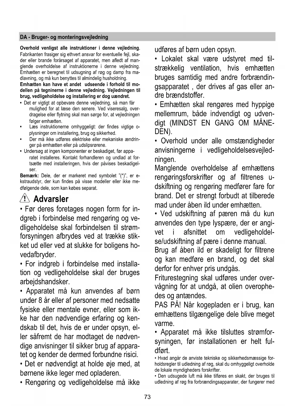 Montera tillbaka gallret. I det fall belysningen inte fungerar, kontrollera att lamporna är korrekt iskruvade i sitt säte innan ni kontaktar det tekniska servicekontoret.73 DA - Bruger- og monteringsvejledning Overhold venligst alle instruktioner i denne vejledning. Fabrikanten frasiger sig ethvert ansvar for eventuelle fejl, ska- der eller brande forårsaget af apparatet, men afledt af man- glende overholdelse af instruktionerne i denne vejledning. Emhætten er beregnet til udsugning af røg og damp fra ma- dlavning, og må kun benyttes til almindelig husholdning. Emhætten kan have et andet udseende i forhold til mo- dellen på tegninerne i denne vejledning. Vejledningen til brug, vedligeholdelse og installering er dog uændret.