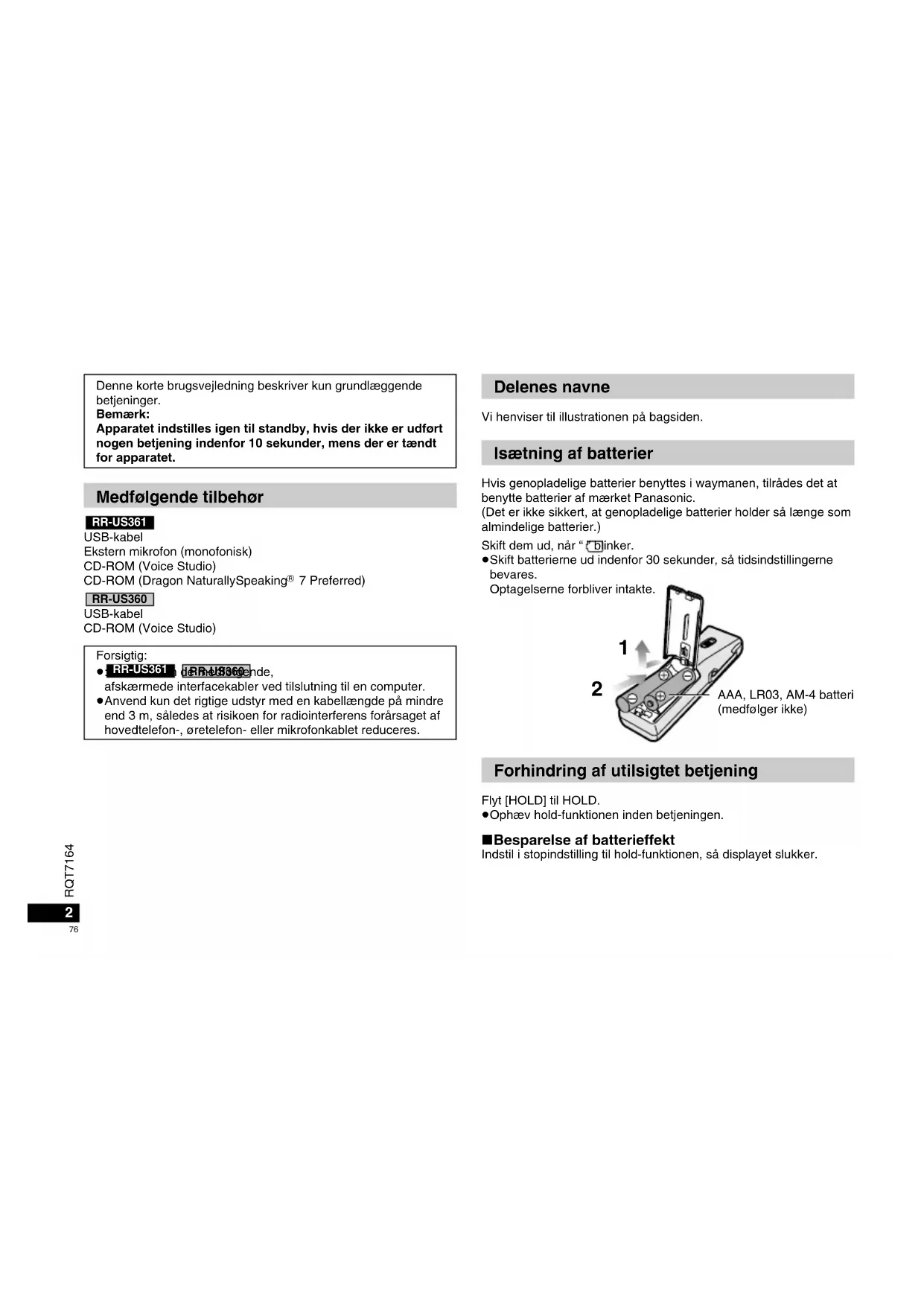 7 Preferred) USB-kabel CD-ROM (Voice Studio) RR-US360 RR-US361 Forsigtig: ≥ : Anvend kun de medfølgende, afskærmede interfacekabler ved tilslutning til en computer. ≥Anvend kun det rigtige udstyr med en kabellængde på mindre end 3 m, således at risikoen for radiointerferens forårsaget af hovedtelefon-, øretelefon- eller mikrofonkablet reduceres. RR-US360 RR-US361 Denne korte brugsvejledning beskriver kun grundlæggende betjeninger. Bemærk: Apparatet indstilles igen til standby, hvis der ikke er udført nogen betjening indenfor 10 sekunder, mens der er tændt for apparatet. Delenes navne Vi henviser til illustrationen på bagsiden. Isætning af batterier Hvis genopladelige batterier benyttes i waymanen, tilrådes det at benytte batterier af mærket Panasonic. (Det er ikke sikkert, at genopladelige batterier holder så længe som almindelige batterier.) Skift dem ud, når “ ” blinker. ≥Skift batterierne ud indenfor 30 sekunder, så tidsindstillingerne bevares. Optagelserne forbliver intakte. Forhindring af utilsigtet betjening Flyt [HOLD] til HOLD. ≥Ophæv hold-funktionen inden betjeningen. ∫ Besparelse af batterieffekt Indstil i stopindstilling til hold-funktionen, så displayet slukker. AAA, LR03, AM-4 batteri (medfølger ikke)