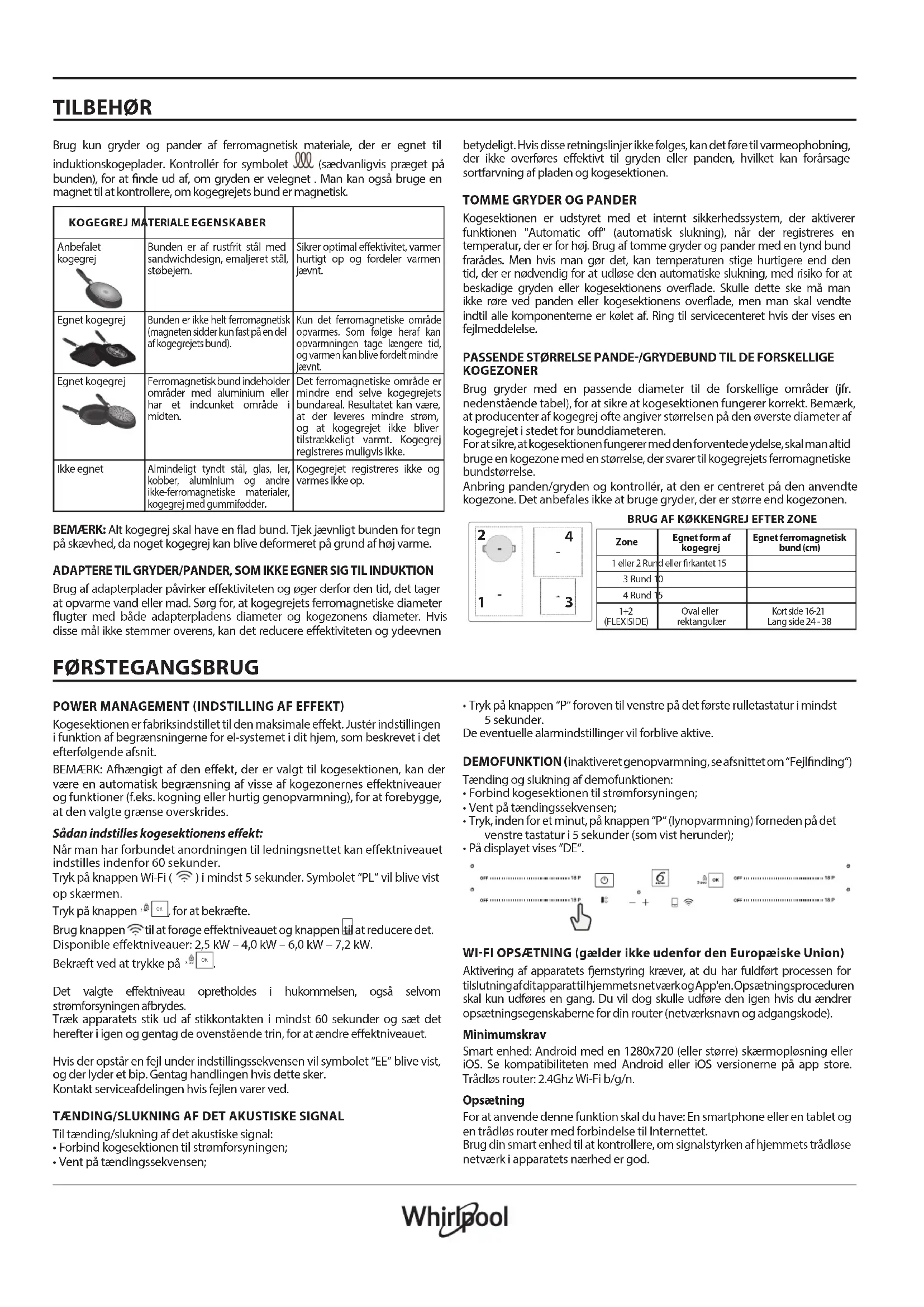 Få mere ud af dine varme kogepladers restvarme, ved at slukke dem et par minutter før tilberedningen er færdig. Bunden på din gryde eller pande bør dække hele kogepladen; kogegrej, som er mindre end kogepladen, vil medføre spild af energi. Dæk dine gryder og pander til med tætsluttende låg under tilberedningen, og brug så lidt vand som muligt. Tilberedning uden låg forøger energiforbruget i betragteligt omfang. Brug kun kogegrej med ad bund. OVERENSSTEMMELSESERKLÆRING Dette apparat opfylder kravene til miljøvenligt design i den europæiske forordning 66/2014 og 2019 Forordninger om miljøvenligt design af energirelaterede produkter (Ændring) (Udtræden af EU), i overensstemmelse med den Europæiske standard EN 60350-2. Oplysningerne om apparatets lavenergitilstand i overensstemmelse med forordning (EU) 2023/826 kan ndes i følgende link: https://docs. emeaappliance-docs.eu. BEMÆRK Bærere af en pacemaker eller lignende medicinsk udstyr bør være forsigtige i nærheden af denne induktionskogeplade, når den er tændt. Det elektromagnetiske felt kan påvirke pacemakere eller lignende udstyr. Kontakt din læge eller fabrikanten af pacemakeren eller andet medicinsk udstyr, for at indhente yderligere oplysninger om induktionskogepladens elektromagnetiske felters påvirkning af udstyret. Fabrikanten, Whirlpool Management Emea S.r.l., erklærer at denne I100 EMEA model af husholdningsapparater med radioudstyr stemmer overens med direktiv 2014/53/EU og med forskrifterne for radioudstyr 2017. Overensstemmelseserklæringens fulde ordlyd ndes på det følgende website: https://docs.whirlpool.eu. Radioudstyret fungerer på 2.4 GHz ISM frekvensbåndet, den maksimale radiofrekvenseekt, der udsendes, overstiger ikke 20 dBm (e.i.r.p.). Dette produkt inkluderer visse open source-software udviklet af tredjeparter. Licensbetingelserne for disse open source-software ndes på det følgende website: https://docs.whirlpool.eu.TILSLUTNING TIL STRØMFORSYNINGEN Den elektriske forbindelse skal udføres, før apparatet sluttes til strømforsyningen. Installationen skal udføres af kvaliceret personale, der har kendskab til de aktuelle regulativer vedrørende sikkerhed og installation. Det er særdeles vigtigt, at installationen udføres i overensstemmelse med reguleringerne fra den lokale elvirksomhed. Kontroller, at spændingen på typepladen, der er anbragt på bunden af apparatet, svarer til spændingen, der hvor apparatet installeres. Dette apparat skal ekstrabeskyttes, jvf. stærkstrømsreglementet: Brug udelukkende isolering (inklusiv jordisolering) i den korrekte størrelse. blue-blu-azul-azul-μπλε-sinine-zila-mėlyna-niebieski-blau-bleu-blauw-albastru-синьо-плава-modro- plava-синий-синій-көк-modrý-modrý-kék-blå-sininen-blå-blåt-mavi-gorm- blár