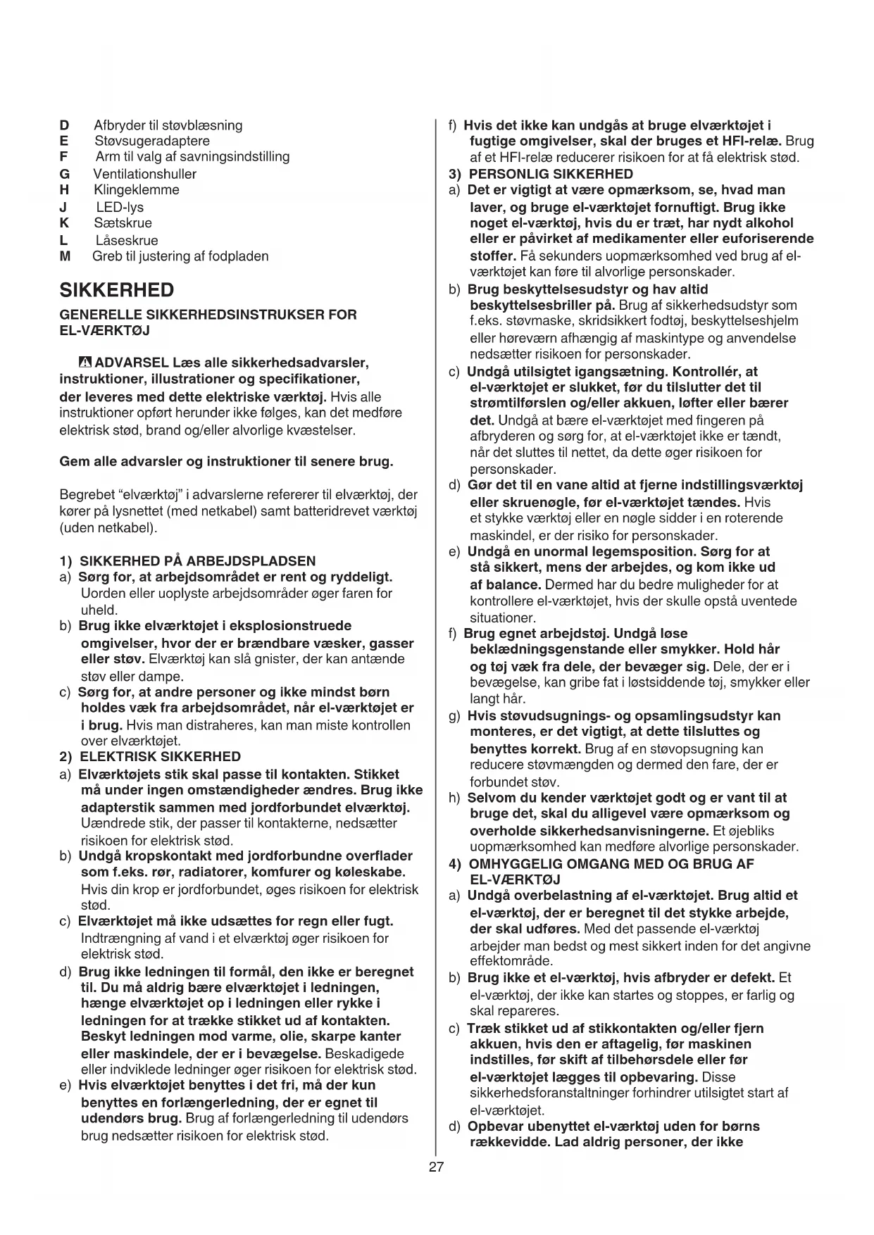 a) Undgå overbelastning af el-værktøjet. Brug altid et el-værktøj, der er beregnet til det stykke arbejde, der skal udføres. Med det passende el-værktøj arbejder man bedst og mest sikkert inden for det angivne eektområde. b) Brug ikke et el-værktøj, hvis afbryder er defekt. Et el-værktøj, der ikke kan startes og stoppes, er farlig og skal repareres. c) Træk stikket ud af stikkontakten og/eller fjern akkuen, hvis den er aftagelig, før maskinen indstilles, før skift af tilbehørsdele eller før el-værktøjet lægges til opbevaring. Disse sikkerhedsforanstaltninger forhindrer utilsigtet start af el-værktøjet. d) Opbevar ubenyttet el-værktøj uden for børns rækkevidde. Lad aldrig personer, der ikke D Afbryder til støvblæsning E Støvsugeradaptere F Arm til valg af savningsindstilling G Ventilationshuller H Klingeklemme J LED-lys K Sætskrue L Låseskrue M Greb til justering af fodpladen SIKKERHED