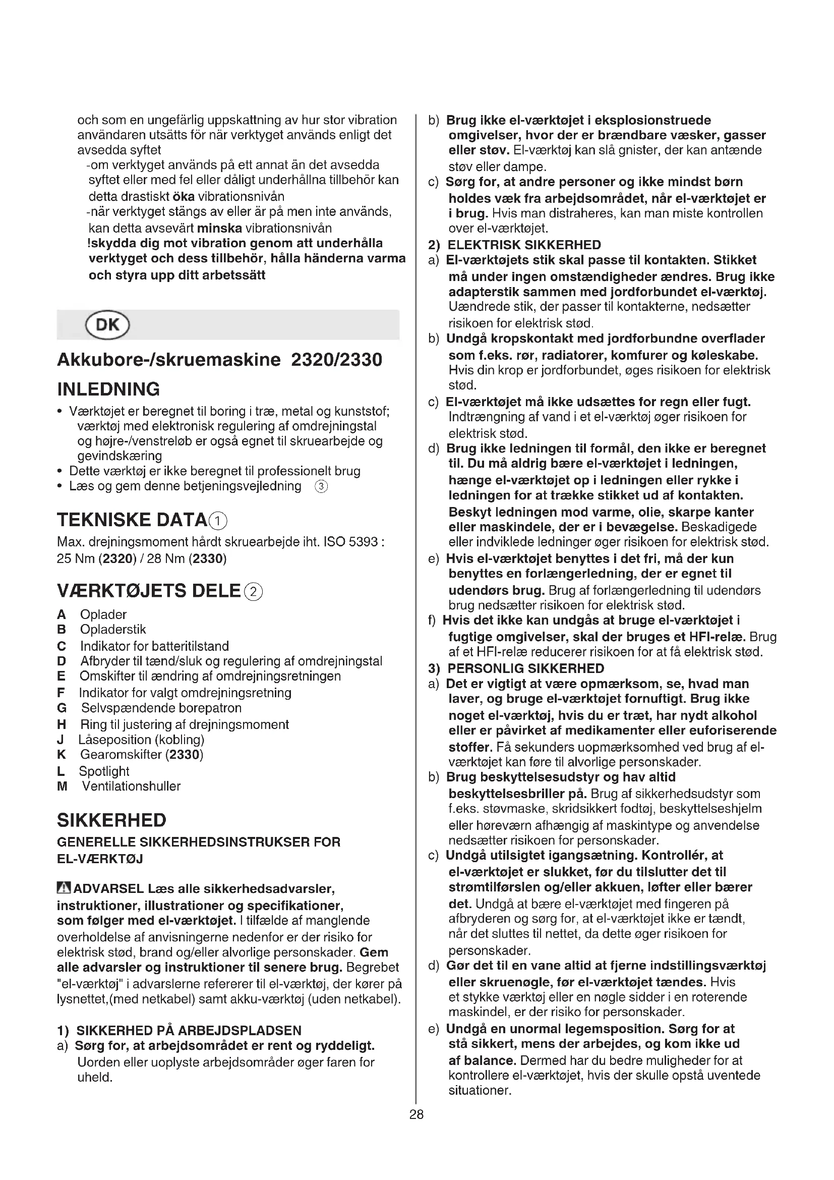 A Oplader B Opladerstik C Indikator for batteritilstand D Afbryder til tænd/sluk og regulering af omdrejningstal E Omskifter til ændring af omdrejningsretningen F Indikator for valgt omdrejningsretning G Selvspændende borepatron H Ring til justering af drejningsmoment J Låseposition (kobling) K Gearomskifter (2330) L Spotlight M Ventilationshuller SIKKERHED