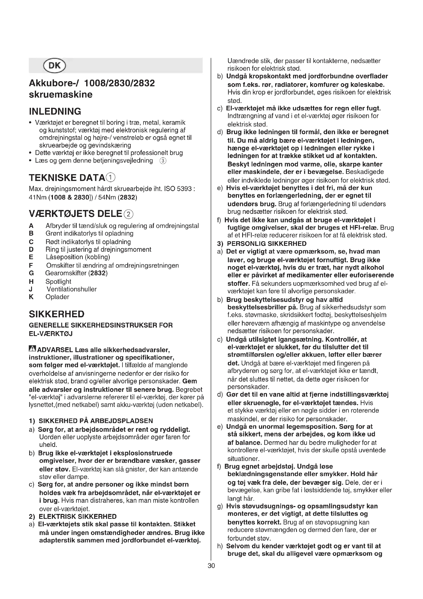 A Afbryder til tænd/sluk og regulering af omdrejningstal B Grønt indikatorlys til opladning C Rødt indikatorlys til opladning D Ring til justering af drejningsmoment E Låseposition (kobling) F Omskifter til ændring af omdrejningsretningen G Gearomskifter (2832) H Spotlight J Ventilationshuller K Oplader SIKKERHED