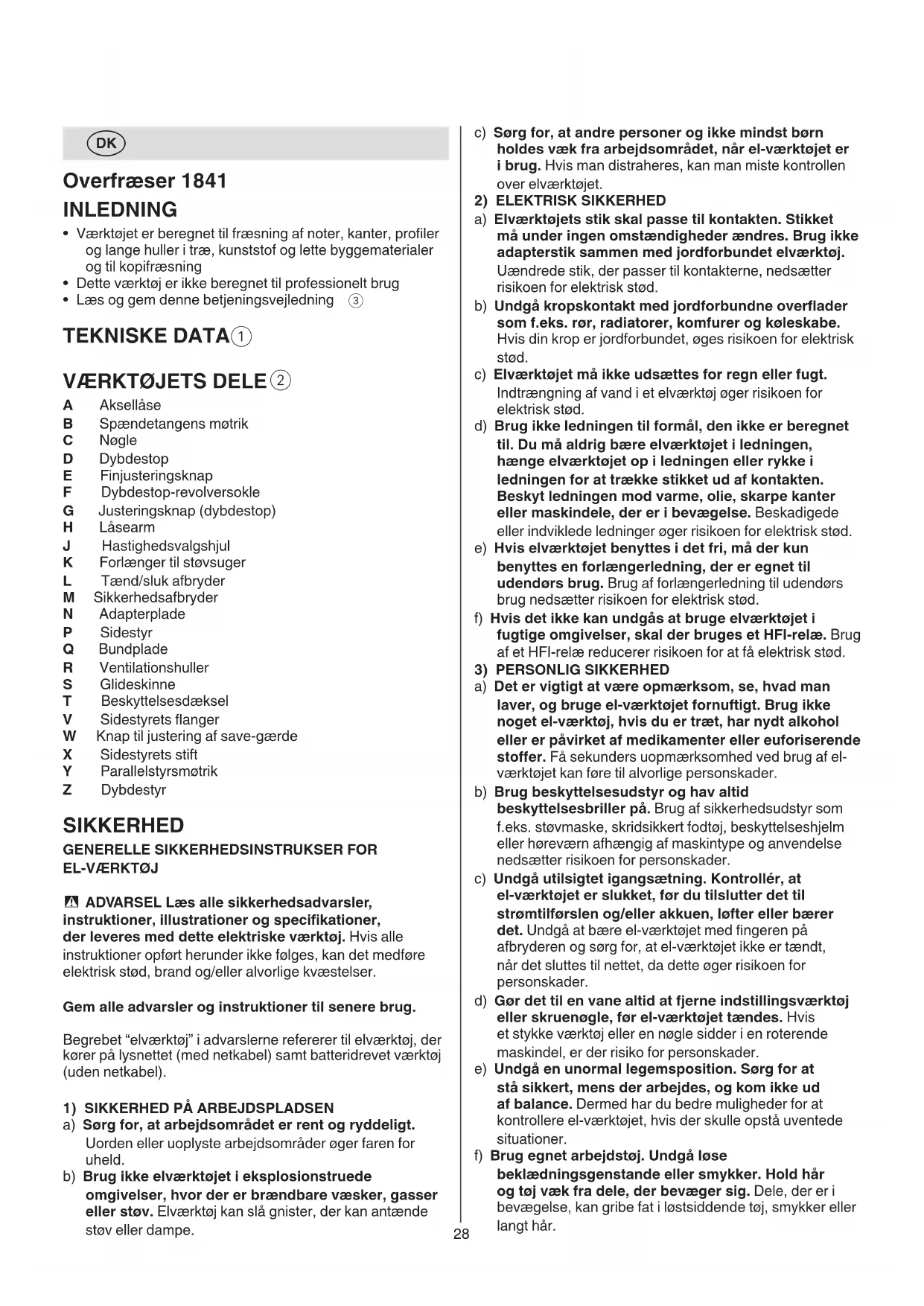 A Aksellåse B Spændetangens møtrik C Nøgle D Dybdestop E Finjusteringsknap F Dybdestop-revolversokle G Justeringsknap (dybdestop) H Låsearm J Hastighedsvalgshjul K Forlænger til støvsuger L Tænd/sluk afbryder M Sikkerhedsafbryder N Adapterplade P Sidestyr Q Bundplade R Ventilationshuller S Glideskinne T Beskyttelsesdæksel V Sidestyrets anger W Knap til justering af save-gærde X Sidestyrets stift Y Parallelstyrsmøtrik Z Dybdestyr SIKKERHED
