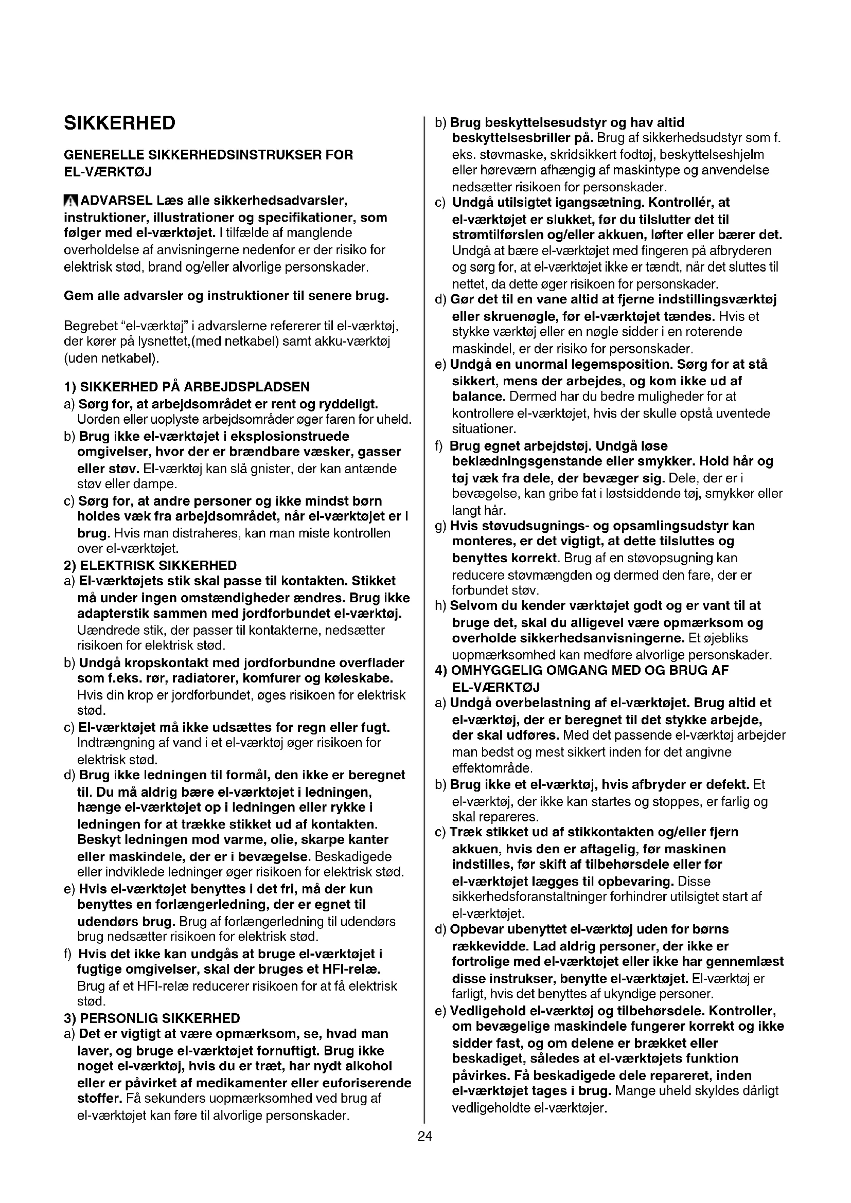 ADVARSEL Læs alle sikkerhedsadvarsler, instruktioner, illustrationer og specifikationer, som følger med el-værktøjet. I tilfælde af manglende overholdelse af anvisningerne nedenfor er der risiko for elektrisk stød, brand og/eller alvorlige personskader. Gem alle advarsler og instruktioner til senere brug. Begrebet “el-værktøj” i advarslerne refererer til el-værktøj, der kører på lysnettet,(med netkabel) samt akku-værktøj (uden netkabel).