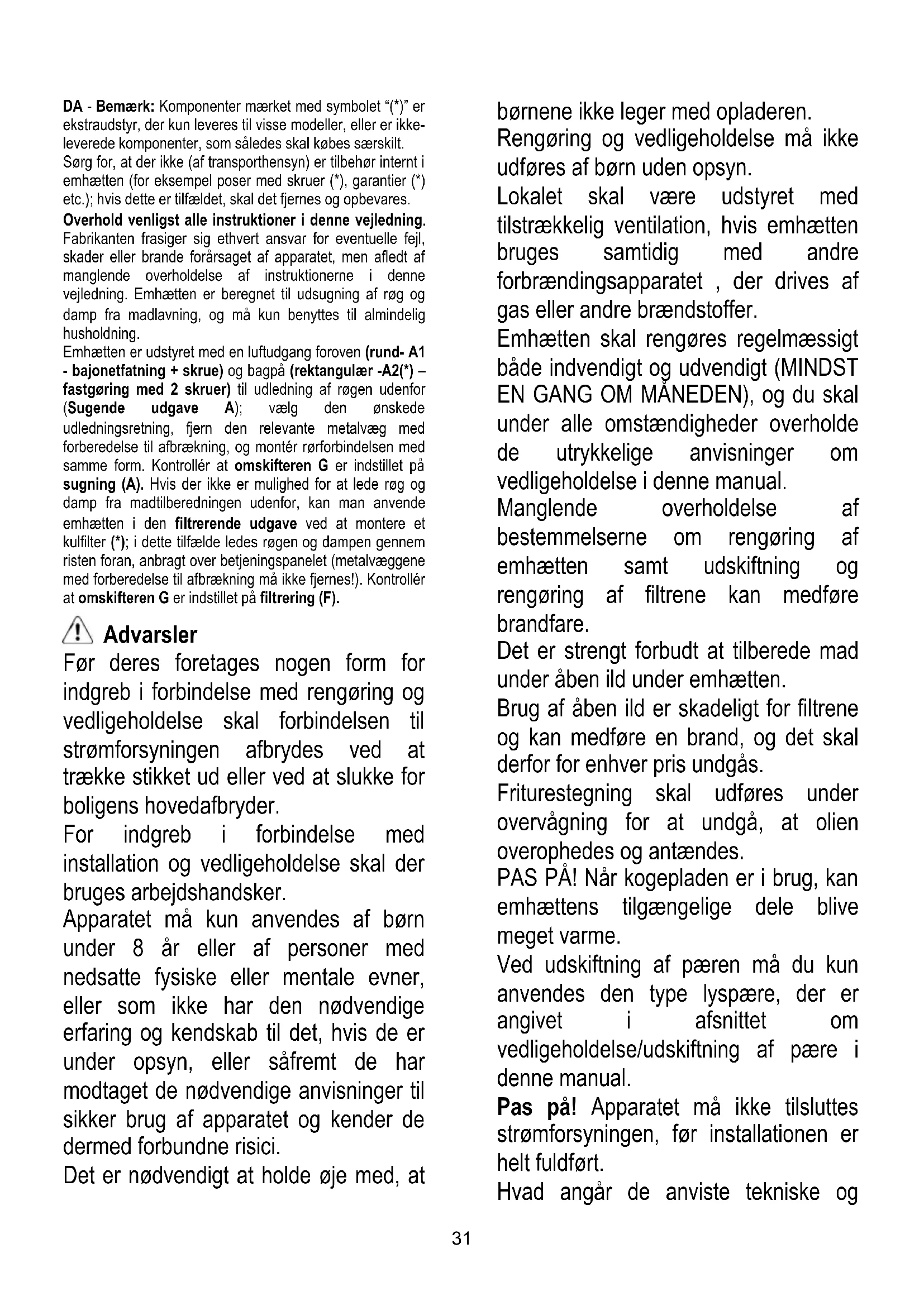 - EMC: EN 55014-1; CISPR 14-1; EN 55014-2; CISPR 14- 2; EN/IEC 61000-3-2; EN/IEC 61000-3-3. Suositukset oikeaa käyttöä varten ympäristövaikutusten vähentämiseksi: Kytke liesikupu päälle miniminopeudelle, kun aloitat kypsentämisen, ja pidä sitä päällä muutama minuutti kypsennyksen jälkeen. Nosta nopeutta vain, jos tilassa on runsaasti savua tai höyryä, ja käytä tehostettua/-ja nopeutta/nopeuksia vain erityistarpeessa. Vaihda aktiivihiilisuodatin/-suodattimet, kun haluat säilyttää hyvän hajujenpoistotehokkuuden. Puhdista rasvasuodatin/- suodattimet, kun haluat säilyttää hyvän rasvansuodatustehokkuuden. Käytä tässä oppaassa annetun kanavointijärjestelmän maksimiläpimittaa tehokkuuden parantamiseksi ja melun vähentämiseksi. Asennus Lieden keittotason tukipinnan ja keittiötuulettimen alimman osan välinen minimietäisyys on oltava vähintään 50cm sähköliesien osalta ja 65cm kaasu- ja sekaliesien osalta. Jos kaasulieden käyttöohjeissa vaaditaan suurempi etäisyys, on se otettava huomioon. Asennuksessa voidaan käyttää porausmallia (*). Sähköliitäntä Verkon jännitteen on oltava sama kuin tuulettimen sisäpuolella olevassa tyyppikilvessä ilmoitettu jännite. Jos laitteessa on pistoke, liitä tuuletin voimassaolevien normien mukaiseen pistorasiaan, joka sijaitsee sellaisessa paikassa, että siihen pääsee käsiksi myös asennuksen jälkeen. Jos laitteessa ei ole pistoketta (suora liitos verkkoon) tai pistoke ei ole sellaisessa paikassa että siihen pääsee käsiksi myös asennuksen jälkeen, käytä normien mukaista kaksinapaista katkaisijaa, jolla varmistetaan että laite saadaan kokonaan irti sähköverkosta, jos ylijännite kategoria on III, asennussääntöjen mukaisesti. Huomio! Tarkista aina, että verkkokaapeli on asennettu oikealla tavalla ennen kuin yhdistät tuulettimen sähköverkkoon ja tarkistat että se toimii oikein. Huomio! Riskien välttämiseksi virransyöttöjohdon voi vaihtaa ainoastaan valtuutettu tekninen tuki. Toiminta Liesituuletin on varustettu ohjauspaneelilla, josta voidaan säätää imun nopeuksia ja kytkeä valo, joka valaisee keittotasoa. Huolto Puhdistusta varten käytä YKSINOMAAN neutraaleihin pesuaineisiin kostutettua liinaa. ÄLÄ KÄYTÄ PUHDISTUKSESSA TYÖKALUJA TAI VÄLINEITÄ! Vältä hankaavien tuotteiden käyttöä. ÄLÄ KÄYTÄ ALKOHOLIA! Rasvasuodatin – Hiilisuodatin (*): se/ne asennetaan verkon takaosaan, se/ne on vaihdettava kerran kuukaudessa. Mikäli valitussa mallissa on metallinen rasvasuodatin, tulee se pestä kerran kuussa miedolla pesuaineella, joko käsin tai astianpesukoneessa alhaisella lämpötilalla ja lyhyellä pesuohjelmalla. Astianpesukoneessa metallinen rasvasuodatin voi haalistua, mutta se ei vaikuta suodattimen toimintakykyyn millään tavalla. Lamppujen vaihto (Huomio! Tarkista ennen vaihtoa että lamput eivät ole kuumia: käytä vain max 40W E14 lamppuja.31 DA - Bemærk: Komponenter mærket med symbolet “(*)” er ekstraudstyr, der kun leveres til visse modeller, eller er ikke- leverede komponenter, som således skal købes særskilt. Sørg for, at der ikke (af transporthensyn) er tilbehør internt i emhætten (for eksempel poser med skruer (*), garantier (*) etc.); hvis dette er tilfældet, skal det fjernes og opbevares. Overhold venligst alle instruktioner i denne vejledning. Fabrikanten frasiger sig ethvert ansvar for eventuelle fejl, skader eller brande forårsaget af apparatet, men afledt af manglende overholdelse af instruktionerne i denne vejledning. Emhætten er beregnet til udsugning af røg og damp fra madlavning, og må kun benyttes til almindelig husholdning. Emhætten er udstyret med en luftudgang foroven (rund- A1 - bajonetfatning + skrue) og bagpå (rektangulær -A2(*) – fastgøring med 2 skruer) til udledning af røgen udenfor (Sugende udgave A); vælg den ønskede udledningsretning, fjern den relevante metalvæg med forberedelse til afbrækning, og montér rørforbindelsen med samme form. Kontrollér at omskifteren G er indstillet på sugning (A). Hvis der ikke er mulighed for at lede røg og damp fra madtilberedningen udenfor, kan man anvende emhætten i den filtrerende udgave ved at montere et kulfilter (*); i dette tilfælde ledes røgen og dampen gennem risten foran, anbragt over betjeningspanelet (metalvæggene med forberedelse til afbrækning må ikke fjernes!). Kontrollér at omskifteren G er indstillet på filtrering (F). Advarsler Før deres foretages nogen form for indgreb i forbindelse med rengøring og vedligeholdelse skal forbindelsen til strømforsyningen afbrydes ved at trække stikket ud eller ved at slukke for boligens hovedafbryder. For indgreb i forbindelse med installation og vedligeholdelse skal der bruges arbejdshandsker. Apparatet må kun anvendes af børn under 8 år eller af personer med nedsatte fysiske eller mentale evner, eller som ikke har den nødvendige erfaring og kendskab til det, hvis de er under opsyn, eller såfremt de har modtaget de nødvendige anvisninger til sikker brug af apparatet og kender de dermed forbundne risici. Det er nødvendigt at holde øje med, at børnene ikke leger med opladeren. Rengøring og vedligeholdelse må ikke udføres af børn uden opsyn. Lokalet skal være udstyret med tilstrækkelig ventilation, hvis emhætten bruges samtidig med andre forbrændingsapparatet , der drives af gas eller andre brændstoffer. Emhætten skal rengøres regelmæssigt både indvendigt og udvendigt (MINDST EN GANG OM MÅNEDEN), og du skal under alle omstændigheder overholde de utrykkelige anvisninger om vedligeholdelse i denne manual. Manglende overholdelse af bestemmelserne om rengøring af emhætten samt udskiftning og rengøring af filtrene kan medføre brandfare. Det er strengt forbudt at tilberede mad under åben ild under emhætten. Brug af åben ild er skadeligt for filtrene og kan medføre en brand, og det skal derfor for enhver pris undgås. Friturestegning skal udføres under overvågning for at undgå, a