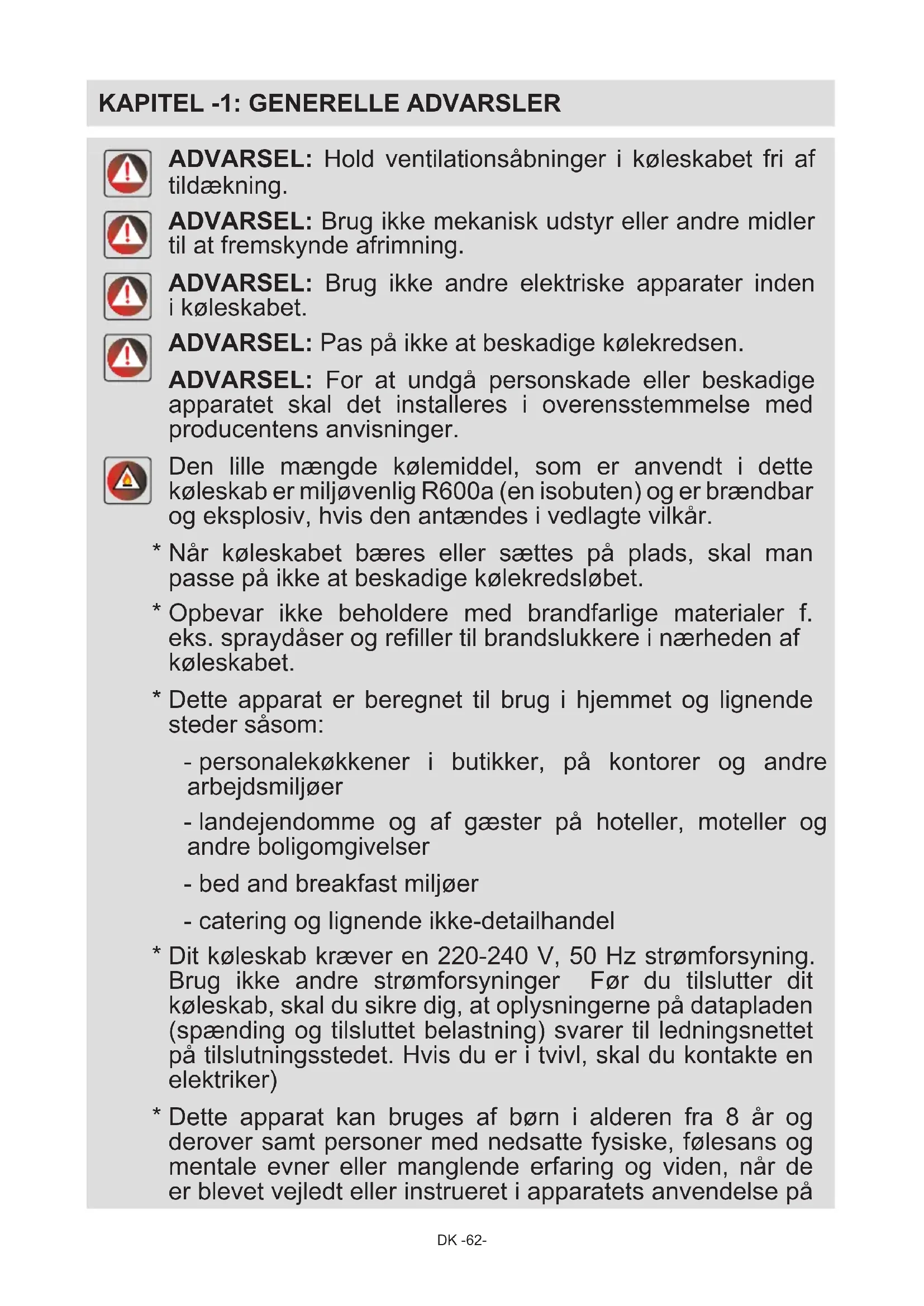 ADVARSEL: Hold ventilationsåbninger i køleskabet fri af tildækning. ADVARSEL: Brug ikke mekanisk udstyr eller andre midler til at fremskynde afrimning. ADVARSEL: Brug ikke andre elektriske apparater inden i køleskabet. ADVARSEL: Pas på ikke at beskadige kølekredsen. ADVARSEL: For at undgå personskade eller beskadige apparatet skal det installeres i overensstemmelse med producentens anvisninger. Den lille mængde kølemiddel, som er anvendt i dette køleskab er miljøvenlig R600a (en isobuten) og er brændbar og eksplosiv, hvis den antændes i vedlagte vilkår.