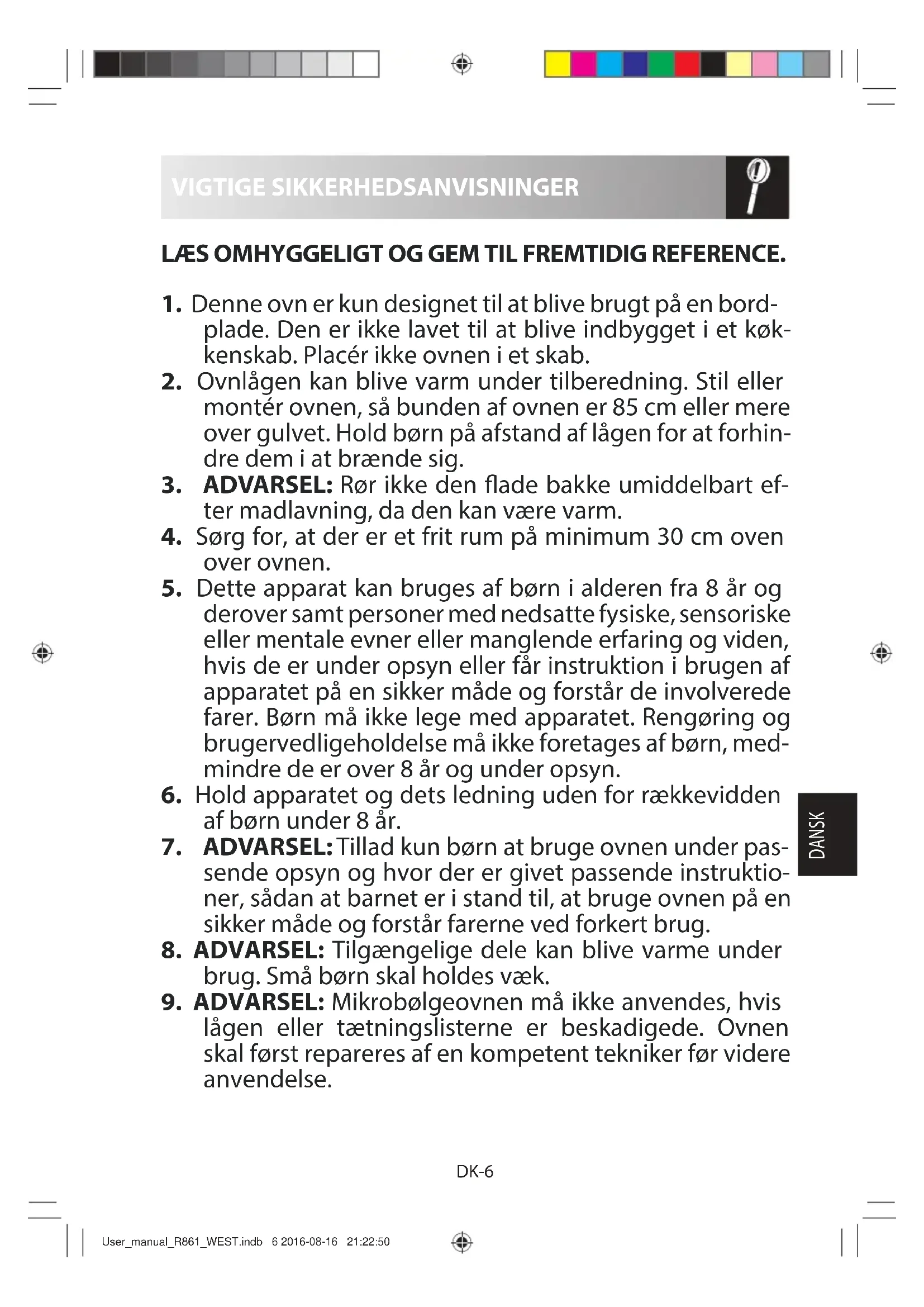 lågen eller tætningslisterne er beskadigede. Ovnen skal først repareres af en kompetent tekniker før videre anvendelse. User_manual_R861_WEST.indb 6 2016-08-16 21:22:50DK-7 VIGTIGE SIKKERHEDSANVISNINGER