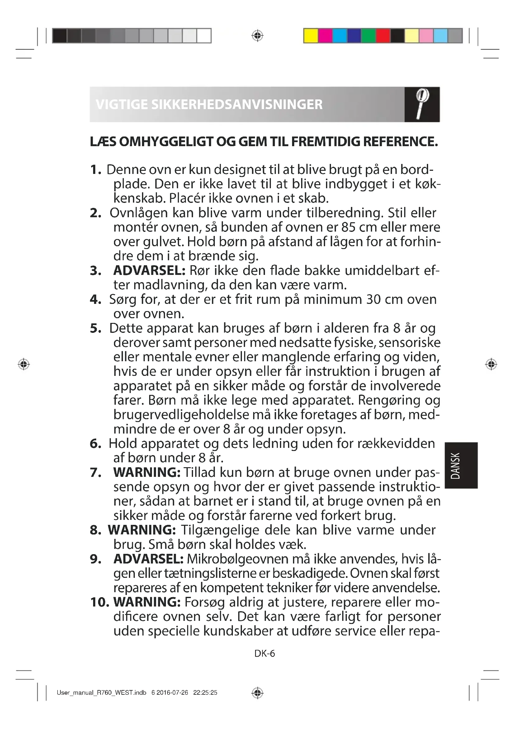 slukkes for kontakten eller stikket skal tages ud. Lad lå- gen være lukket for at kvæle evt. ammer. User_manual_R760_WEST.indb 7 2016-07-26 22:25:25DK-8 DANSK VIGTIGE SIKKERHEDSANVISNINGER