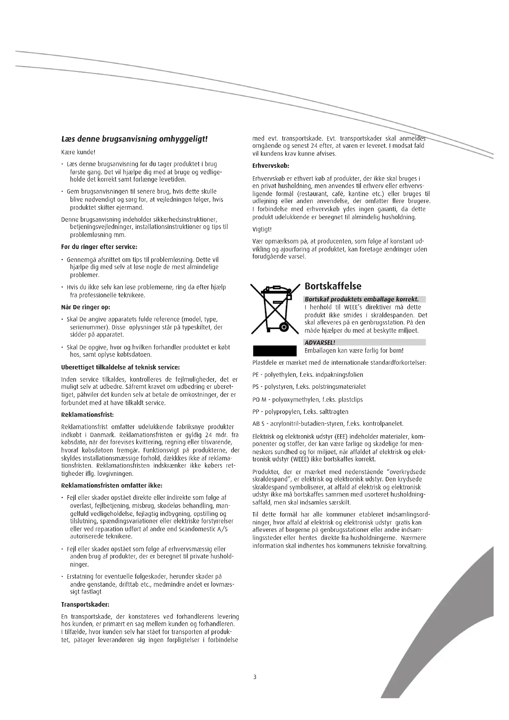 - Skal De opgive, hvor og hvilken forhandler produktet er købt hos, samt oplyse købtsdatoen. Uberettiget tilkaldelse af teknisk service: Inden service tilkaldes, kontrolleres de fejlmuligheder, det er muligt selv at udbedre. Såfremt kravet om udbedring er uberet- tiget, påhviler det kunden selv at betale de omkostninger, der er forbundet med at have tilkaldt service. Reklamationsfrist: Reklamationsfrist omfatter udelukkende fabriksnye produkter indkøbt i Danmark. Reklamationsfristen er gyldig 24 mdr. fra købsdato, når der forevises kvittering, regning eller tilsvarende, hvoraf købsdatoen fremgår. Funktionsvigt på produkterne, der skyldes installationsmæssige forhold, dækkkes ikke af reklama- tionsfristen. Reklamationsfristen indskrænker ikke købers ret- tigheder ig. lovgivningen. Reklamationsfristen omfatter ikke: